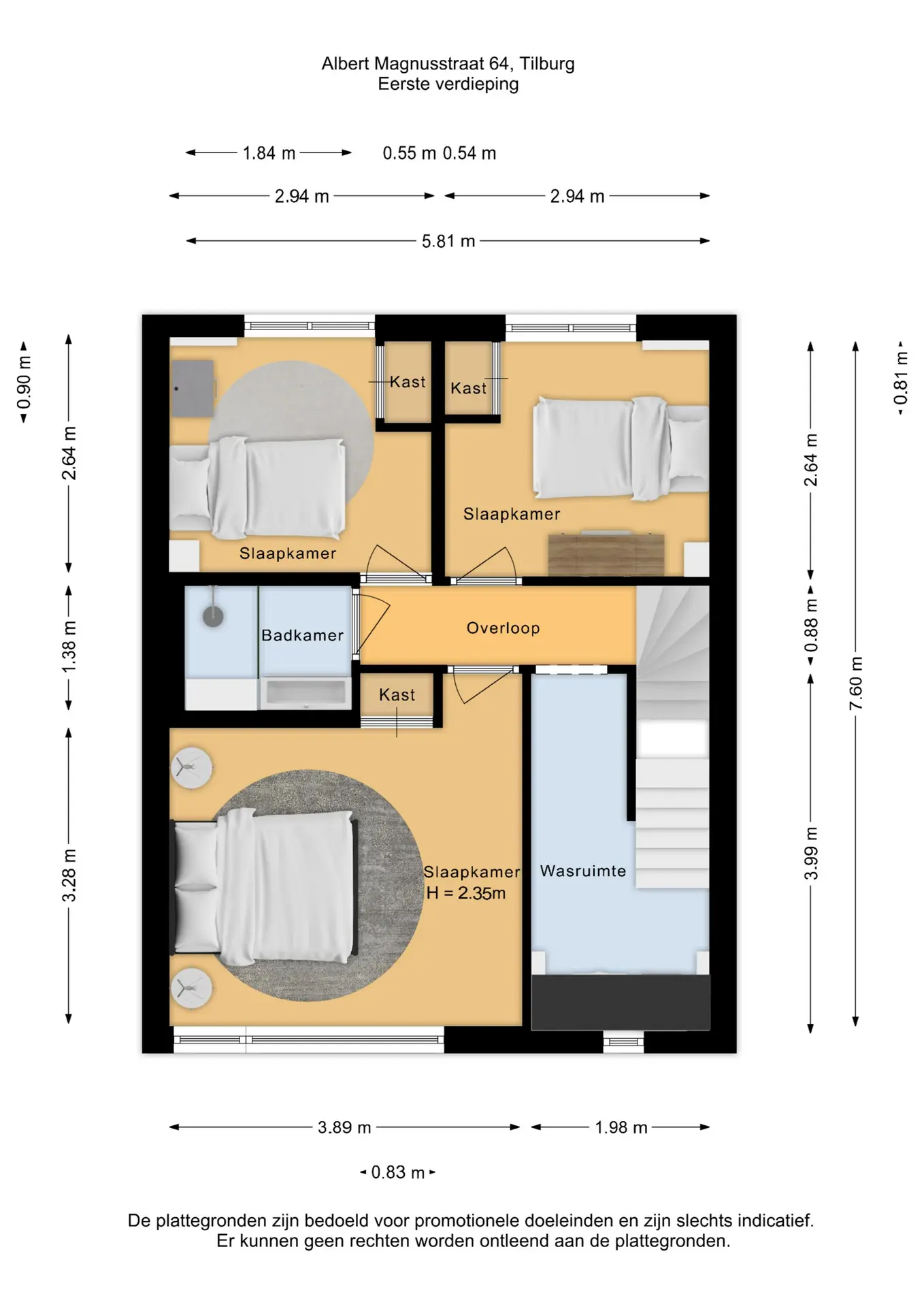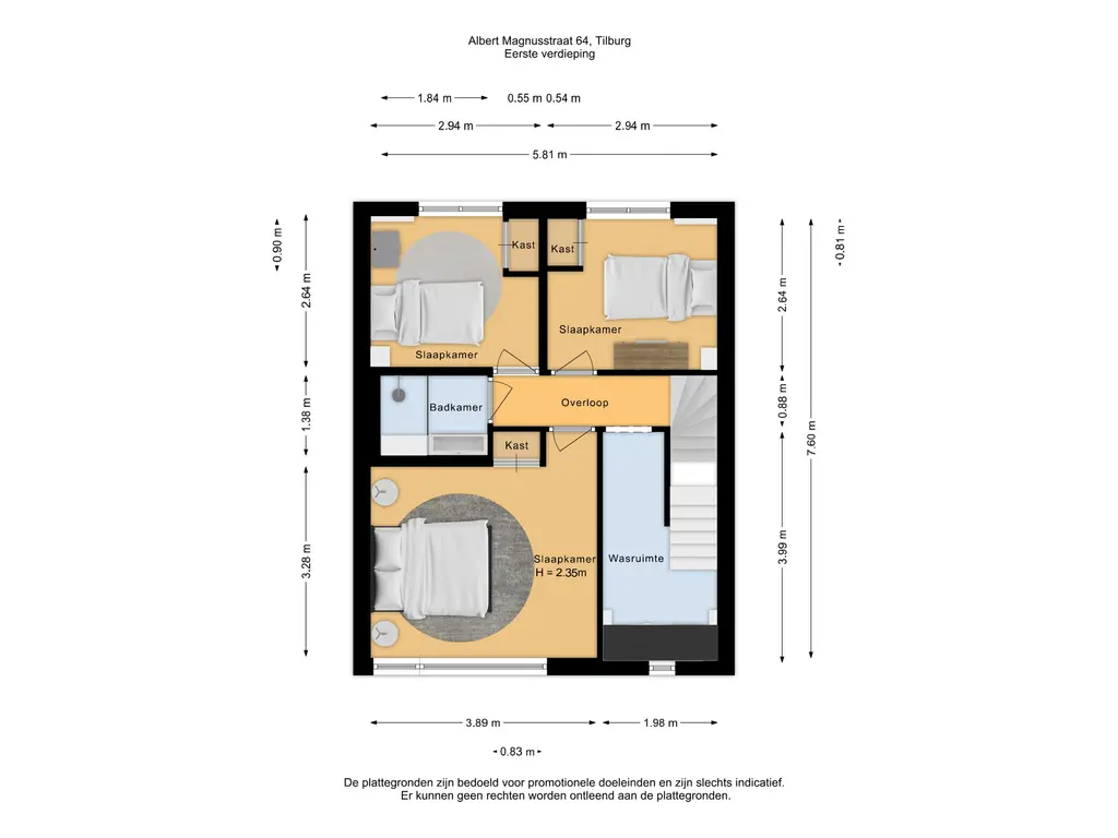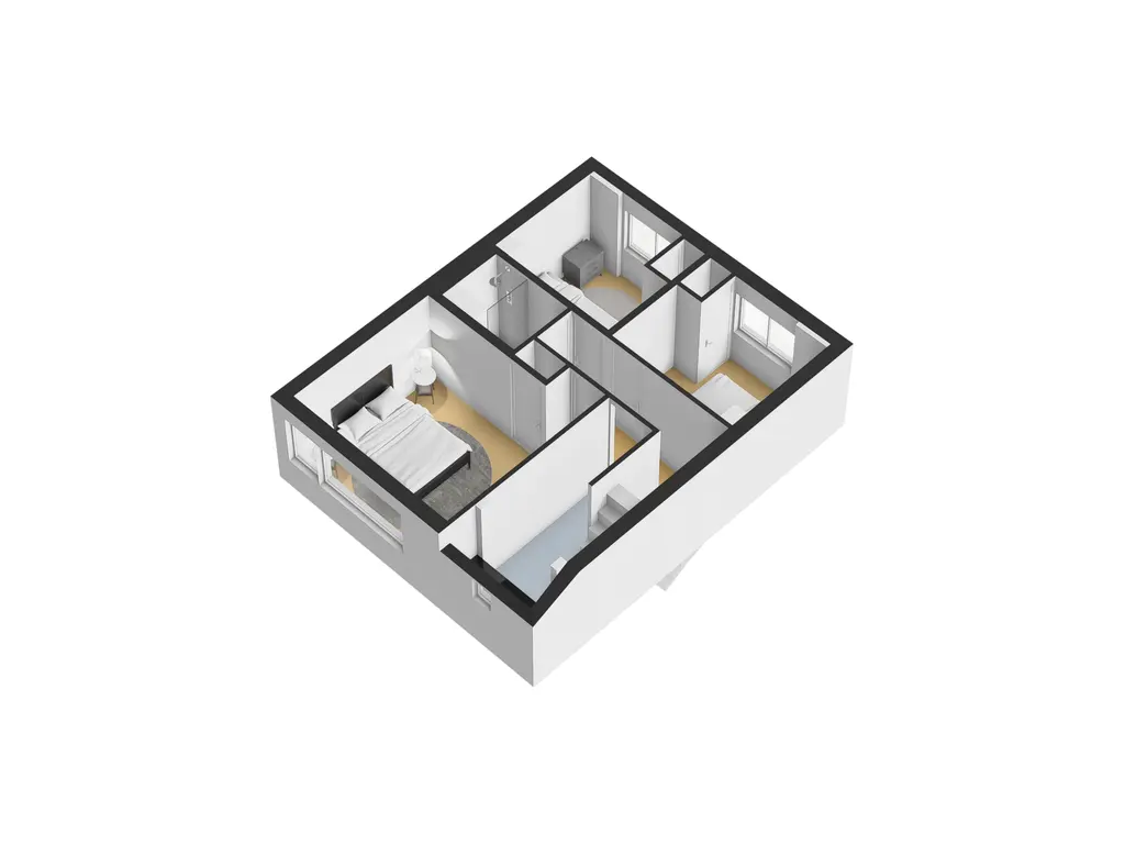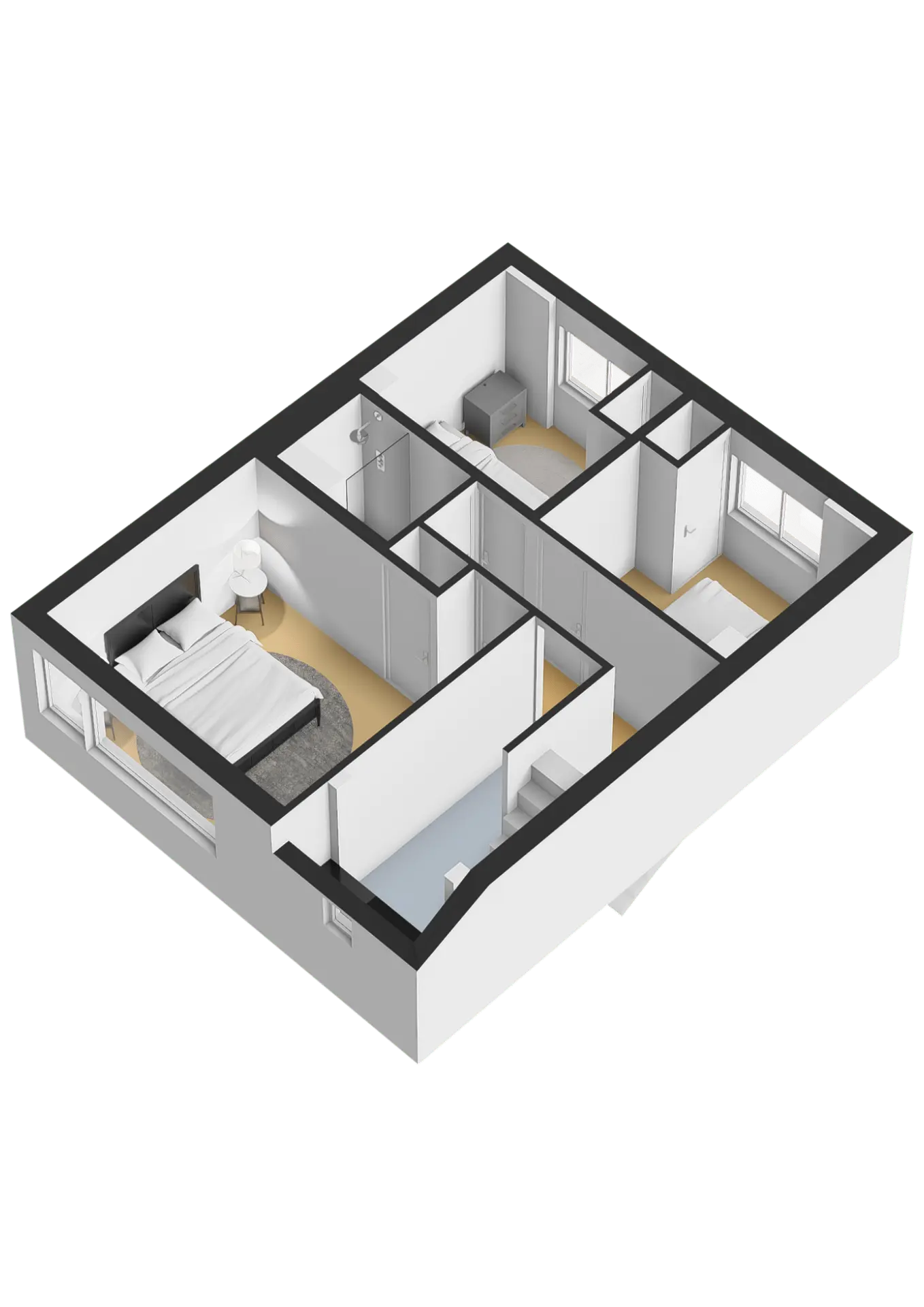 Royale overloop met toegang tot drie slaapkamers, de badkamer, washoek en trapopgang naar de 2e verdieping. Comfortabele slaapkamers van ca. 8m² (2x) en de grote "ouder" slaapkamer van bijna 13m². De wanden zijn gestukadoord en de vloeren zijn voorzien van laminaat. De badkamer is dit jaar (2025) vernieuwd; compleet betegeld en voorzien van een douchecabine en een wastafel met meubelombouw.
