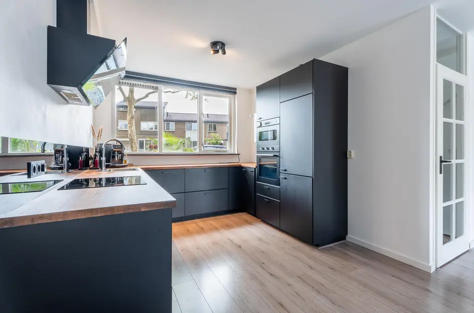 Aan de voorzijde van de woning is de luxe keuken met een royaal aanrechtblad. De keuken is van alle gemakken voorzien, waaronder: een vaatwasser, een inductie kookplaat, koelkast, vriezer, magnetron en een oven.