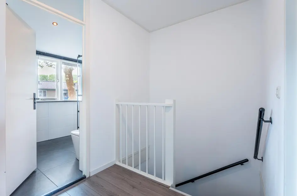 Via de entree kom je in de hal van de woning. De moderne toiletruimte is geheel betegeld en voorzien van een staand toilet met fonteintje. De meterkast heeft 7 groepen met 2 aardlekschakelaars. De wanden en het plafond zijn afgewerkt met strak stucwerk.