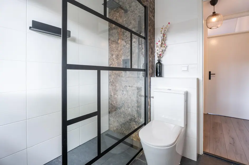 De moderne badkamer is voorzien van een fraaie inloopdouche, met inbouw regendouche, een tweede toilet en een wastafel.