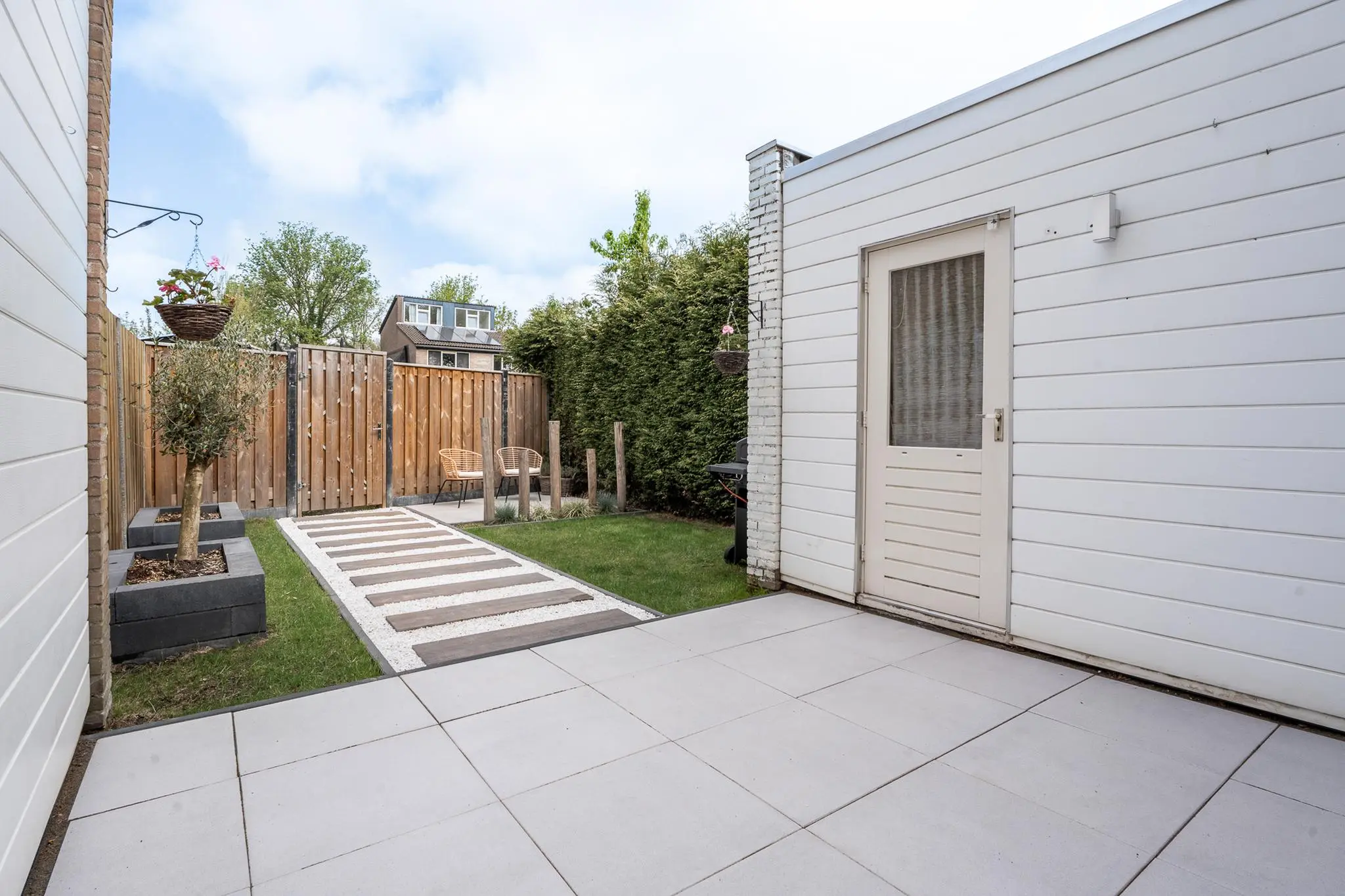 De woning heeft een voortuin en een achtertuin. De tuinen zijn recent geheel opnieuw aangelegd met diverse terrassen, plantenborders en een gazon. Een heerlijke plek om te verblijven. Via de westkant is er altijd een zonnig plekje te vinden in de tuin. Aan de achterzijde van de woning vind je eveneens de berging.