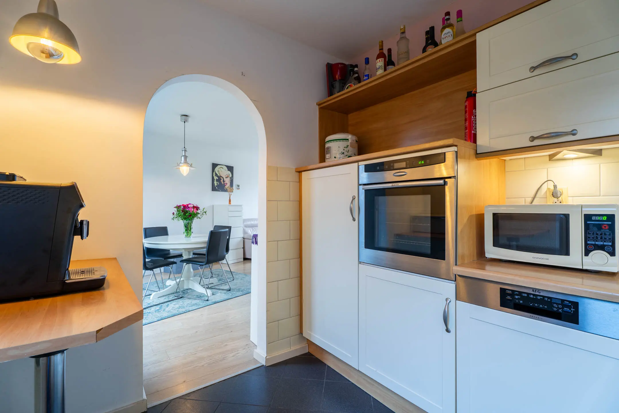 De keuken is in een royale hoekopstelling geplaatst en voorzien van inbouwapparatuur: kookplaat, afzuigkap, combi-oven en vaatwasser. De korflades, de inbouwapparatuur en volop kastruimte maken de keuken compleet.