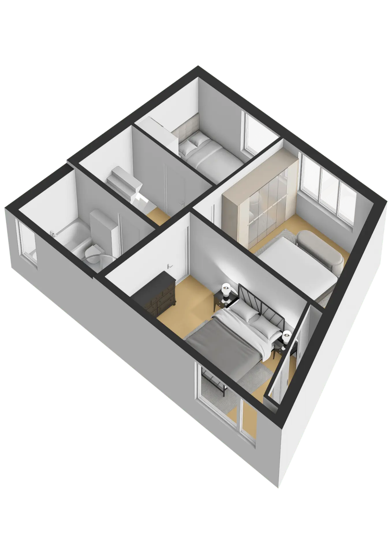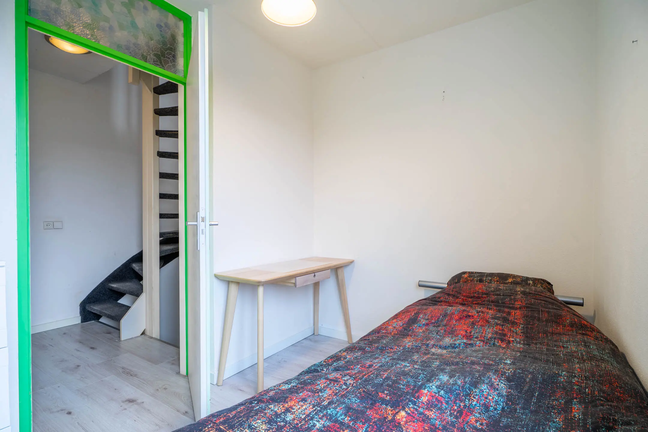 Overloop met toegang tot 3 slaapkamers en de badkamer. De badkamer is gelegen aan de voorzijde van de woning en compleet uitgevoerd: ligbad, douchecabine, 2e toilet en wastafel met meubel ombouw. De slaapkamers zijn plezierig ruim, ca. 7, 12 en maar liefst 14m². Alle voorzien van een laminaatvloer en geschilderde wandafwerking.