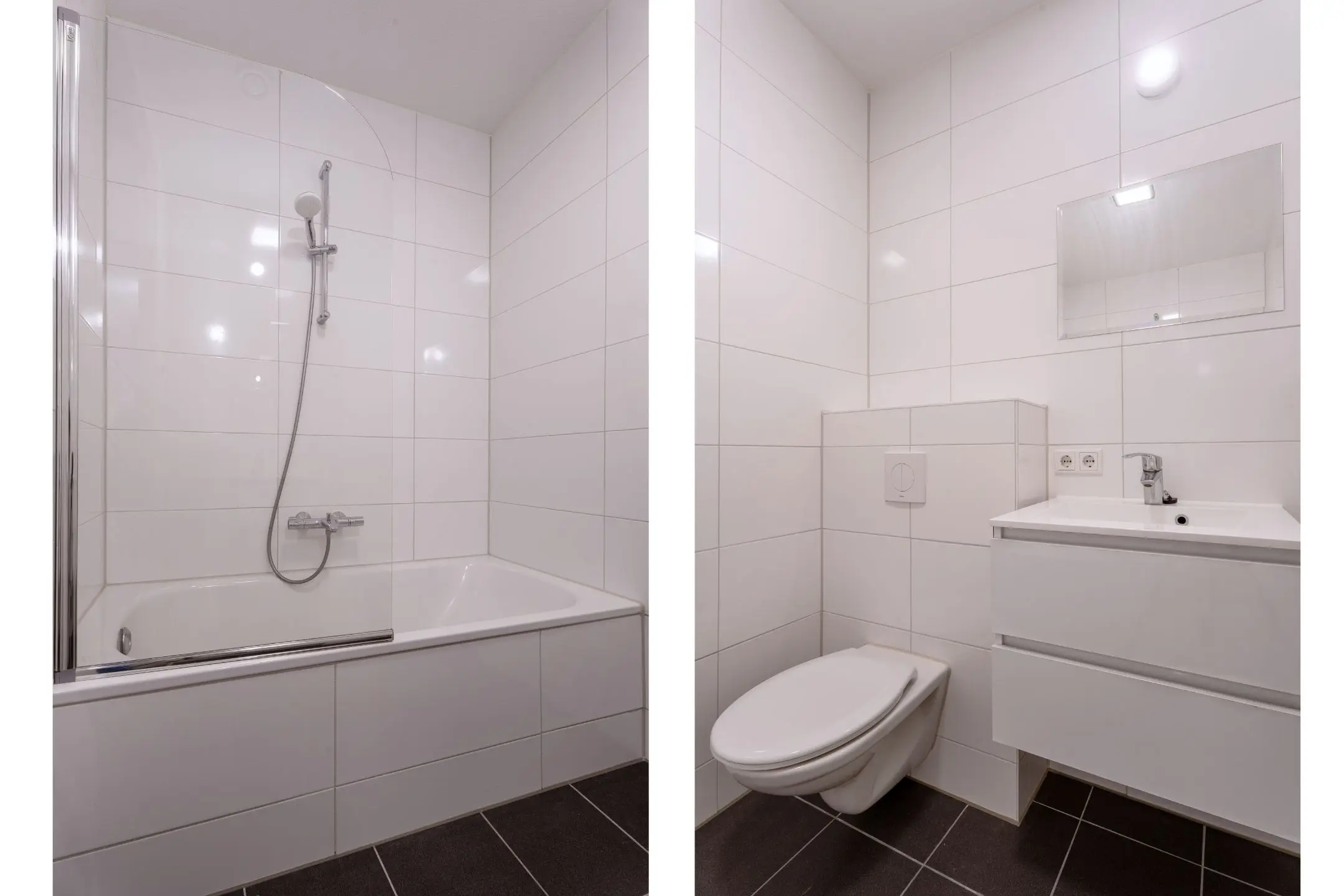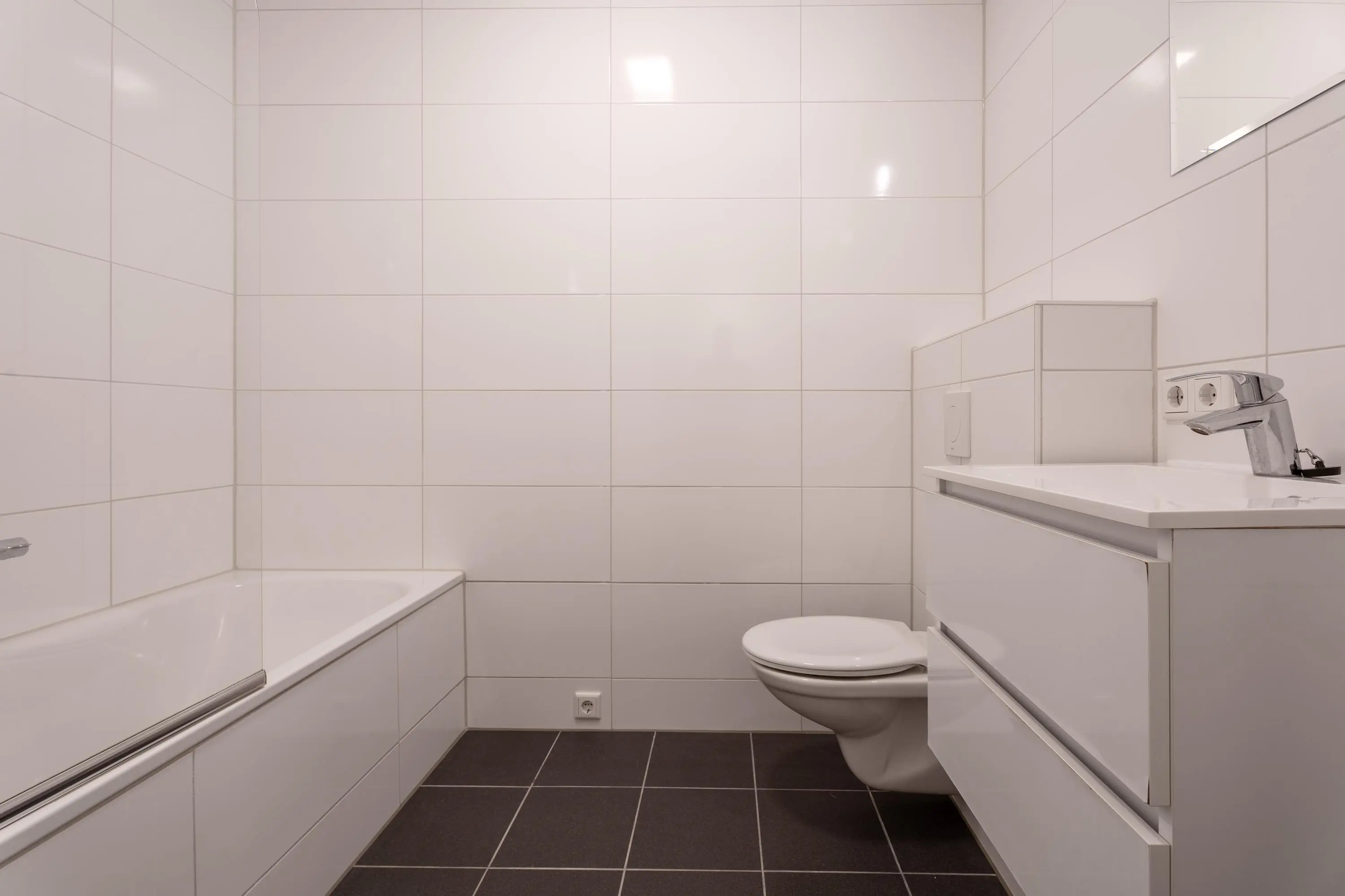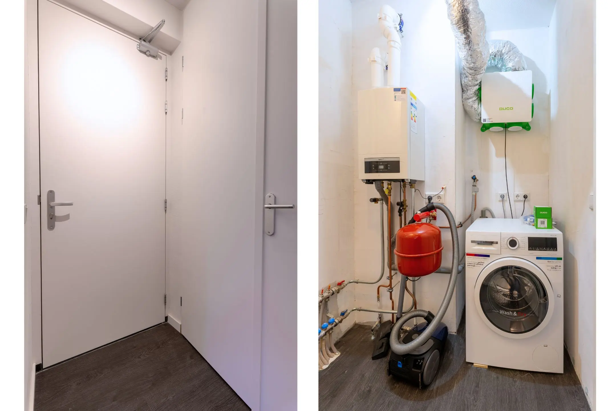 Direct bij binnenkomst valt de hoeveelheid licht en het hoge plafonds van de woning je op. We beginnen bij de entree, links bevindt zich een berg-/wasruimte. Hier is de cv-ketel geplaatst en is er opstelling van de wasmachine, ventilatie en volop bergruimte voor opslag. Rechtdoor tref je de modern ingerichte ruime badkamer, deze is volledig is betegeld en voorzien van een ligbad-douchecombinatie, een wastafel met meubel en een zwevend uitgevoerd toilet.