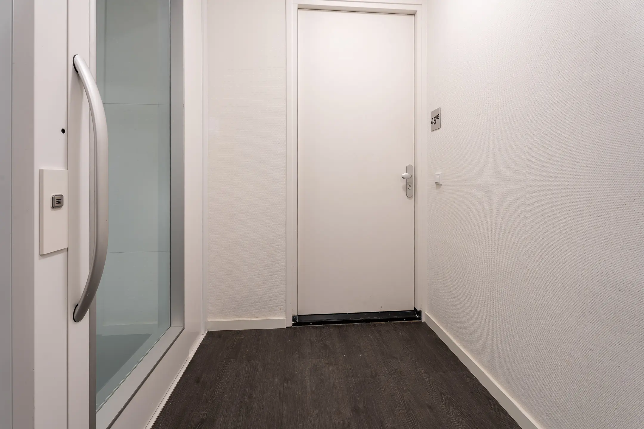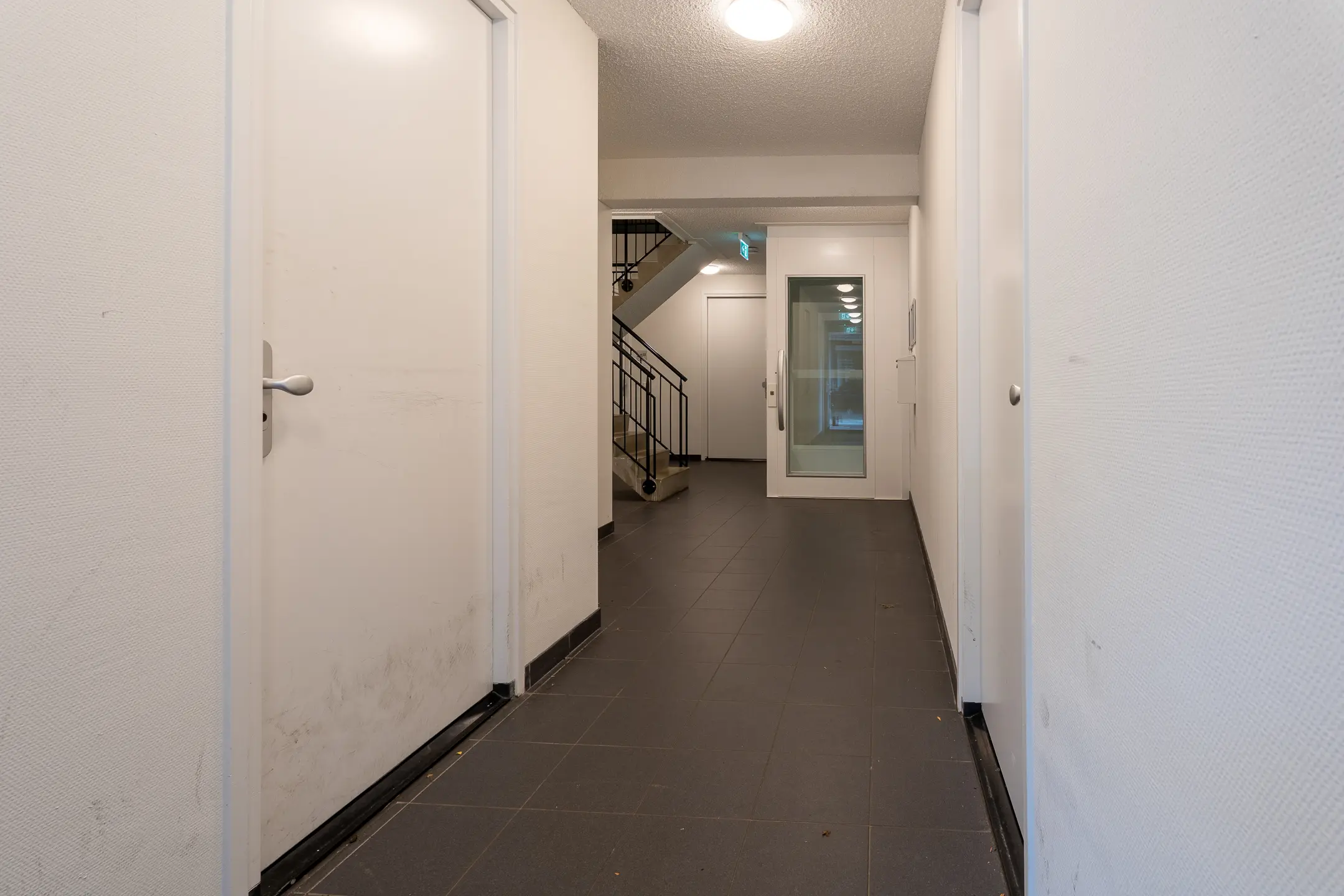 Entree op de begane grond, waar zich tevens de brievenbussen en het bellen-videophone tableau bevinden. Het trappenhuis brengt je naar de verdieping waar de studio is gelegen. Verhuizen is praktisch middels de aanwezige goederenlift (deze studio is ingericht dus geen gesjouw). Je fiets kan stallen in een van de twee gemeenschappelijke ruimtes.