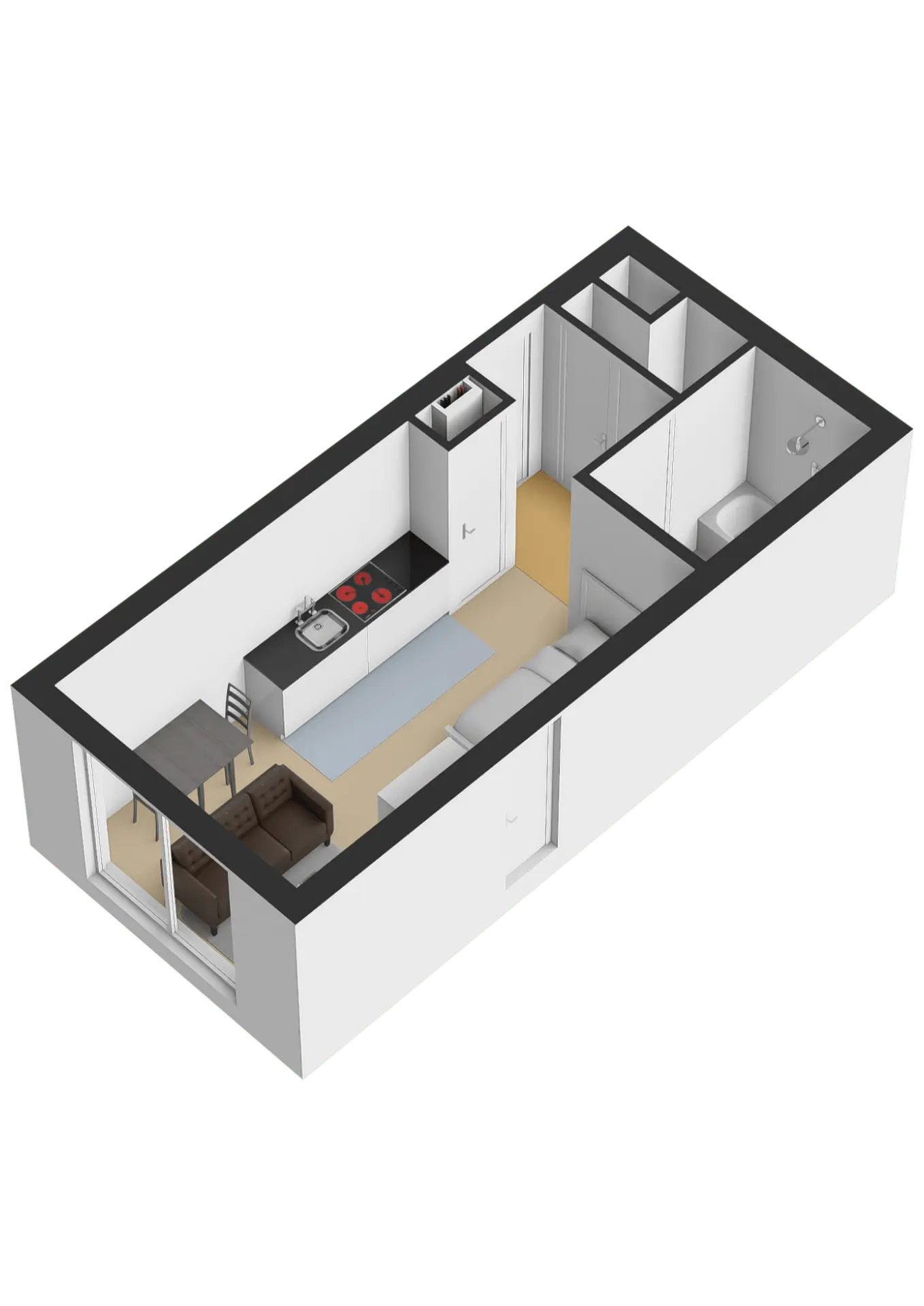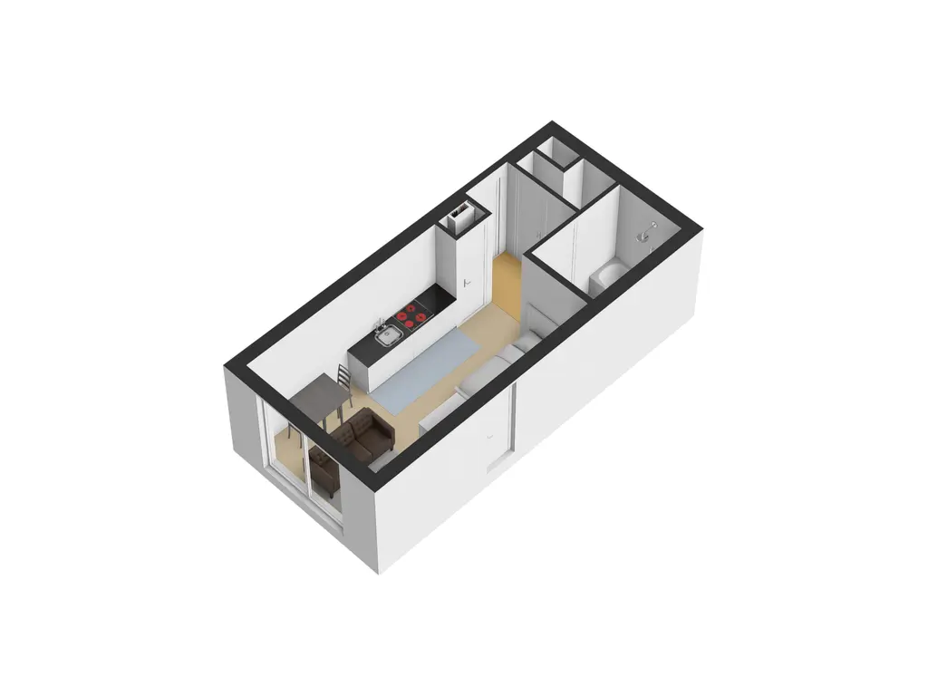 Door naar de keuken, wonen en het slapen. De moderne keuken voorzien van alle gemakken zoals koelkast, inductie koken, spoelbak met mengkraan, een combimagnetron en een vaatwasser. Daarnaast zijn er volop boven- en onderkastjes voor de nodige opbergruimte. Het woon-/slaapgedeelte is van goed formaat en heerlijk licht door aanwezigheid van de diverse raampartijen. Strakke wandafwerking in combinatie met de mooie pvc-vloer maken het geheel af.