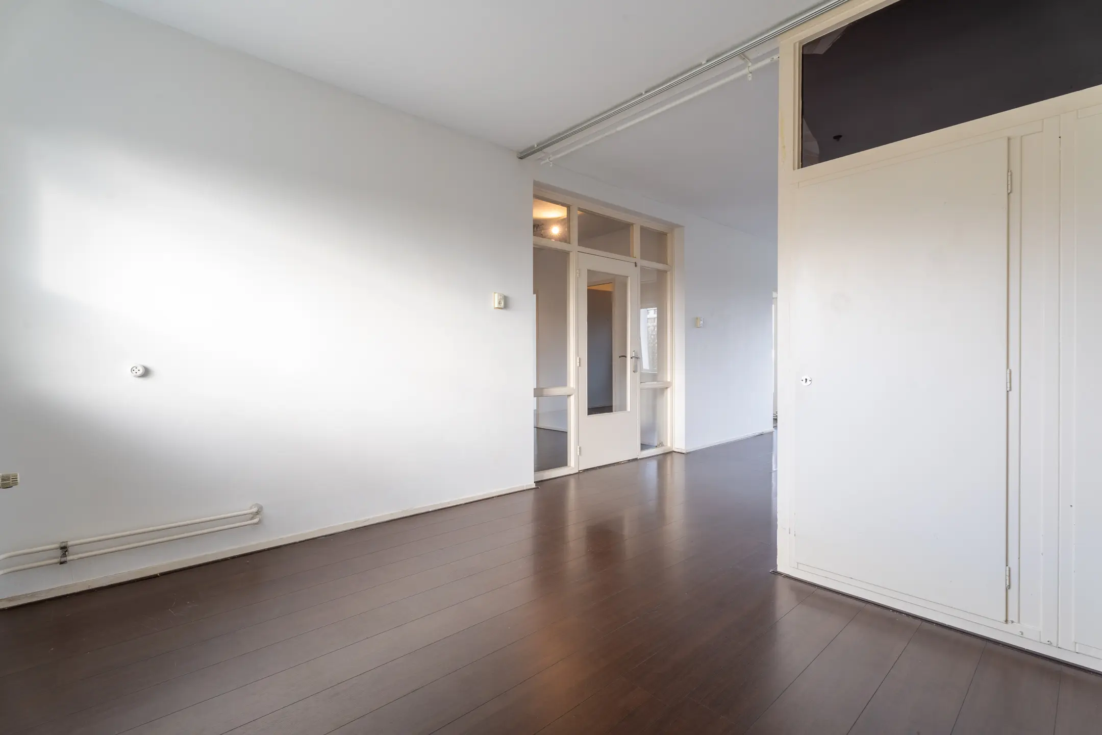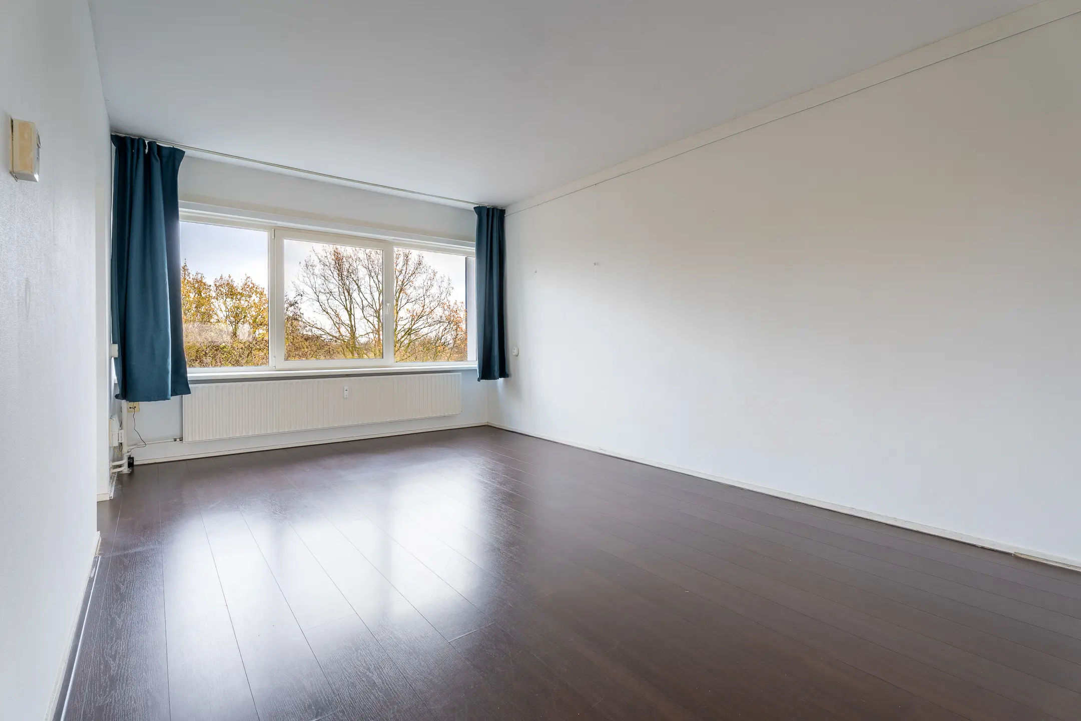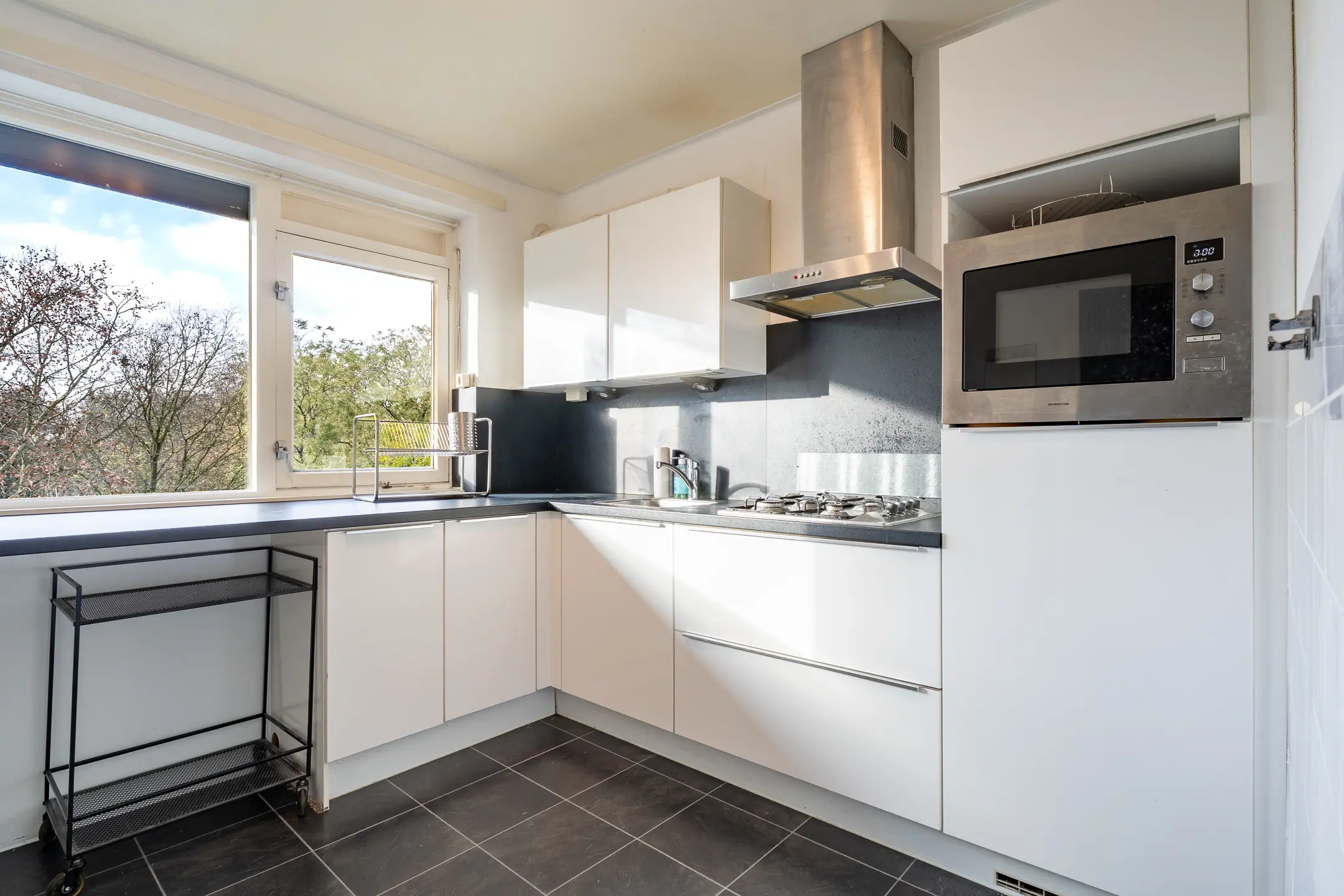De ruime woonkamer heeft een grote raampartij, laminaatvloer en geschilderde wanden. De woonkamer heeft een vaste kastenwand, die de ruimte in twee fijne kamers indeelt. De keuken heeft een keukenblok in hoekopstelling en is voorzien van volop kastruimte en inbouwapparatuur; kookplaat, afzuigkap, koelkast, combimagnetron en vaatwasmachine.