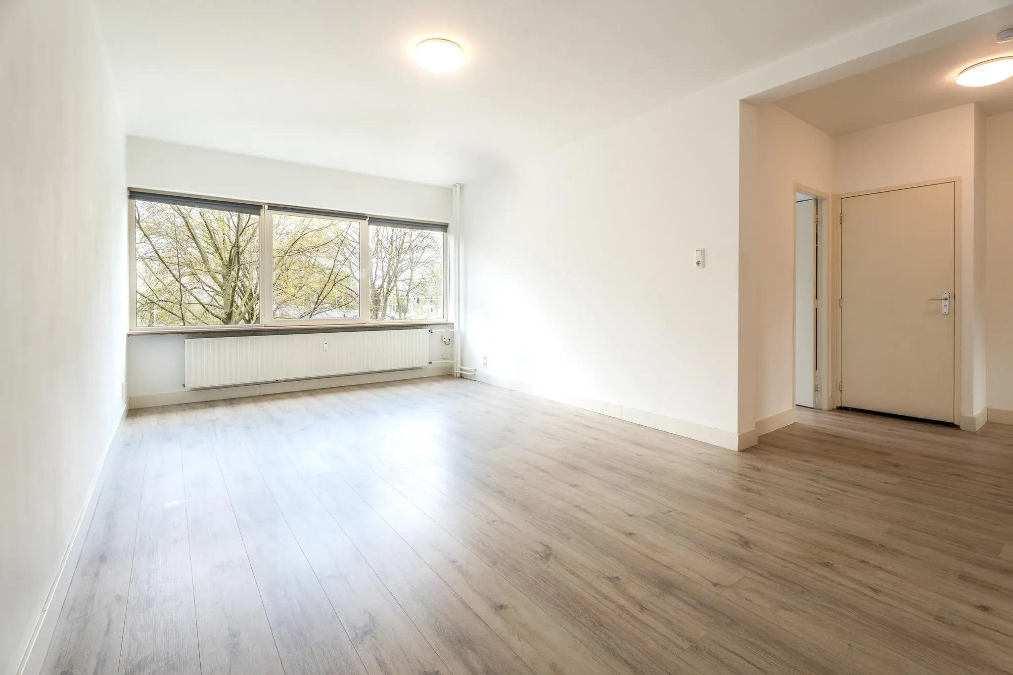 Ruime lichte woonkamer met grote raampartij, laminaatvloer, strak gestukadoorde wanden en ca. 24m² groot.