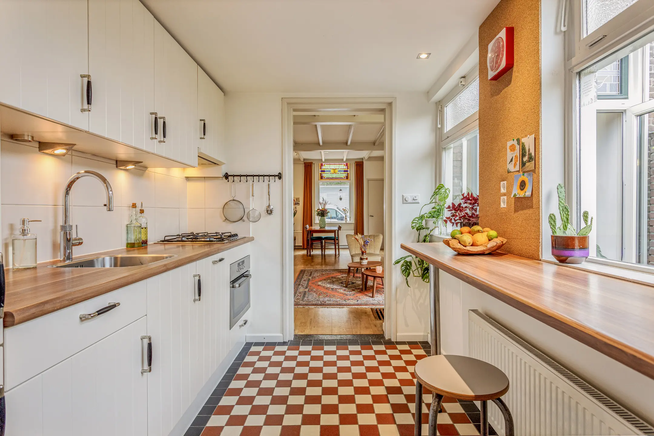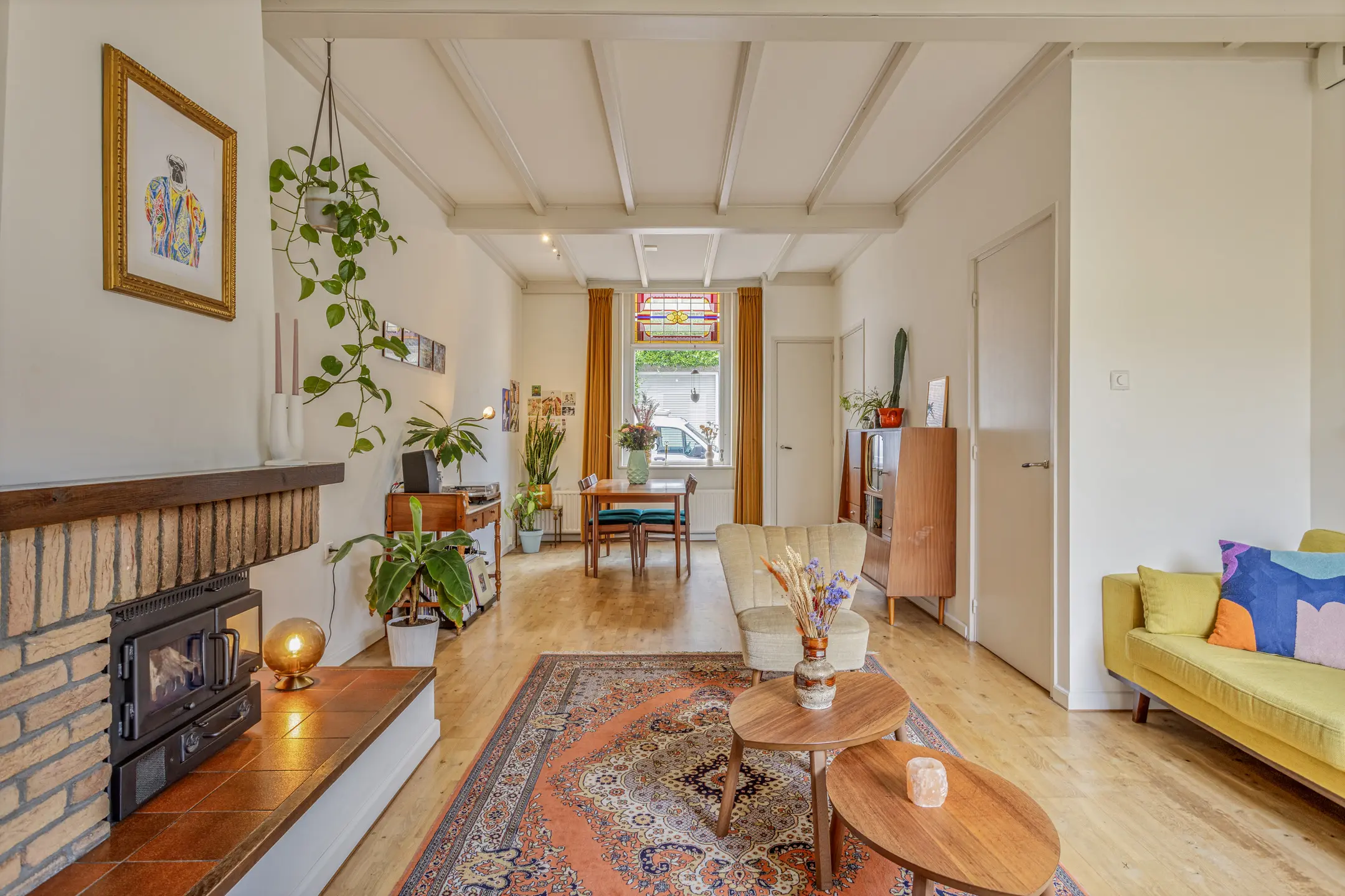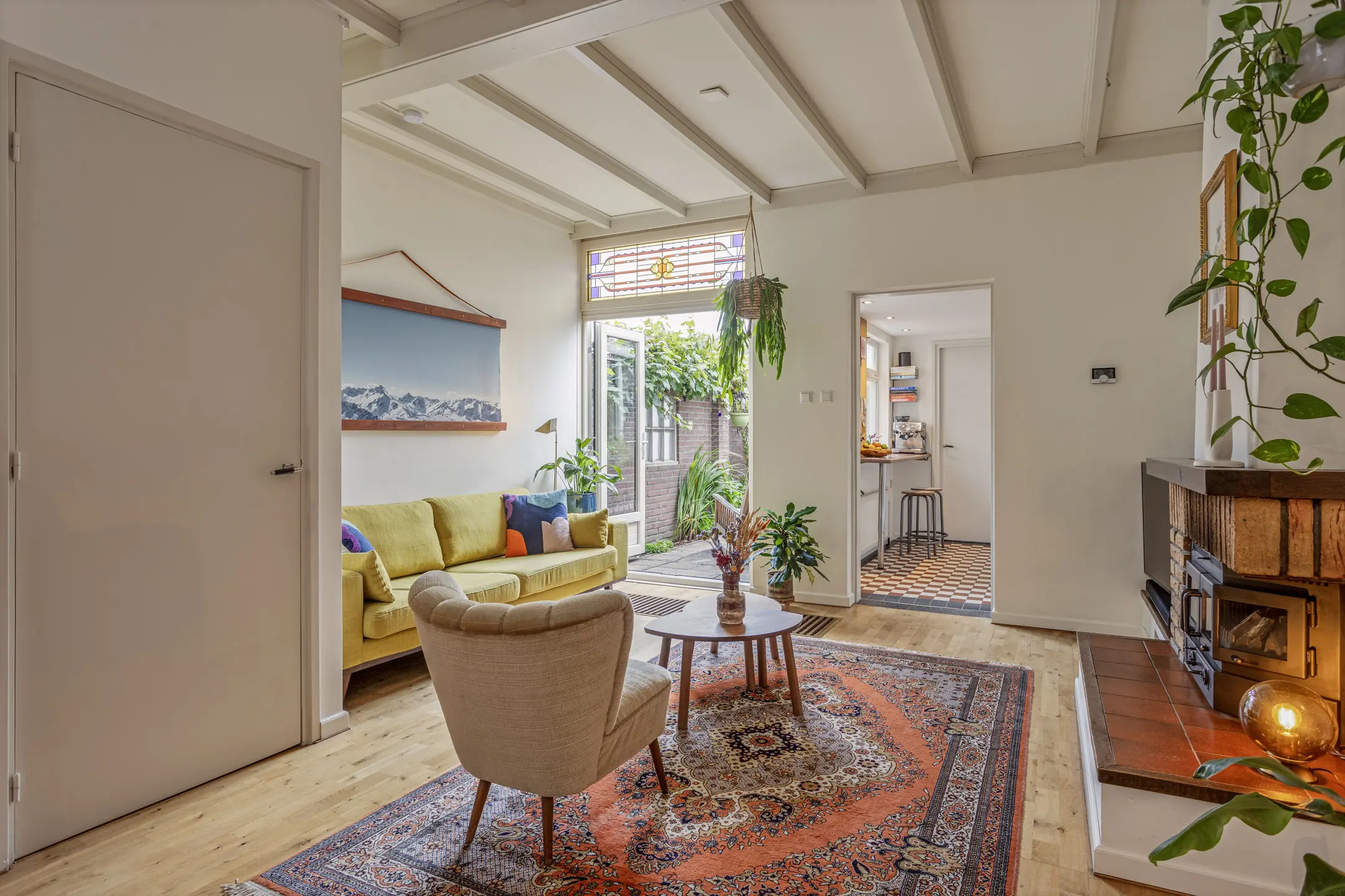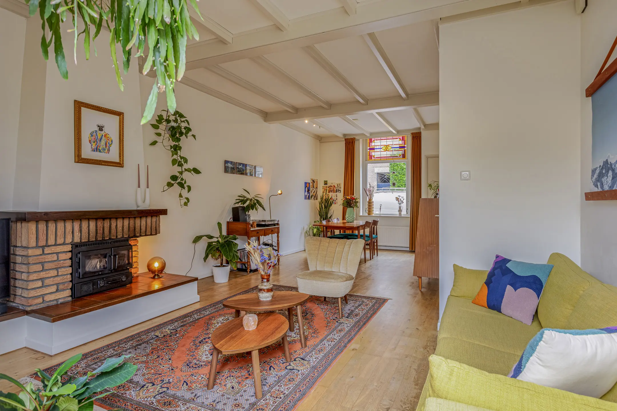 Entree, hal met trapopgang en toegang naar de woonkamer. De originele voordeur en het glas-in-lood sieren de entree. De gezellige woonkamer heeft eveneens glas-in-loodramen en is met zijn hoogte van 2.90m en vloeroppervlakte van ca. 30m² heerlijk ruim. De vloer is voorzien van lamelparket, de wanden zijn strak gestuukt, en de tuindeuren en houtkachel zorgen voor een sfeervol geheel. Aan de achterzijde van de woning bevinden zich de keuken, bijkeuken, het toilet en de badkamer. De lichte keuken is ingericht met een keukenblok in rechte opstelling en beschikt over prettig veel bergruimte. Daarnaast is er diverse inbouwapparatuur aanwezig, waaronder een gasfornuis, combi-oven, afzuigkap, koel-vriescombinatie en vaatwasmachine. Aansluitend bevindt zich de bijkeuken, met de opstelling voor de wasmachine/droger, de cv-ketel (2019) en een voorraadkast. Het separate toilet is geheel betegeld en uitgevoerd met fontein. De badkamer is eveneens geheel betegeld en voorzien van een douche, een ligbad en een wastafel. Middels de woonkamer (tuindeuren) en de bijkeuken (achterdeur) is de tuin en de garage bereikbaar.