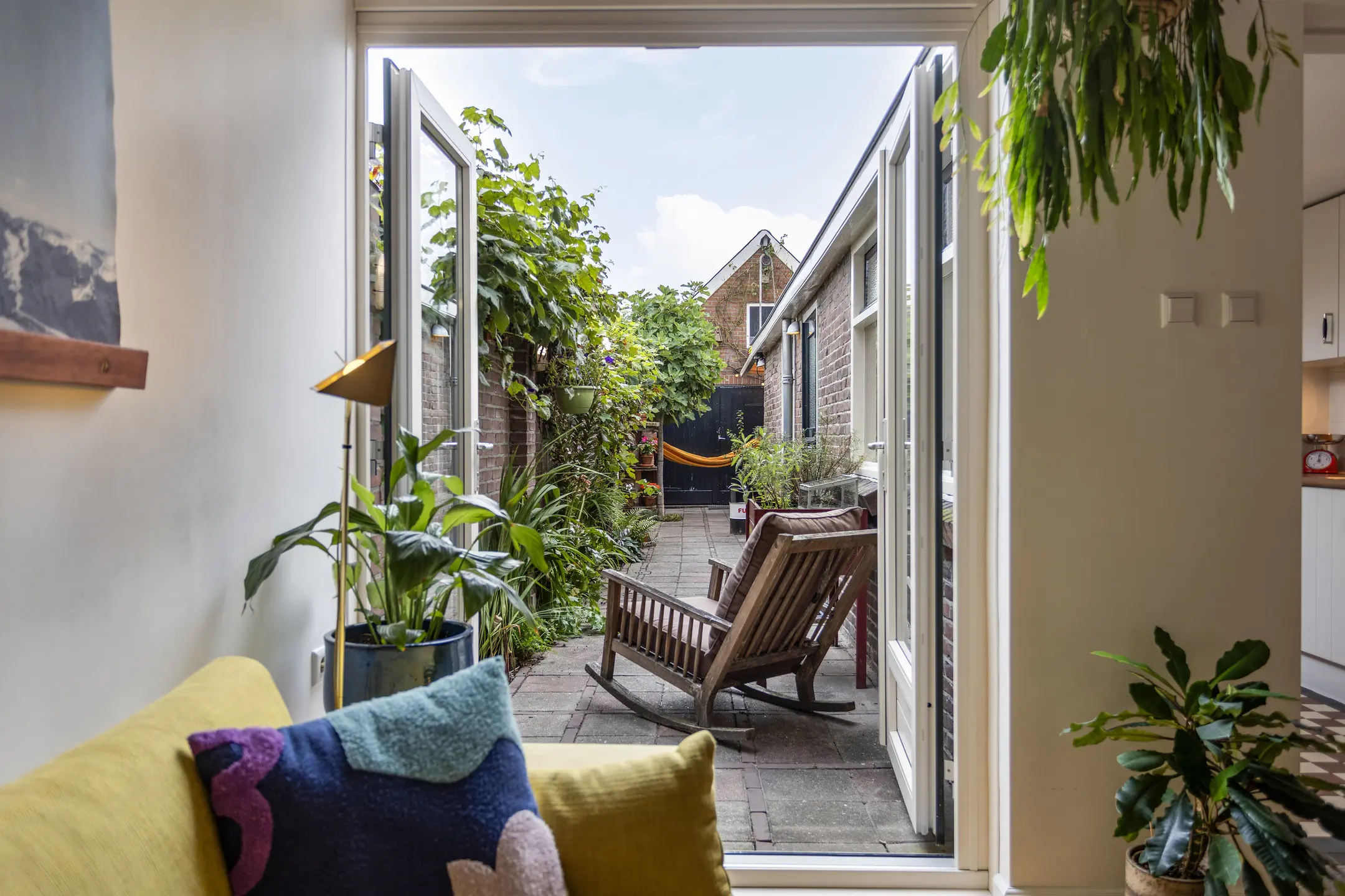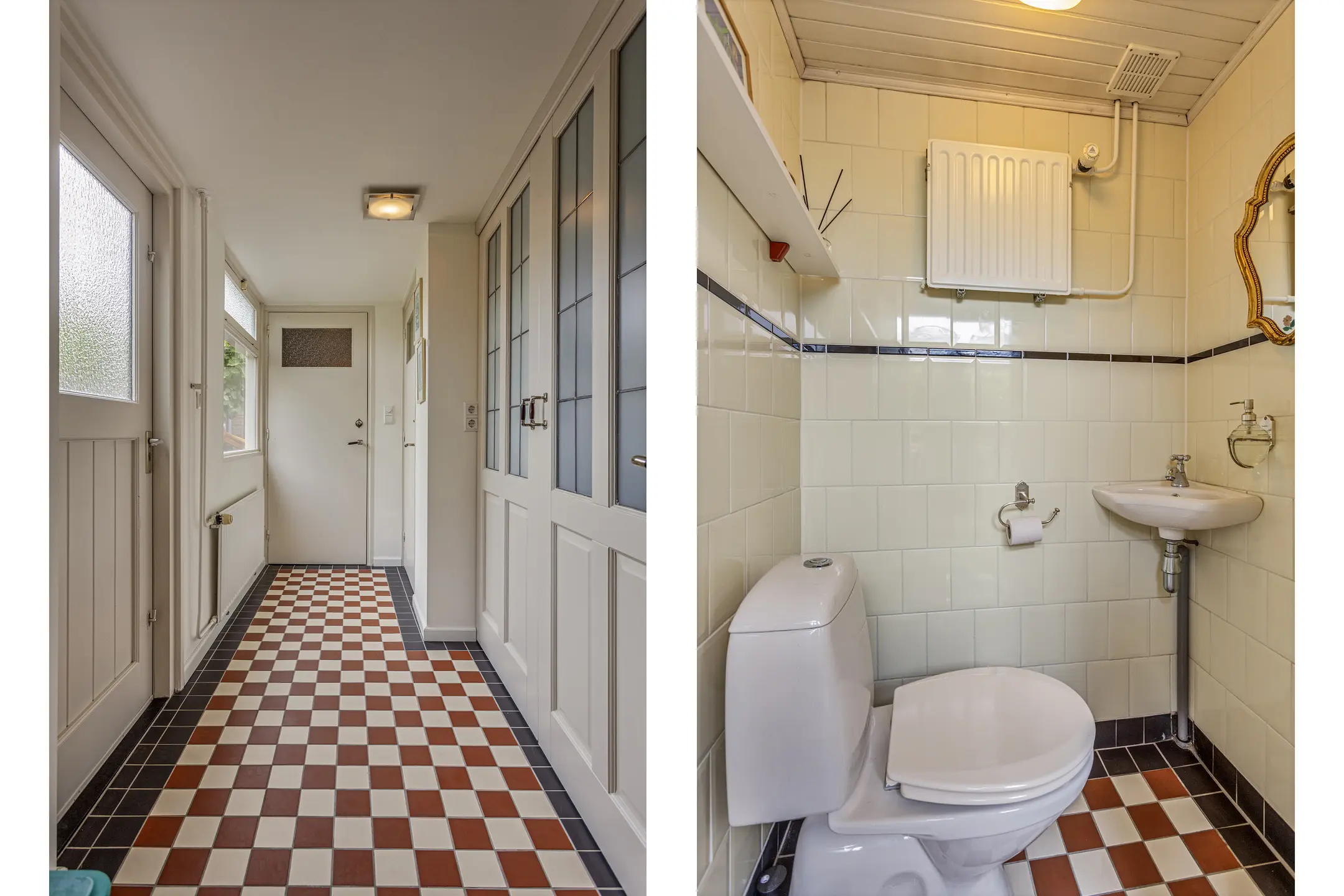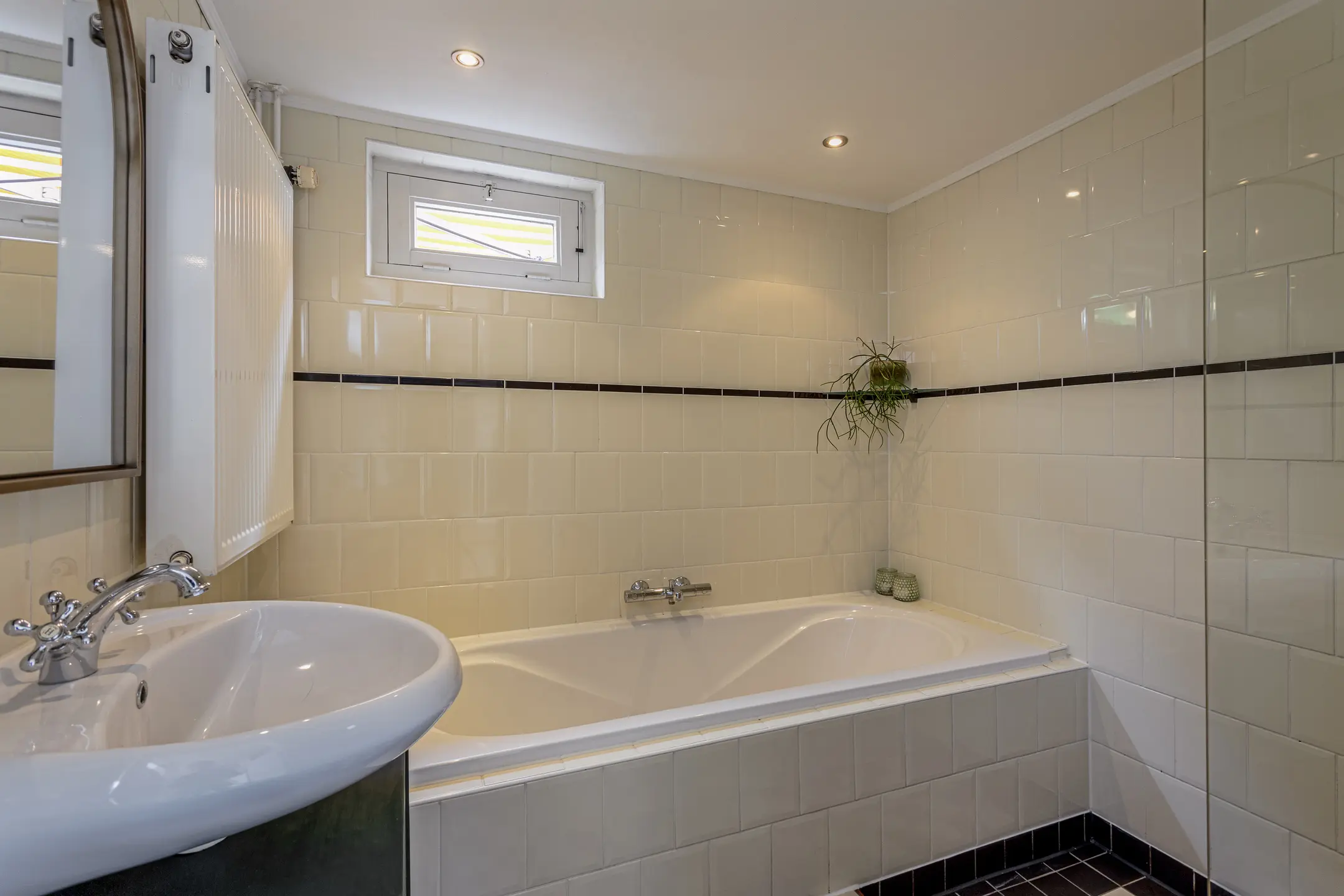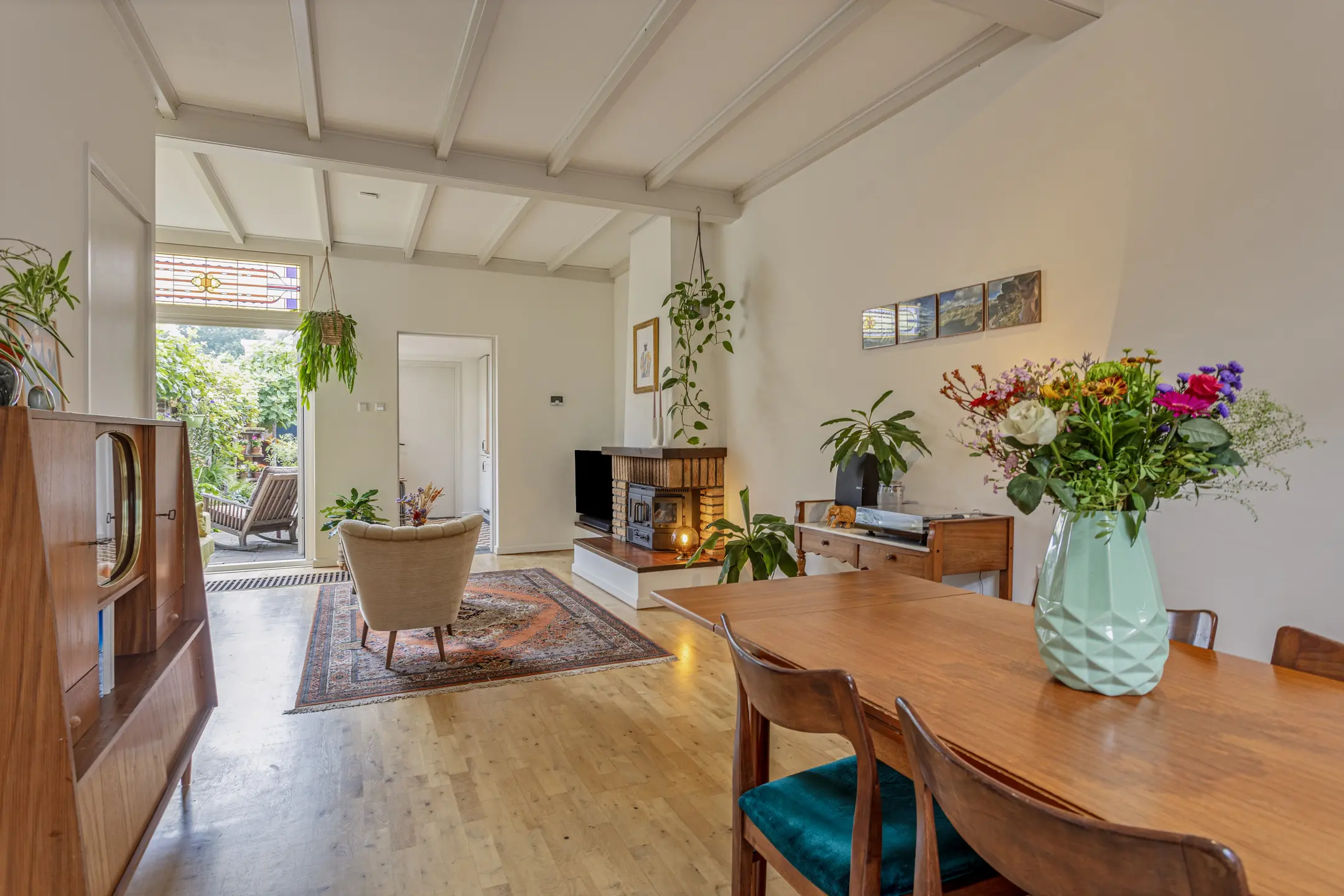 Entree, hal met trapopgang en toegang naar de woonkamer. De originele voordeur en het glas-in-lood sieren de entree. De gezellige woonkamer heeft eveneens glas-in-loodramen en is met zijn hoogte van 2.90m en vloeroppervlakte van ca. 30m² heerlijk ruim. De vloer is voorzien van lamelparket, de wanden zijn strak gestuukt, en de tuindeuren en houtkachel zorgen voor een sfeervol geheel. Aan de achterzijde van de woning bevinden zich de keuken, bijkeuken, het toilet en de badkamer. De lichte keuken is ingericht met een keukenblok in rechte opstelling en beschikt over prettig veel bergruimte. Daarnaast is er diverse inbouwapparatuur aanwezig, waaronder een gasfornuis, combi-oven, afzuigkap, koel-vriescombinatie en vaatwasmachine. Aansluitend bevindt zich de bijkeuken, met de opstelling voor de wasmachine/droger, de cv-ketel (2019) en een voorraadkast. Het separate toilet is geheel betegeld en uitgevoerd met fontein. De badkamer is eveneens geheel betegeld en voorzien van een douche, een ligbad en een wastafel. Middels de woonkamer (tuindeuren) en de bijkeuken (achterdeur) is de tuin en de garage bereikbaar.