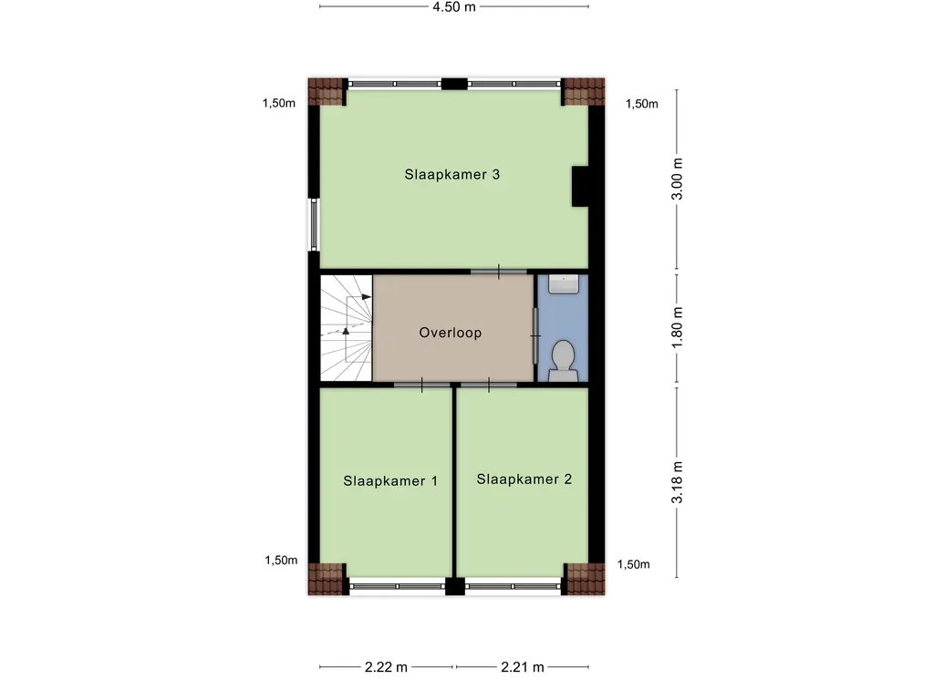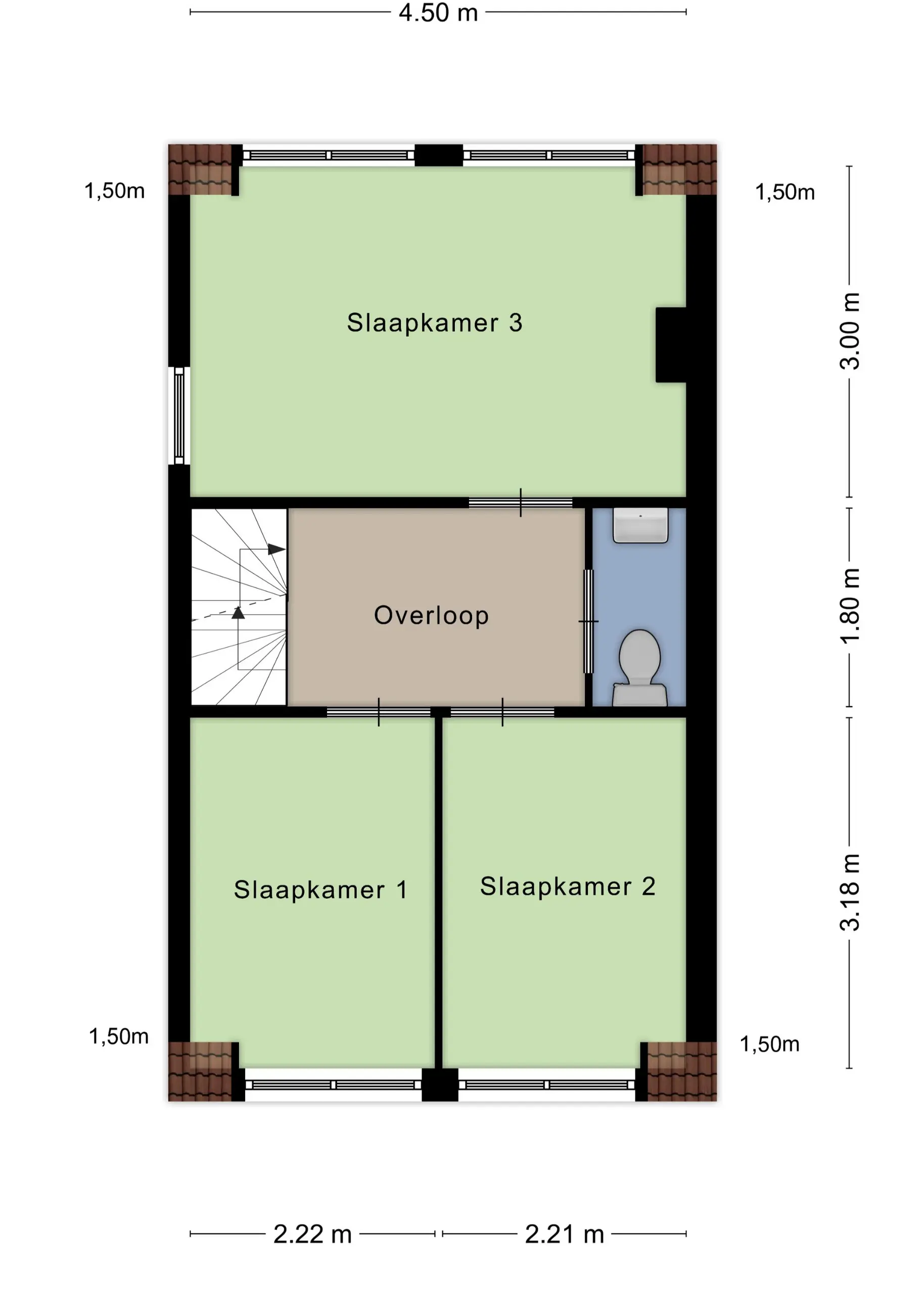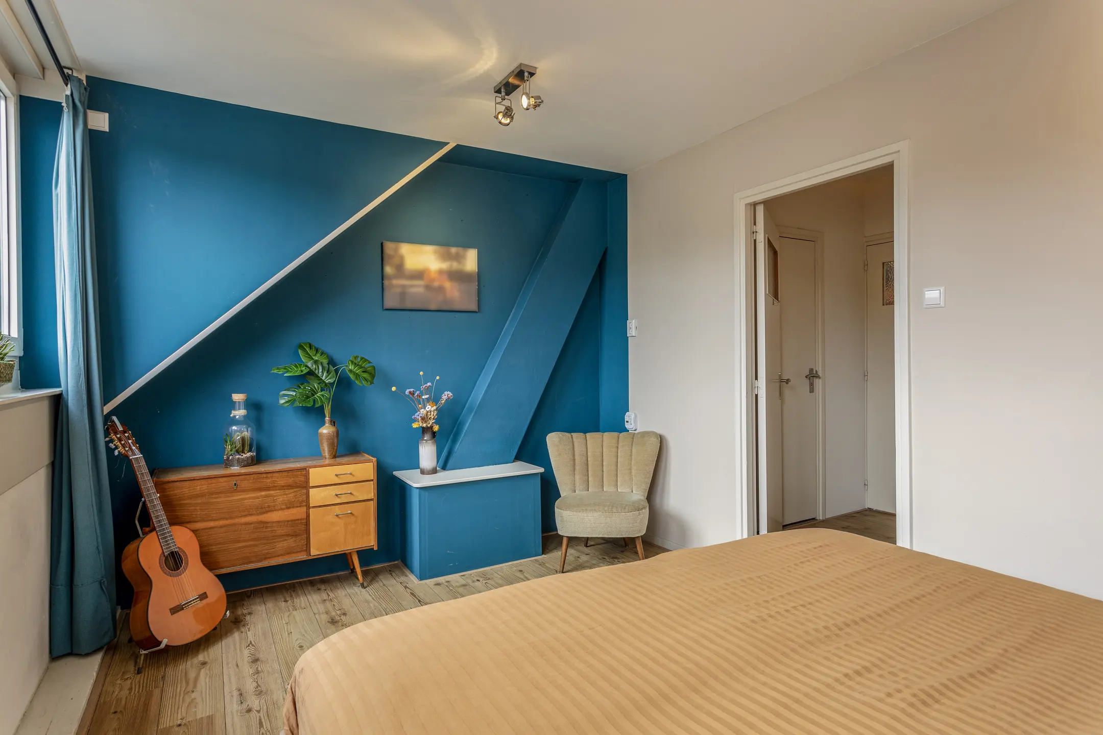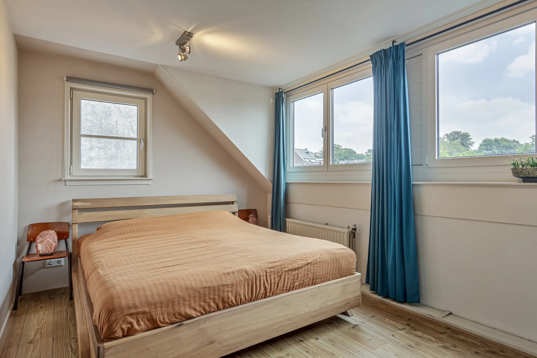 Vanuit de overloop zijn drie slaapkamers en het toilet bereikbaar. Twee slaapkamers bevinden zich aan de voorzijde en een royale, derde slaapkamer aan de achterzijde. Zowel aan de voor- als achterzijde is een dakkapel aanwezig. Het dakkapel aan de voorzijde is gerenoveerd in 2022 en aan de achterzijde is geplaatst in 2011. Beide kappelen zijn geïsoleerd, de voorzijde is in hout en dubbelglas met glas-in-lood in dubbelglas uitgevoerd en de achterzijde is in volledig kunststof met dubbelglas. Centraal op de verdieping bevindt zich een toilet met wastafel. De gehele eerste verdieping is in 2011/2012 gerenoveerd. Zo is onder andere de elektra vernieuwd, isolatie aangebracht en alles gestukadoord.