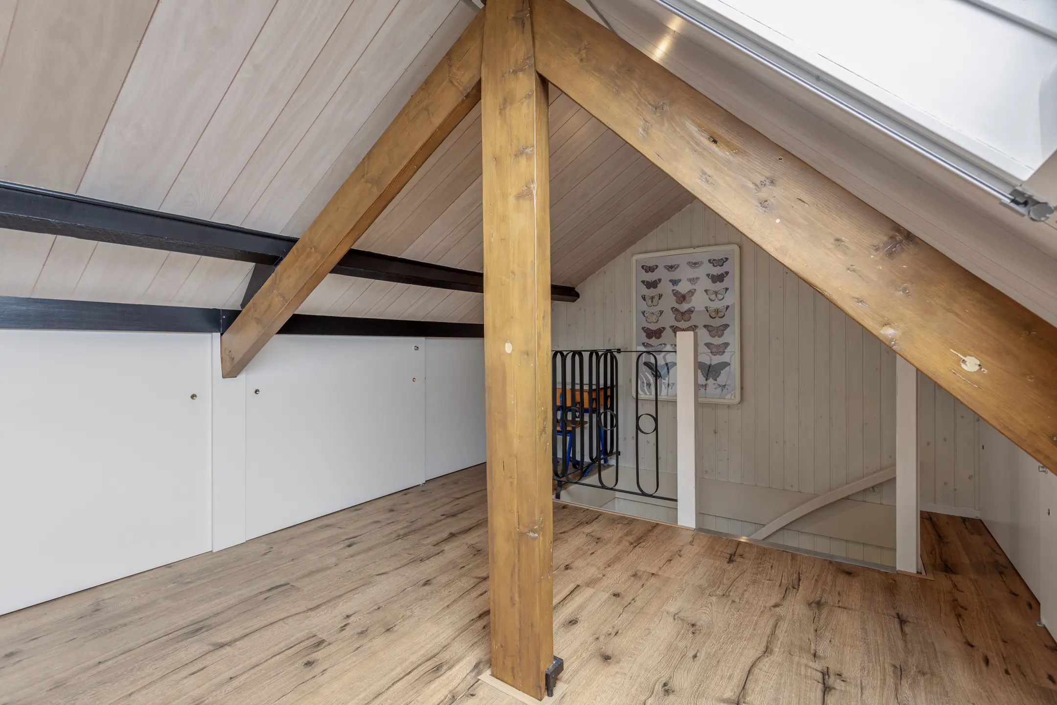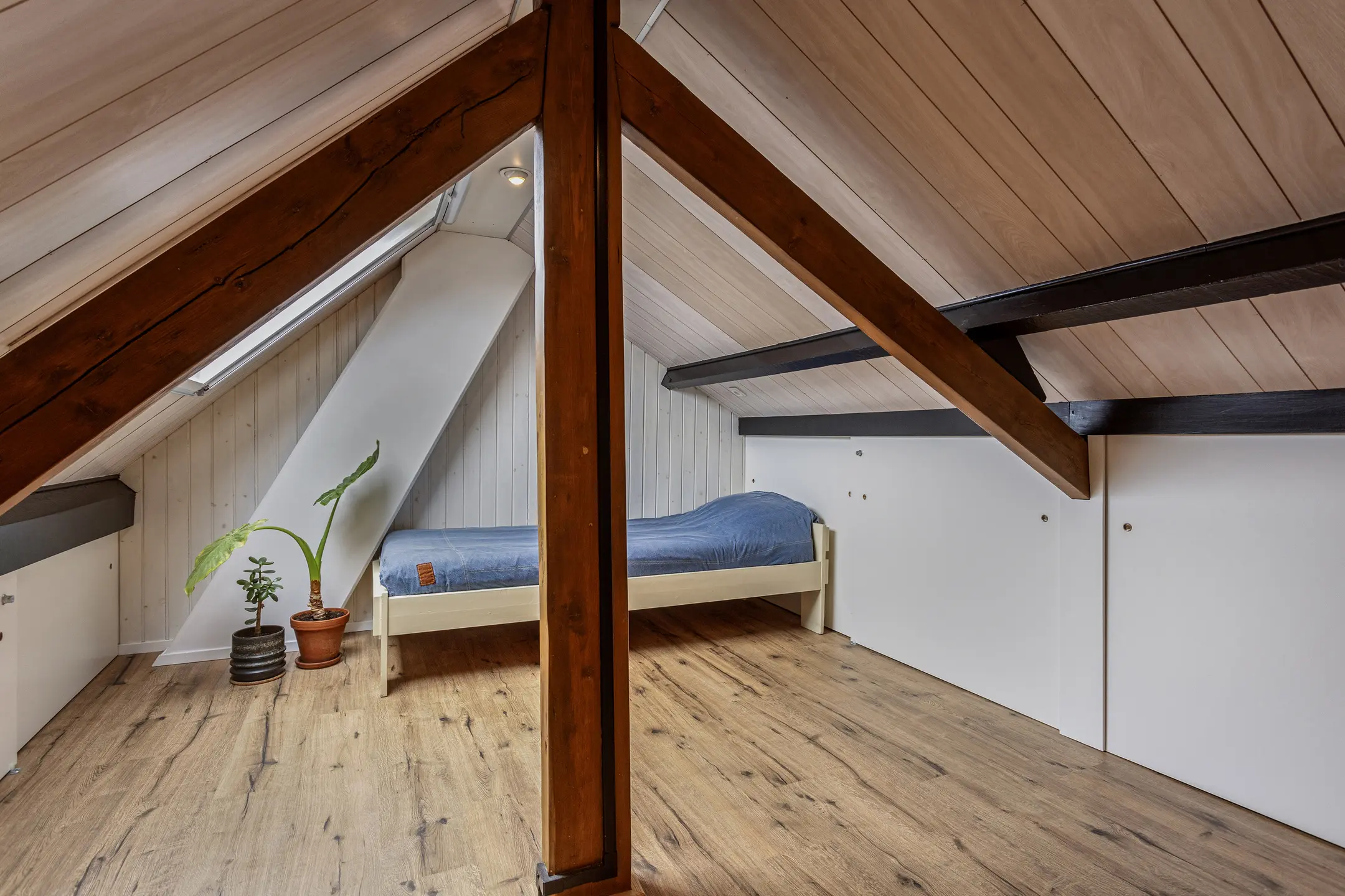 Middels een vaste trap te bereiken zolderverdieping waar voldoende bergruimte onder de dakschuinte aanwezig is. Door het grote dakraam prettig veel licht en de mogelijkheid voor een 4e (slaap)kamer.