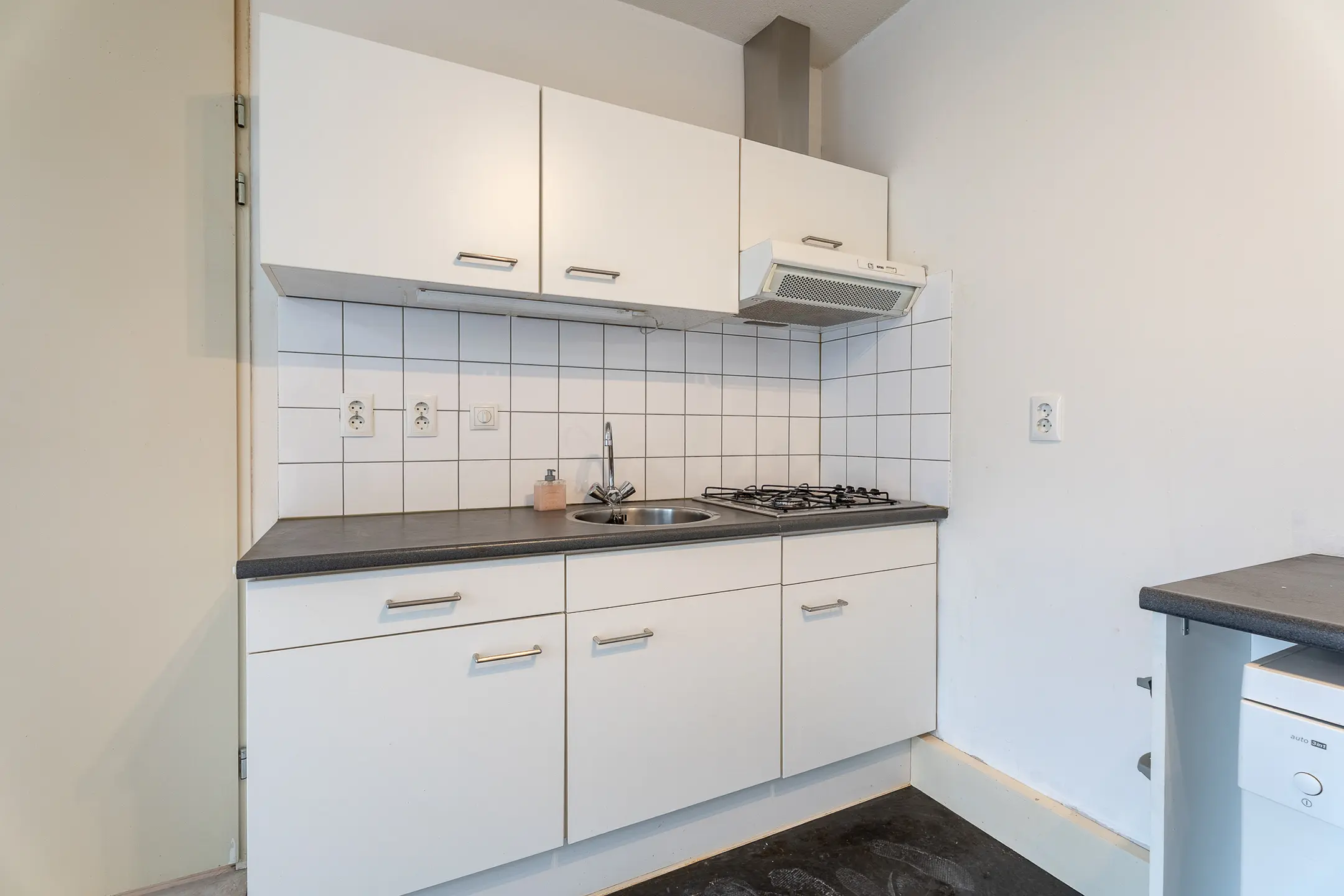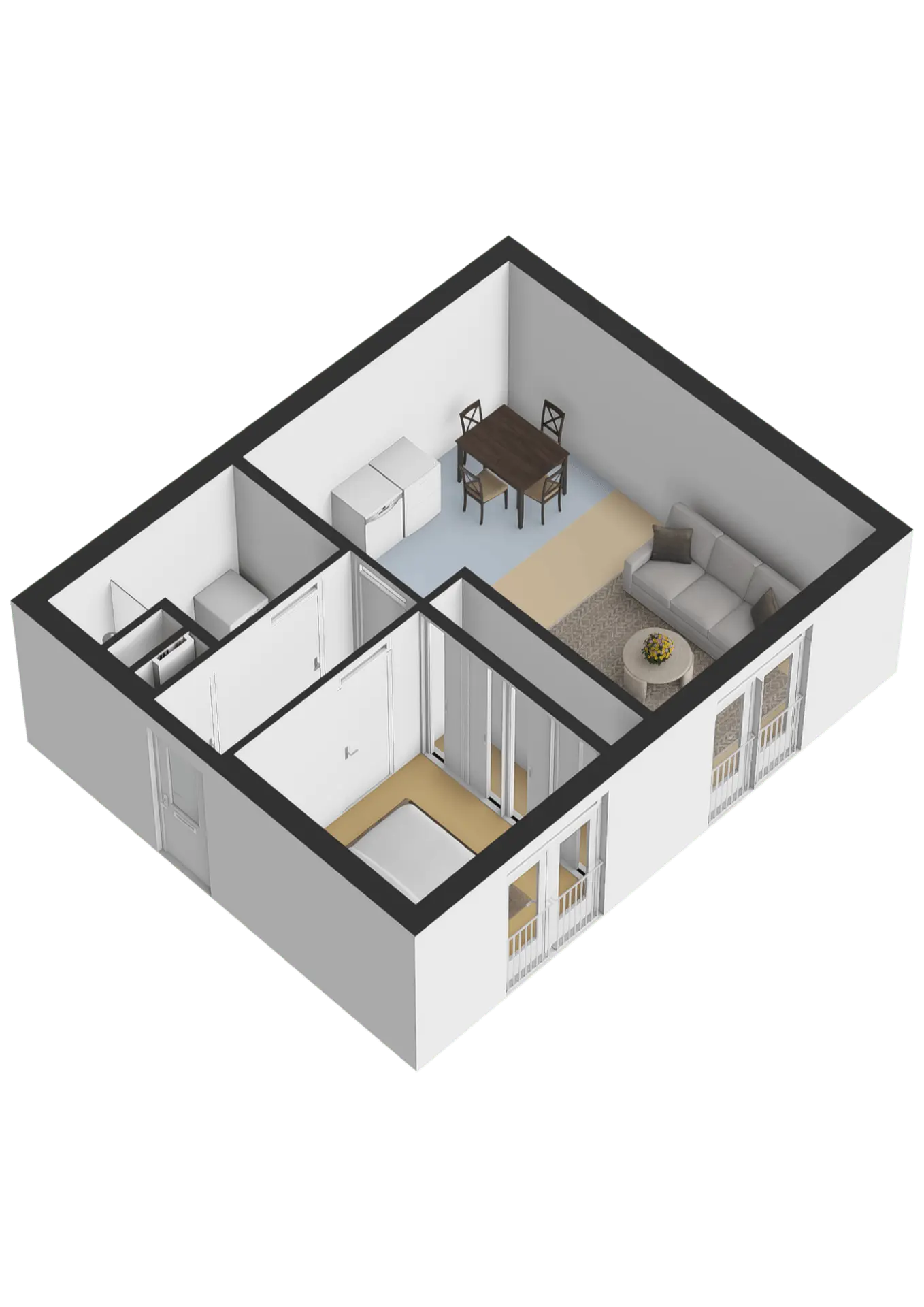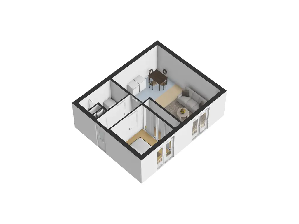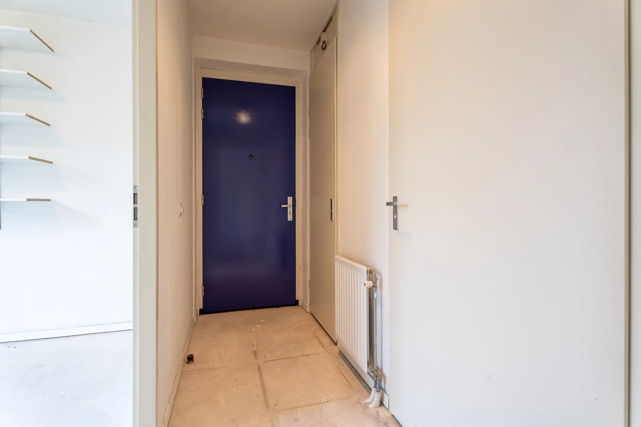 Via de entree van de woning bereik je alle vertrekken: hal, meterkast, slaapkamer, badkamer en de woonkamer.