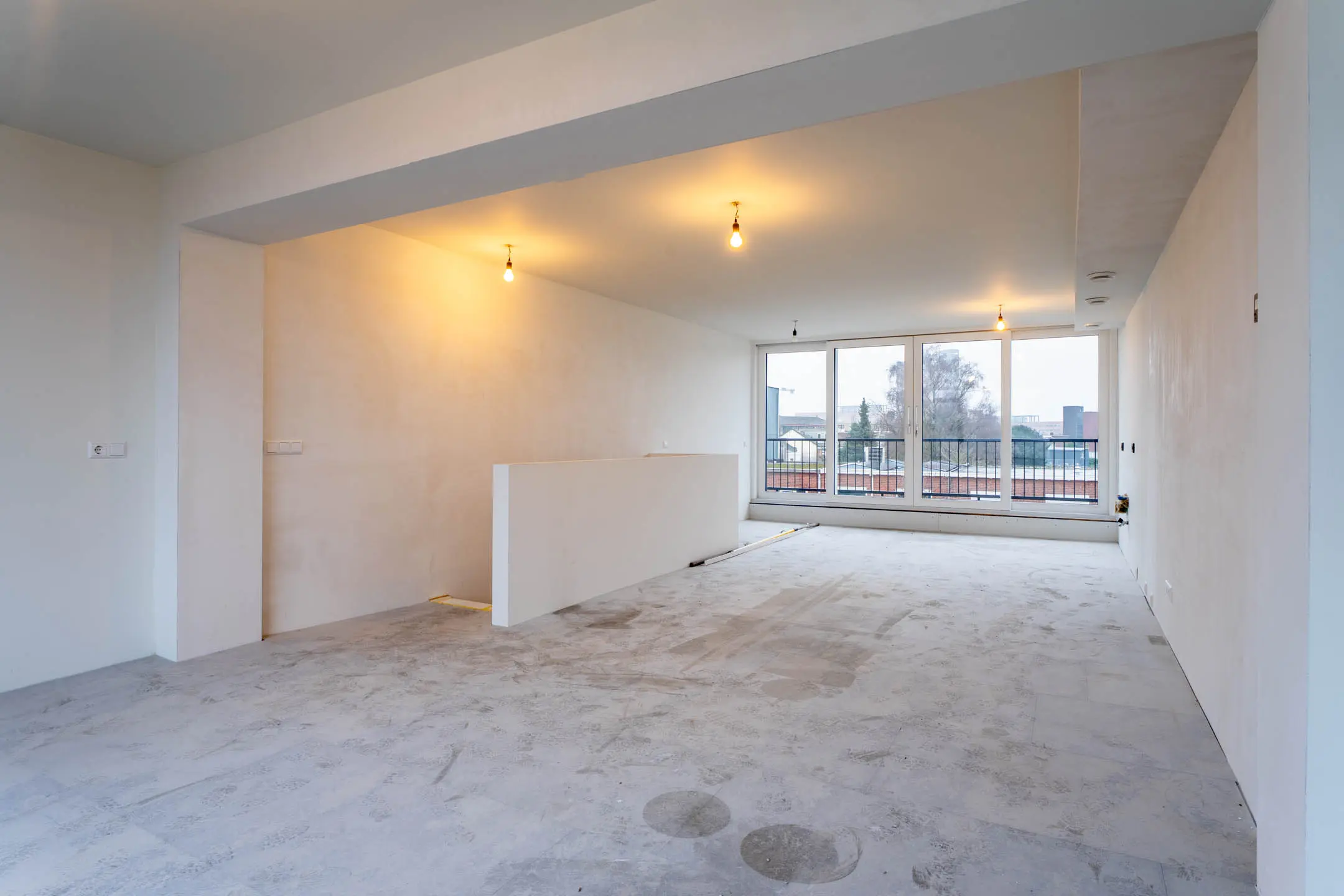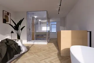Nu ingericht als één grote open ruimte. Volledig voorzien van vloerverwarming (net als op de andere verdiepingen) en met toegang tot het dakterras/balkon. De grote schuifpui laat prachtig licht binnen en biedt een magnifiek uitzicht over het stadshart. Er zijn voorbereidingen (leidingwerk) getroffen voor realisatie van een keuken als ook voor een badkamer.