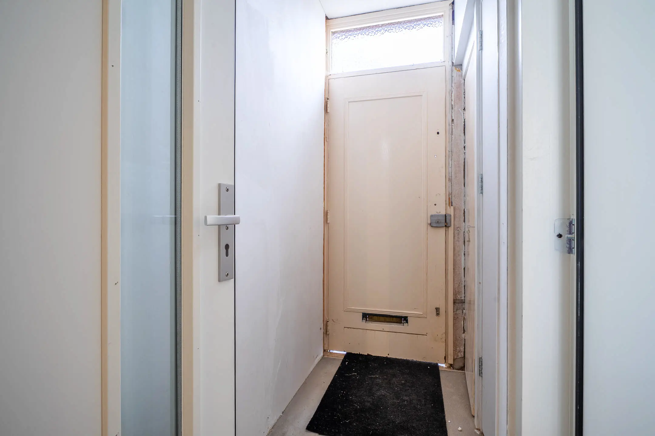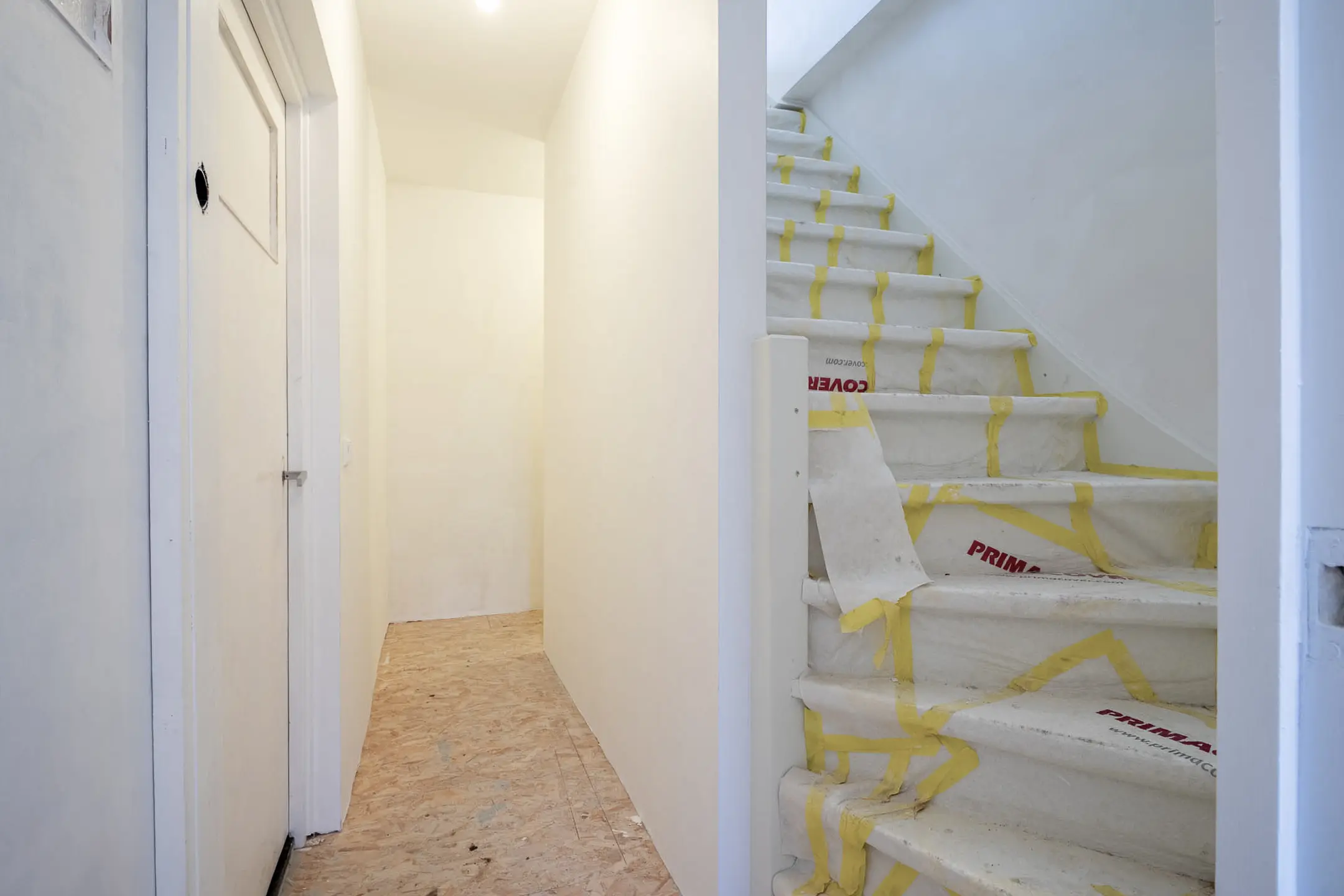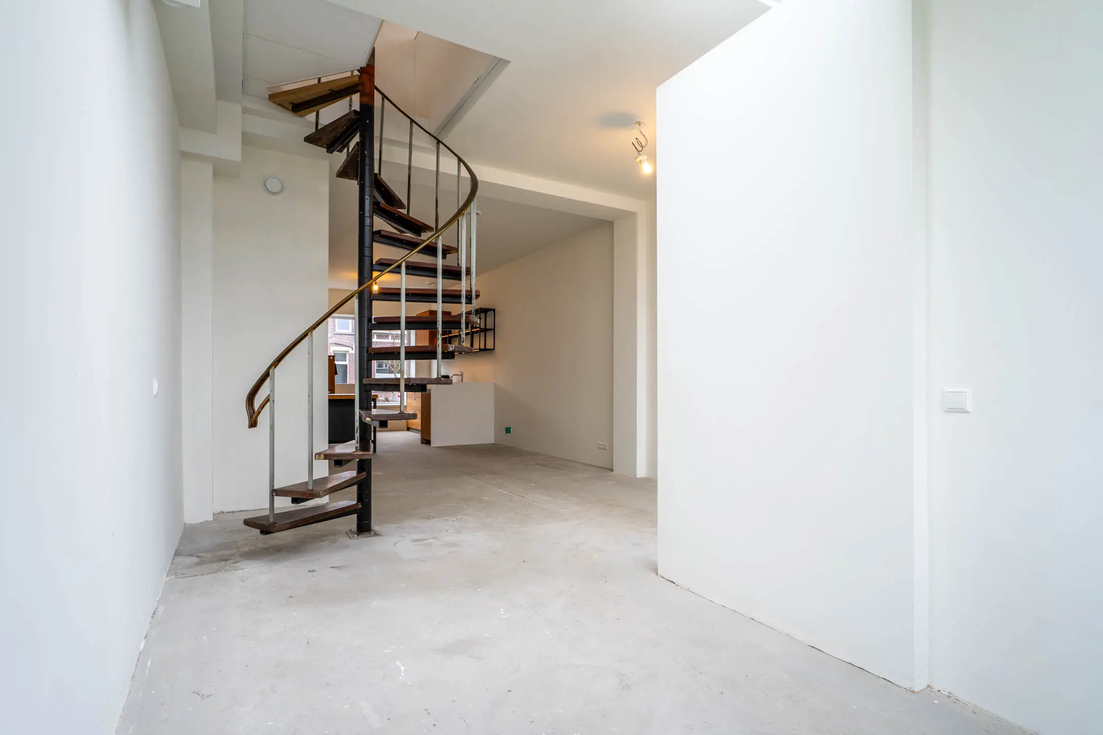 Entree, hal met meterkast, trapopgang en toegang tot de woonkamer. De trapopgang heeft een eigen toegangsdeur (voordeur), indien je er twee appartementen van wenst te maken. Ruime en lichte woonkamer met open keuken aan de voorzijde. Aan de achterzijde is de woning uitgebouwd met lichtstraat en tuindeuren. De wenteltrap brengt je naar een separaat gedeelte van de 1e verdieping. Hier bevinden zich een (slaap)kamer en een badkamer. De woonkamer en keuken zijn maar liefst circa 49m² groot en kunnen verder naar eigen wens worden ingericht. De keuken aan de voorzijde is hergebruikt en geeft je een indruk van de mogelijkheden (deze kan blijven staan of worden meegenomen, waarna je zelf de inrichting en opstelling verzorgt). Onder de trapopgang is een toilet en een installatieruimte met aansluiting voor een wasmachine en/of wasdroger.