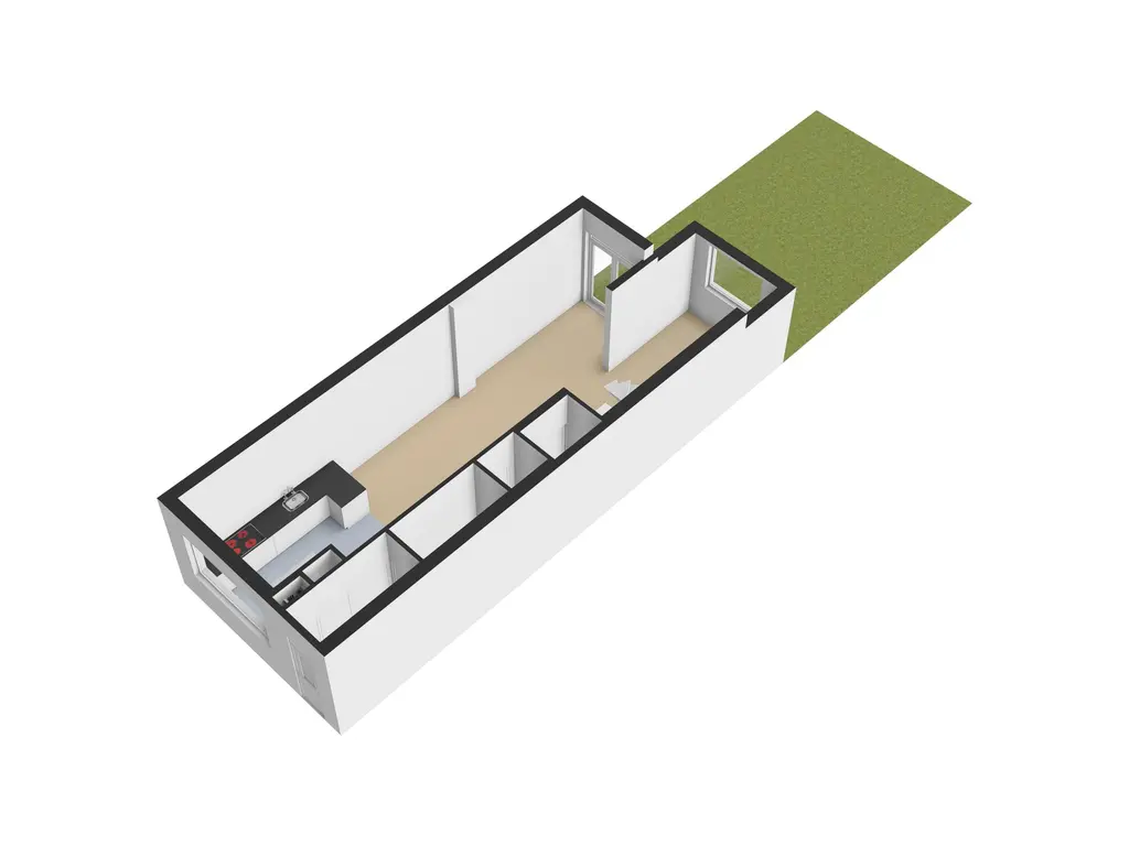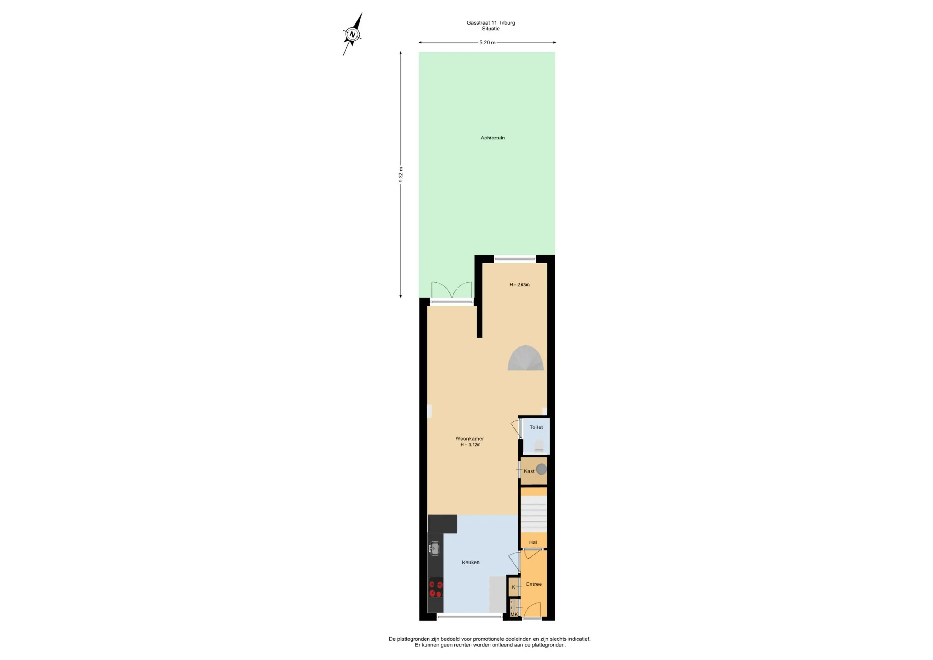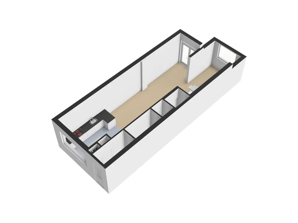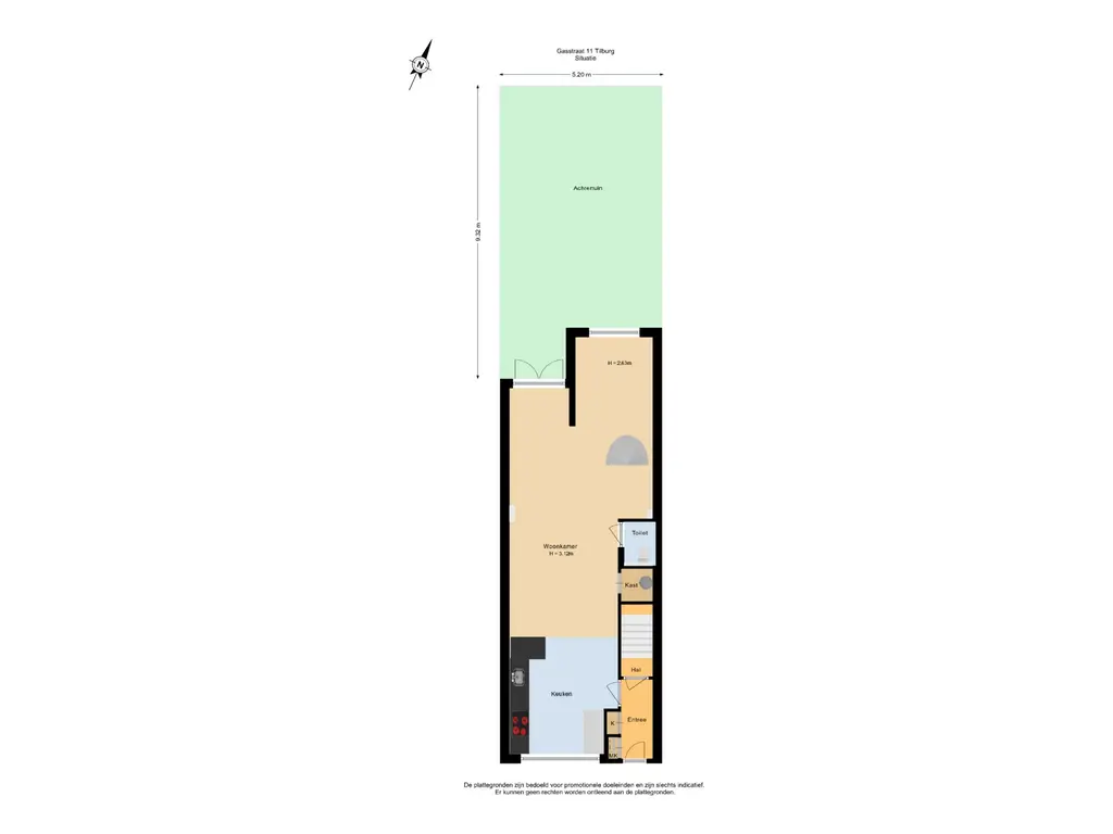 Entree, hal met meterkast, trapopgang en toegang tot de woonkamer. De trapopgang heeft een eigen toegangsdeur (voordeur), indien je er twee appartementen van wenst te maken. Ruime en lichte woonkamer met open keuken aan de voorzijde. Aan de achterzijde is de woning uitgebouwd met lichtstraat en tuindeuren. De wenteltrap brengt je naar een separaat gedeelte van de 1e verdieping. Hier bevinden zich een (slaap)kamer en een badkamer. De woonkamer en keuken zijn maar liefst circa 49m² groot en kunnen verder naar eigen wens worden ingericht. De keuken aan de voorzijde is hergebruikt en geeft je een indruk van de mogelijkheden (deze kan blijven staan of worden meegenomen, waarna je zelf de inrichting en opstelling verzorgt). Onder de trapopgang is een toilet en een installatieruimte met aansluiting voor een wasmachine en/of wasdroger.