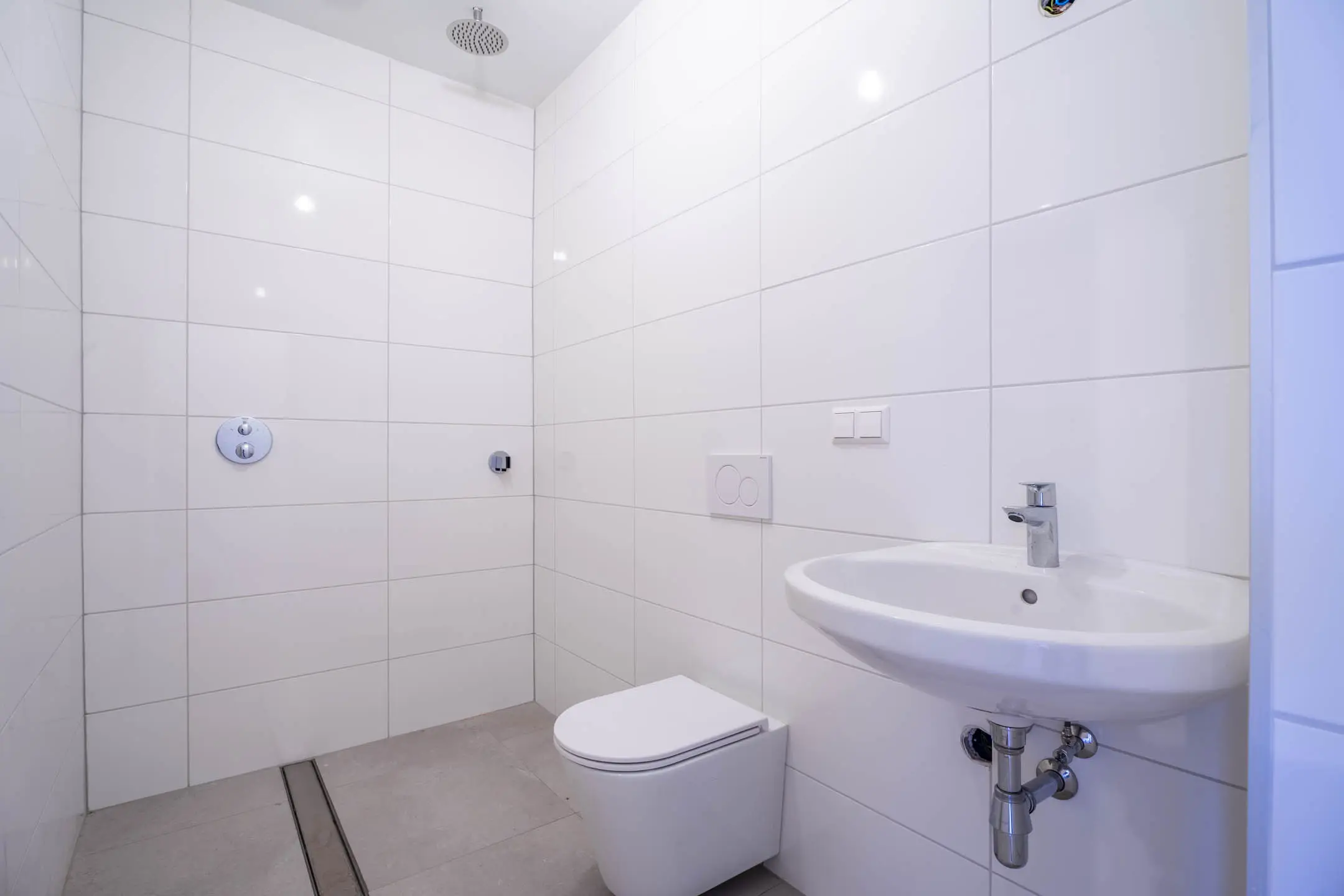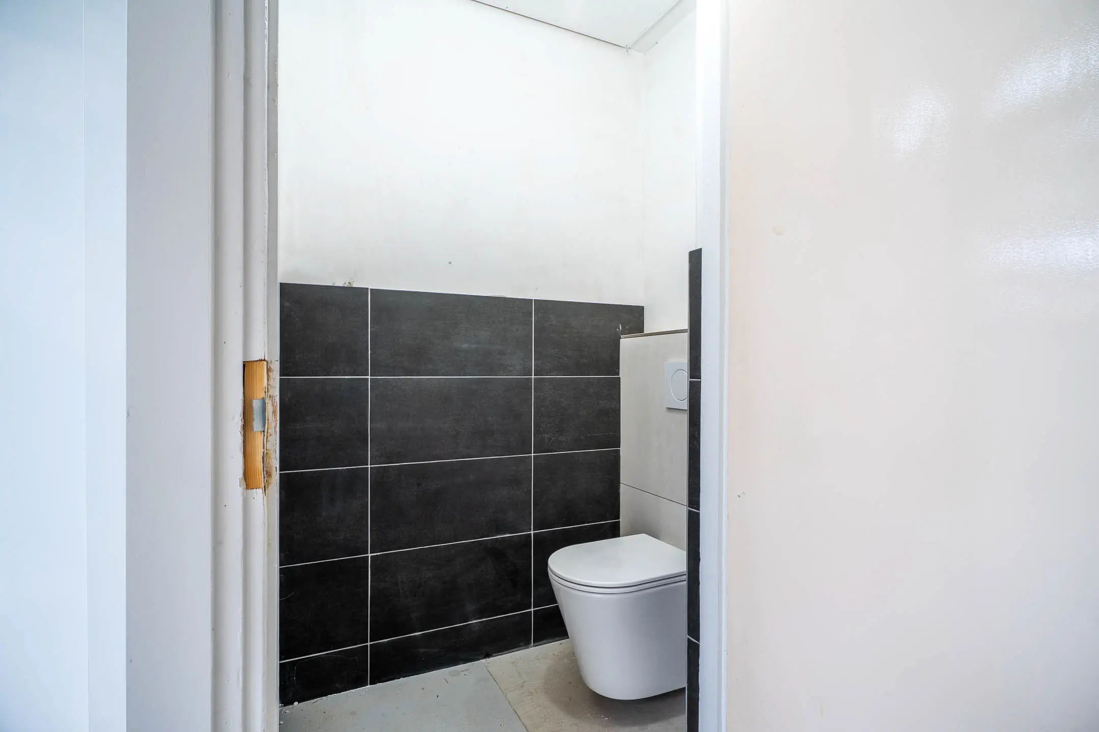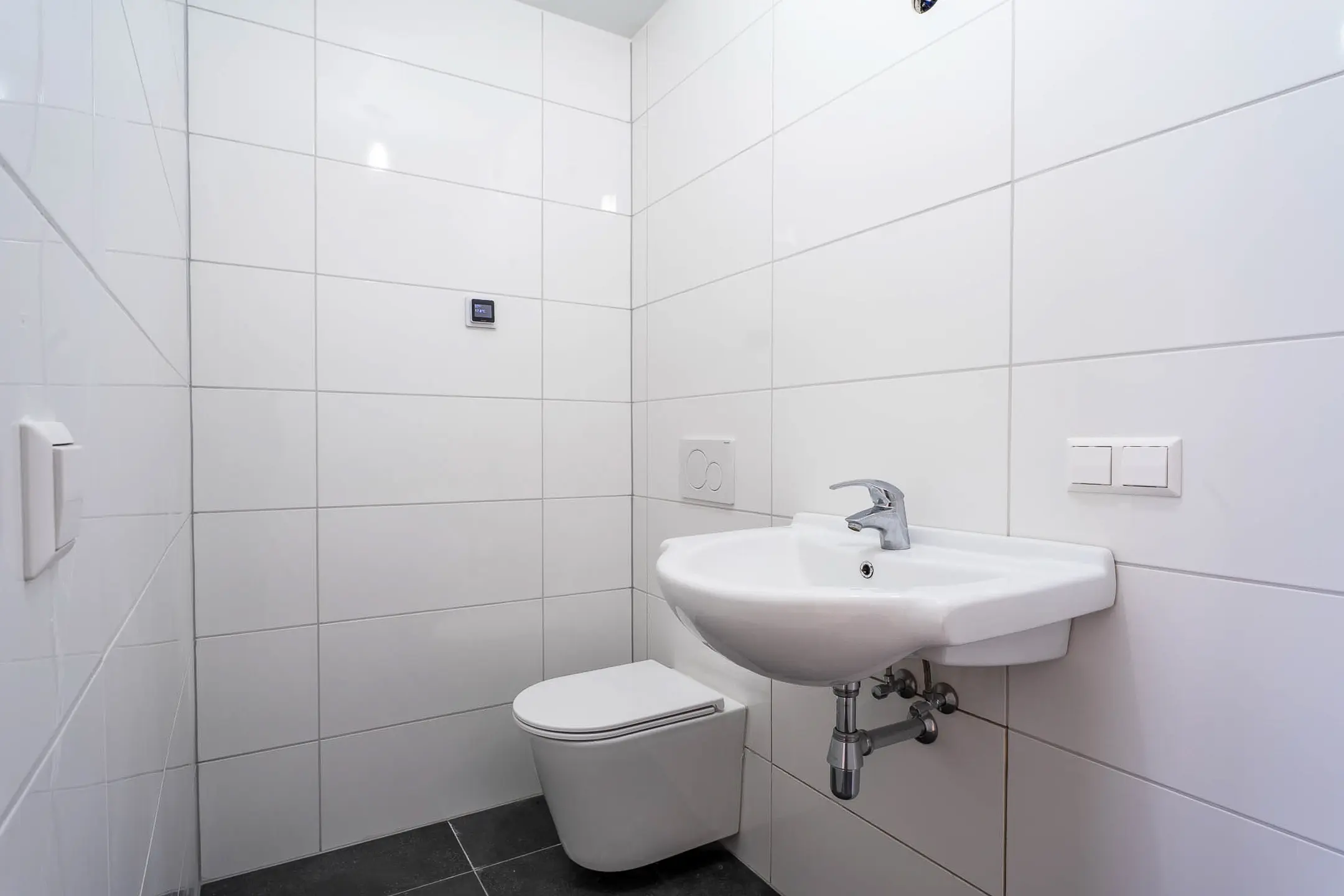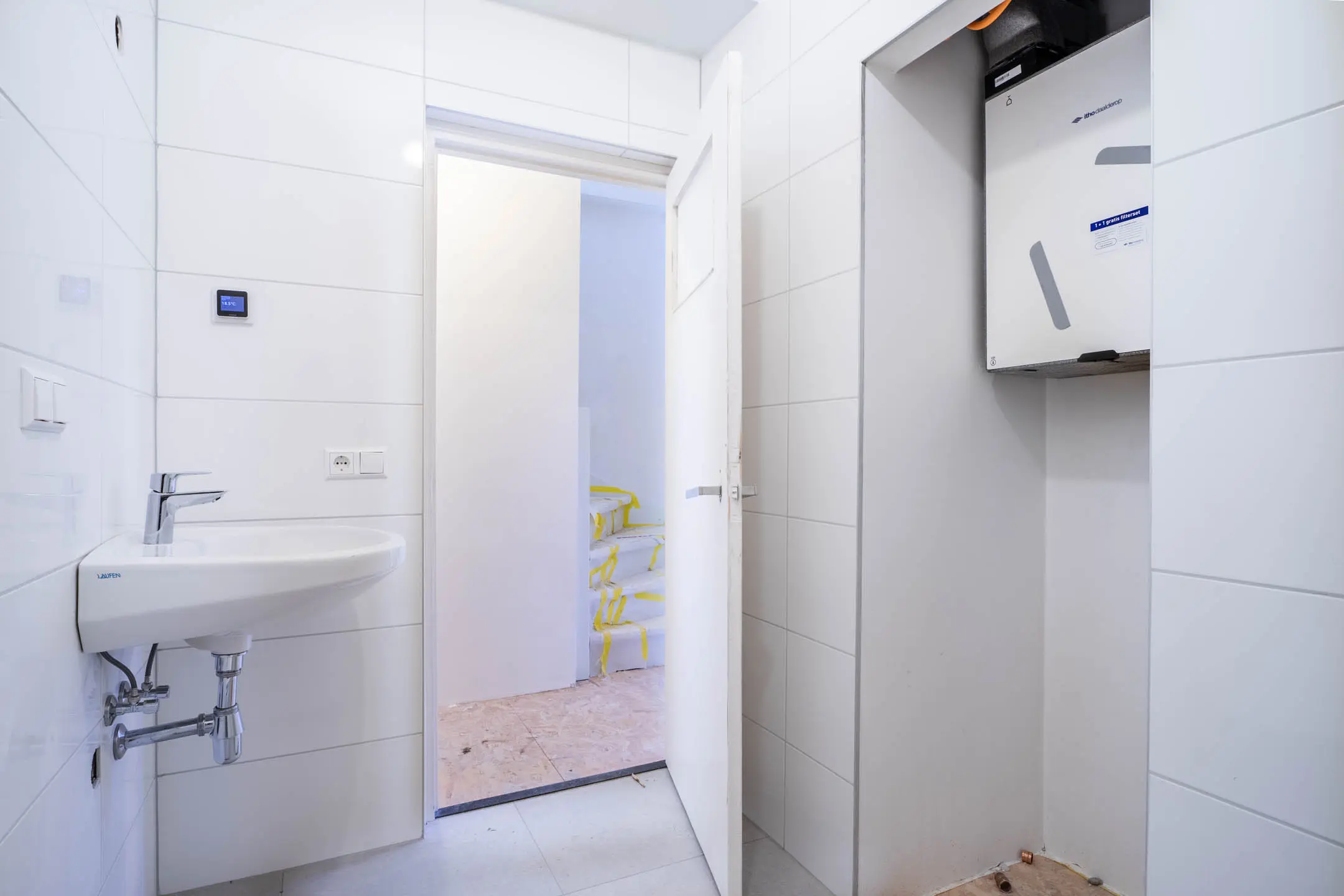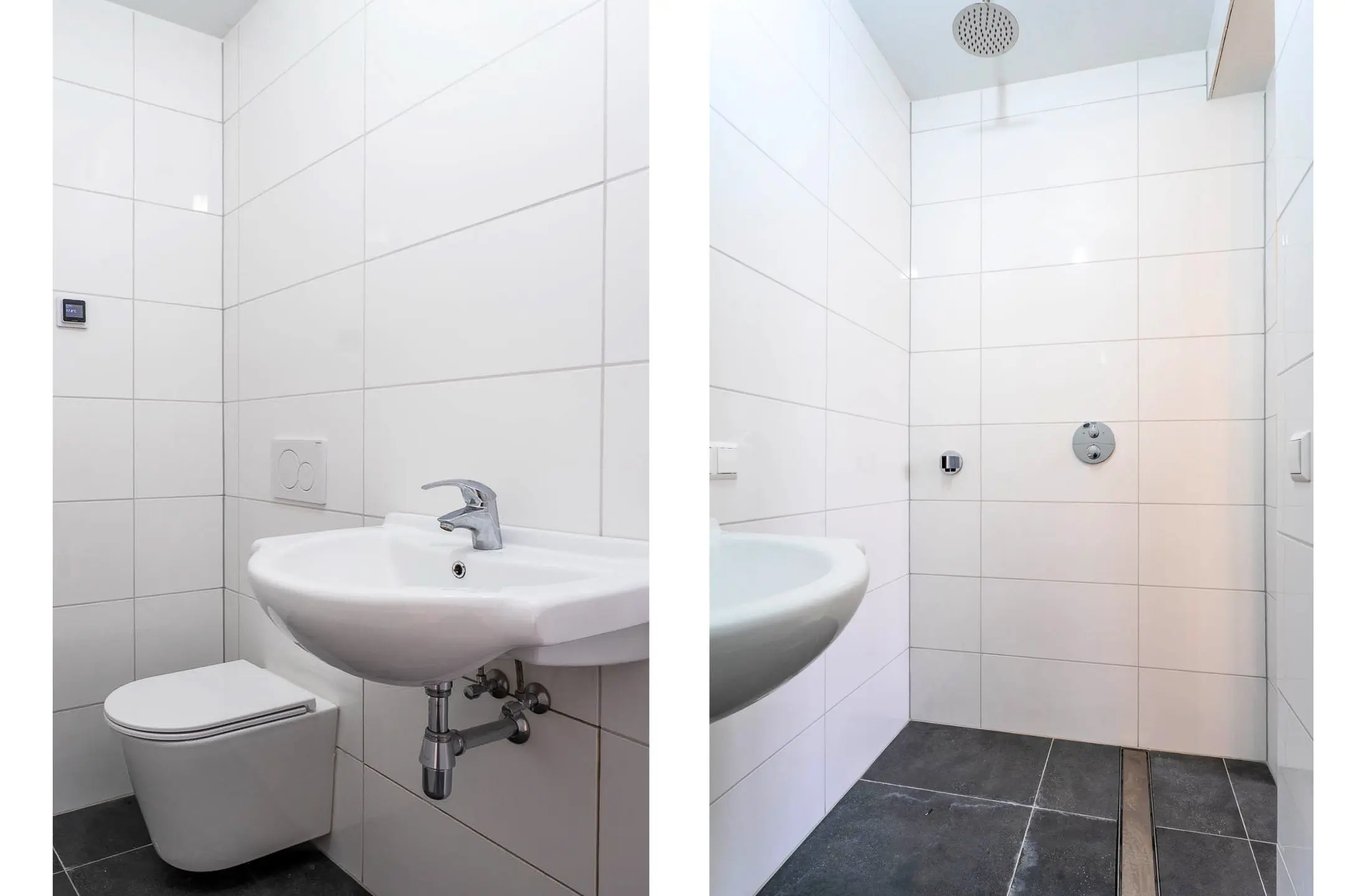 Ruime overloop met toegang tot twee (slaap)kamers, een 2e badkamer en de trapopgang naar de 2e verdieping. Mooie kinderkamers van circa 6 en 8 m². De badkamer is strak en modern uitgevoerd, met grijze en witte tegels, en voorzien van een (3e) toilet, wastafel en inloopdouche. In een vaste kast (toegankelijk vanuit de grote slaapkamer) bevindt zich de warmtepomp.