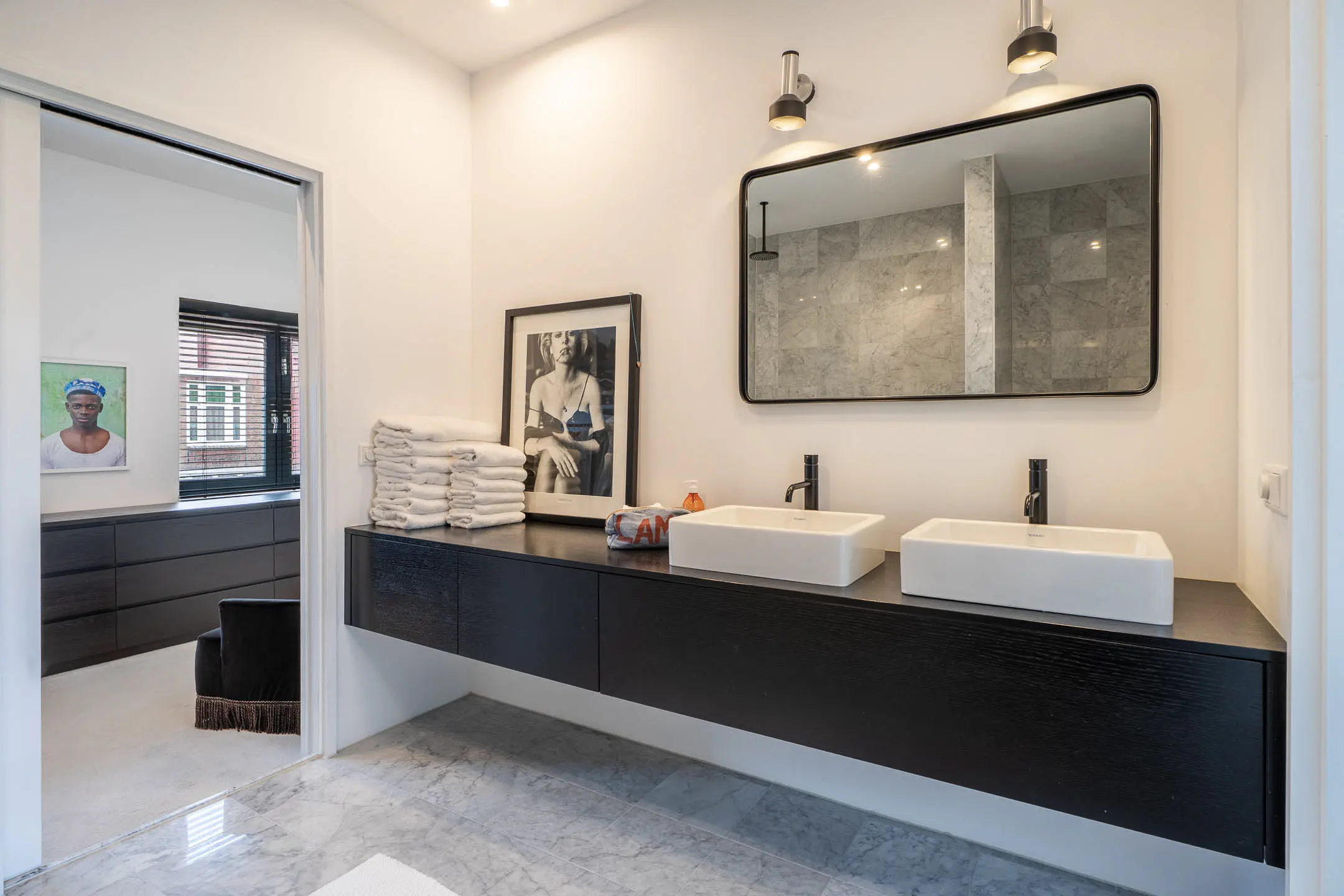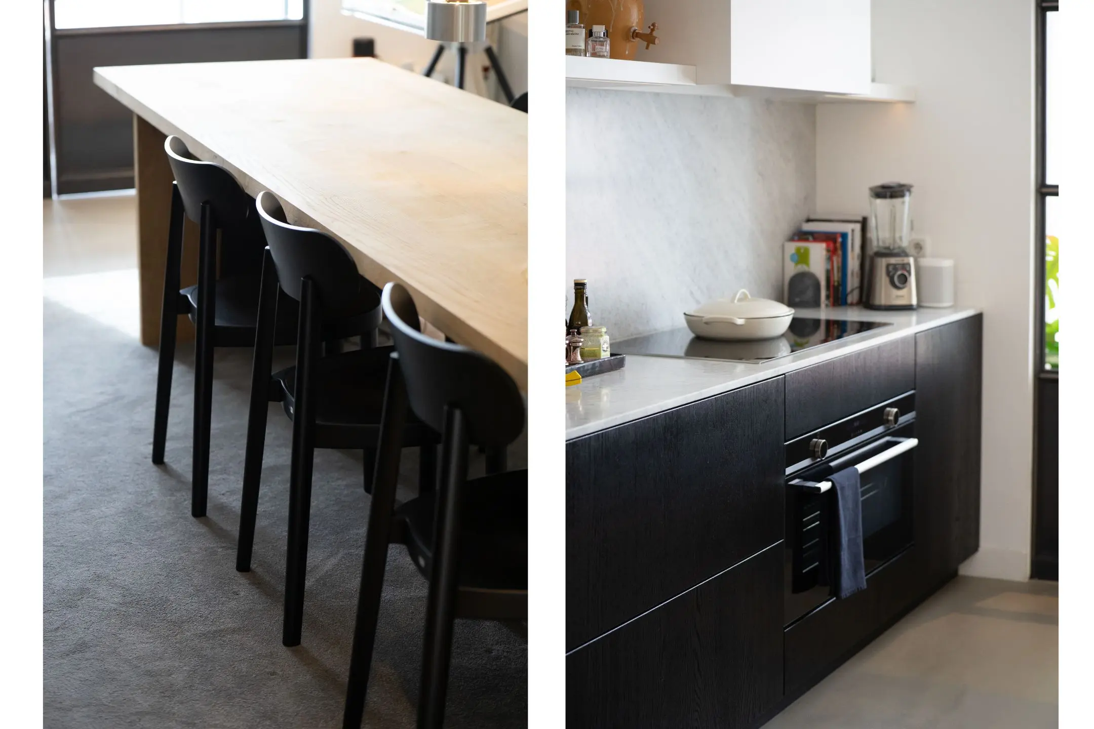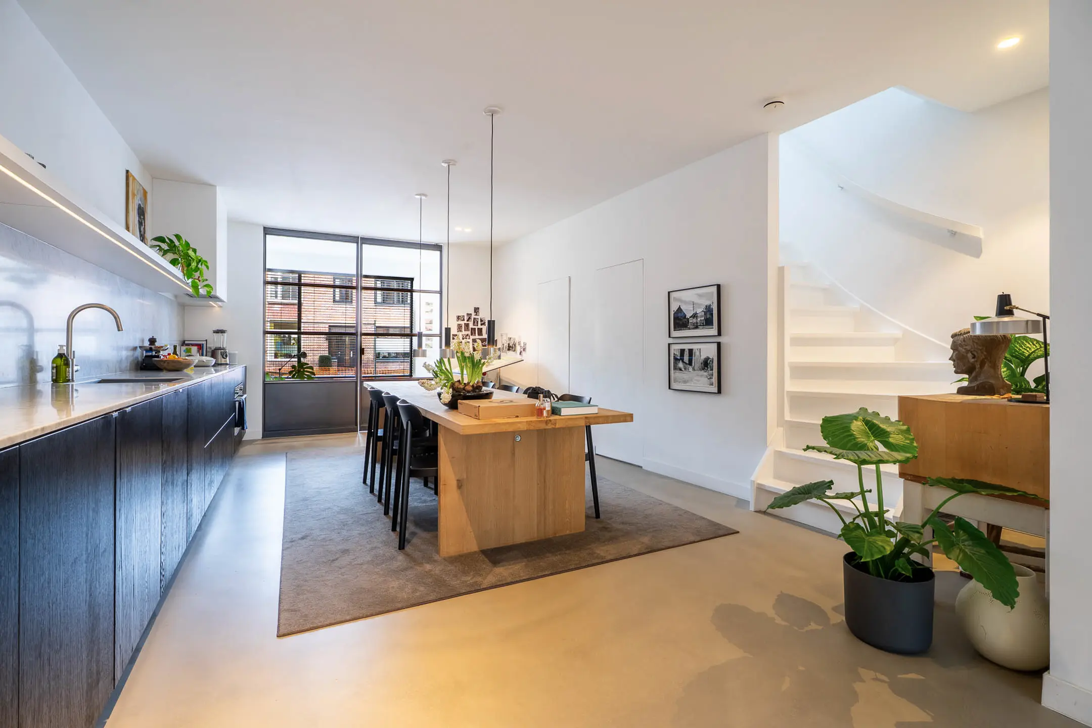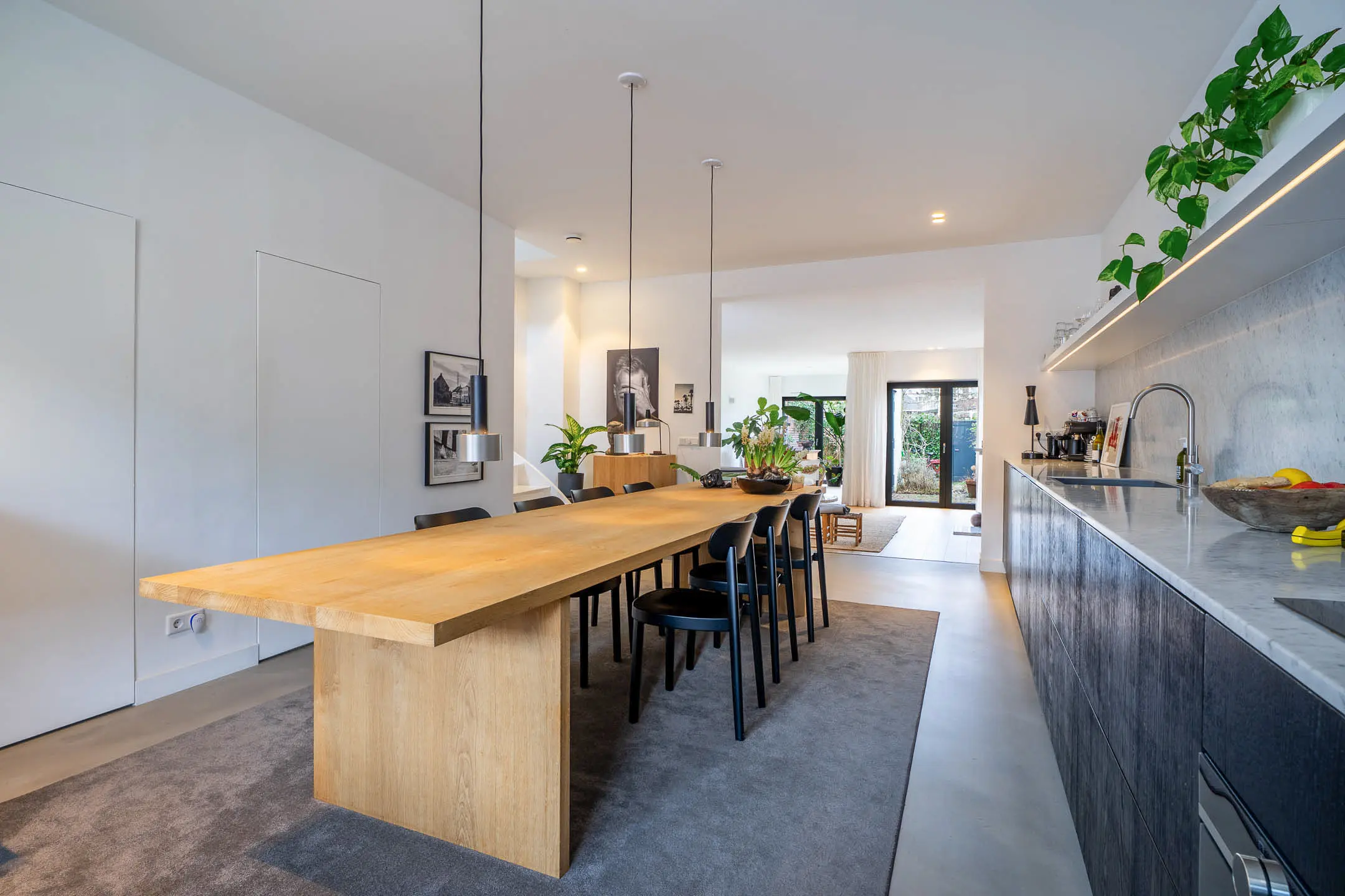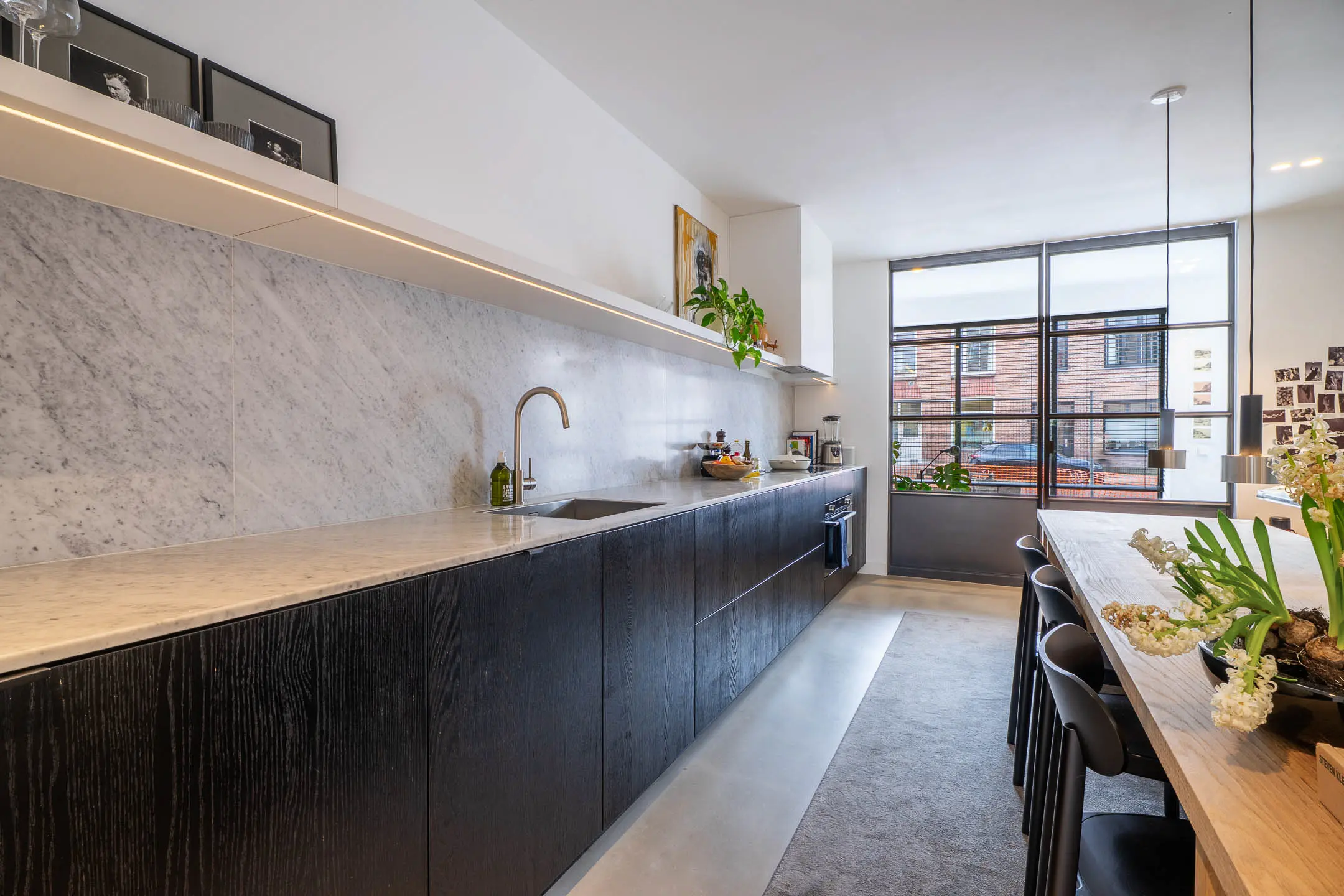 Je komt binnen in een ruime hal die direct indruk maakt met stijlvolle brede taatsdeur. In de hal is de toegang tot de toiletruimte met zwevend toilet. Vanuit de hal betreed je de royale leefruimte met een sfeervolle woonkeuken als hart van het huis — dé plek om te koken en samen te komen. De hal en woonkeuken zijn afgewerkt met een gietvloer en stucwerk. Twee handige vaste kasten bieden extra bergruimte in de keuken. De luxe keuken is voorzien van een marmeren blad en achterwand. Er zijn twee koelkasten, een inductiekookplaat, vaatwasser en extra brede oven.