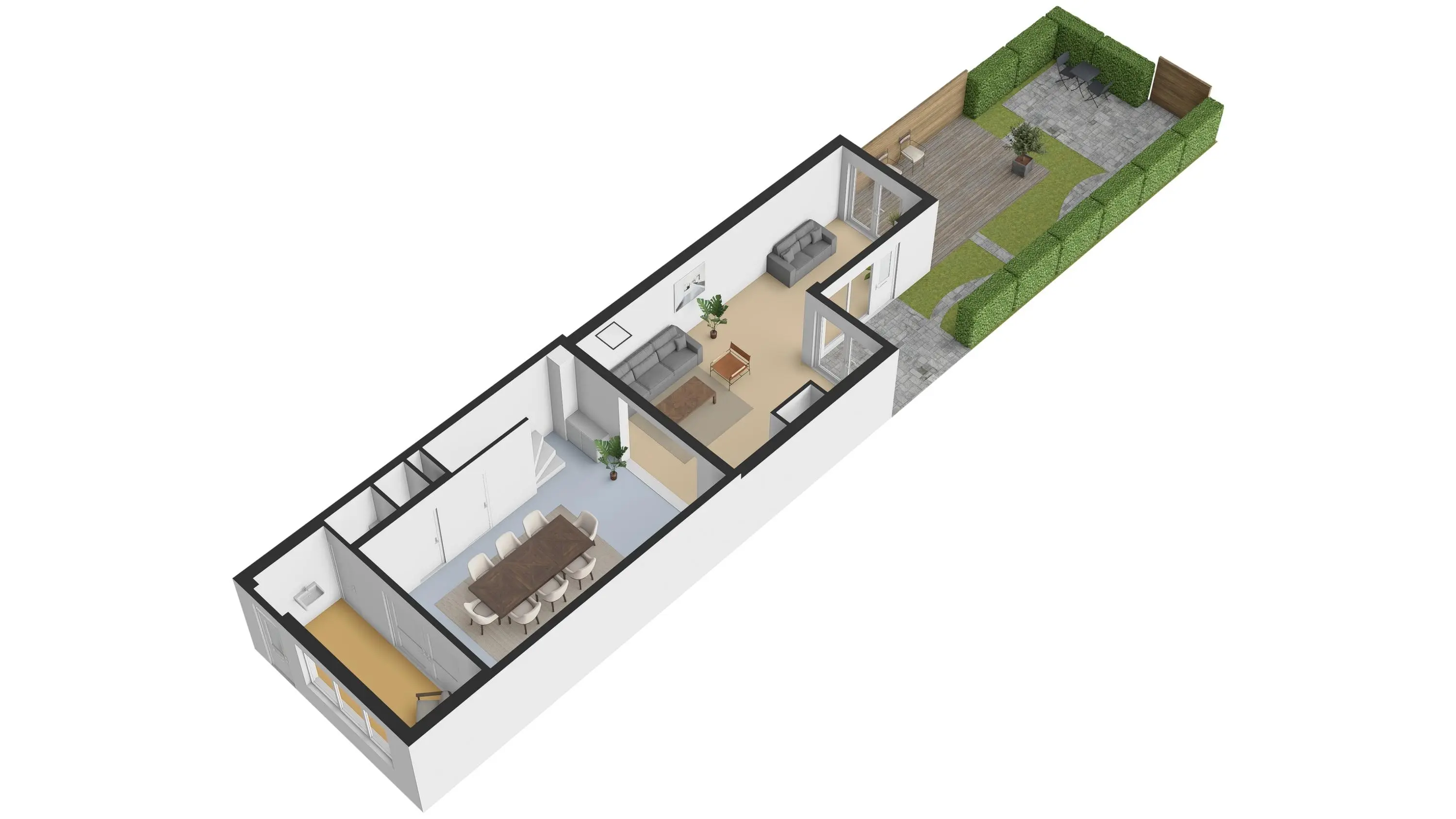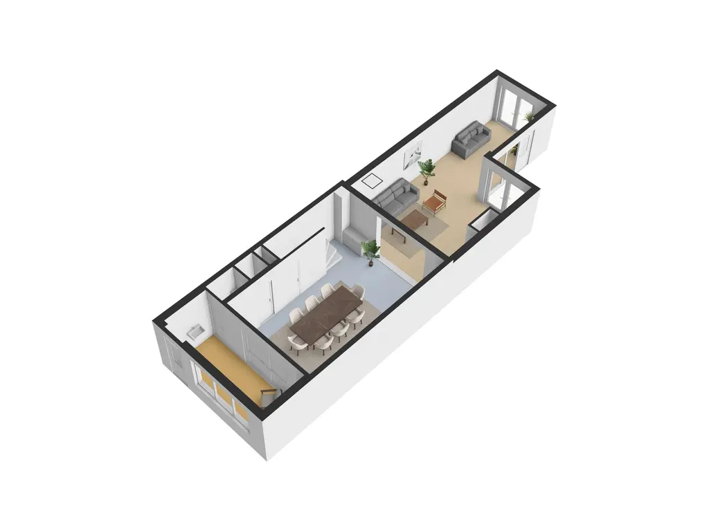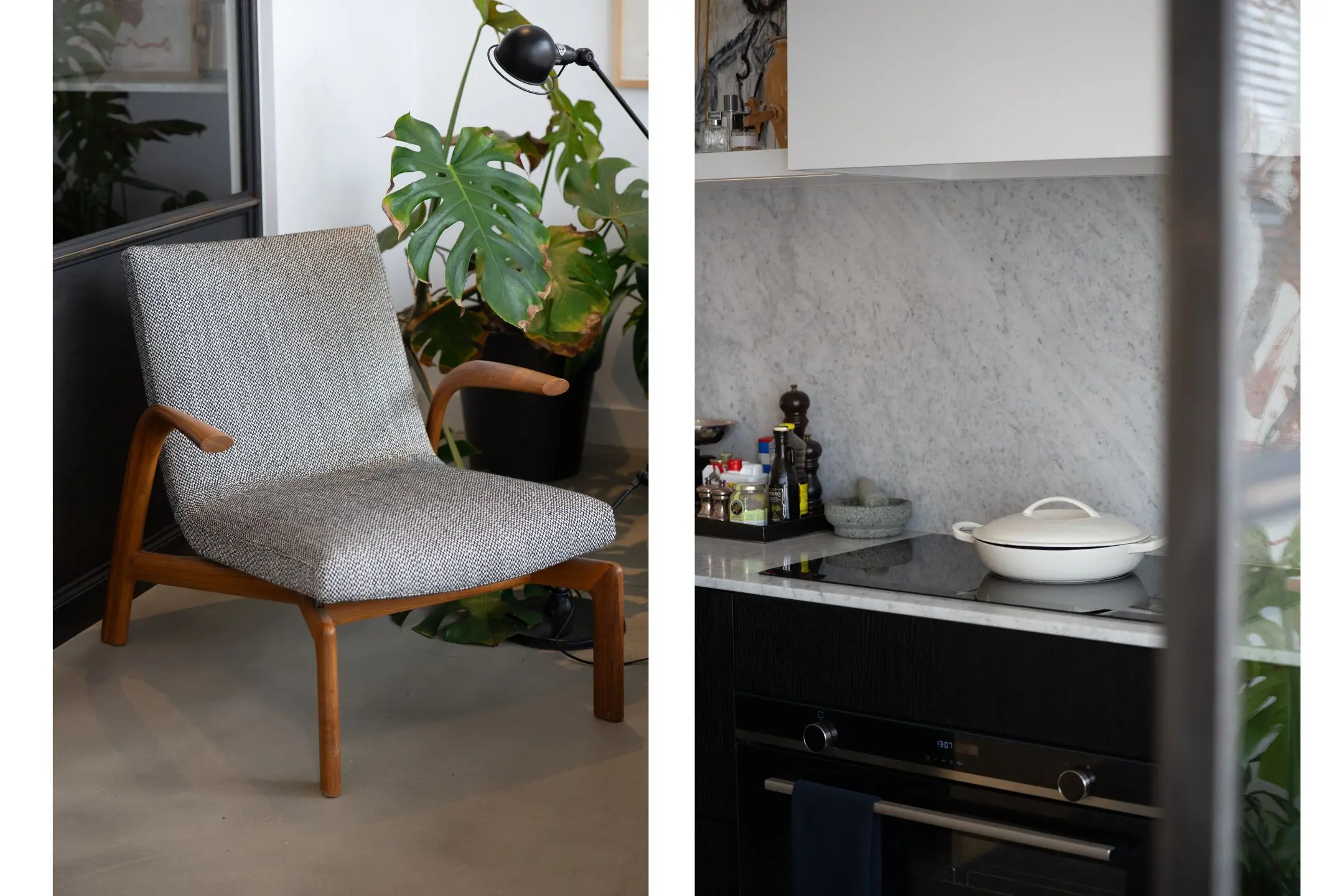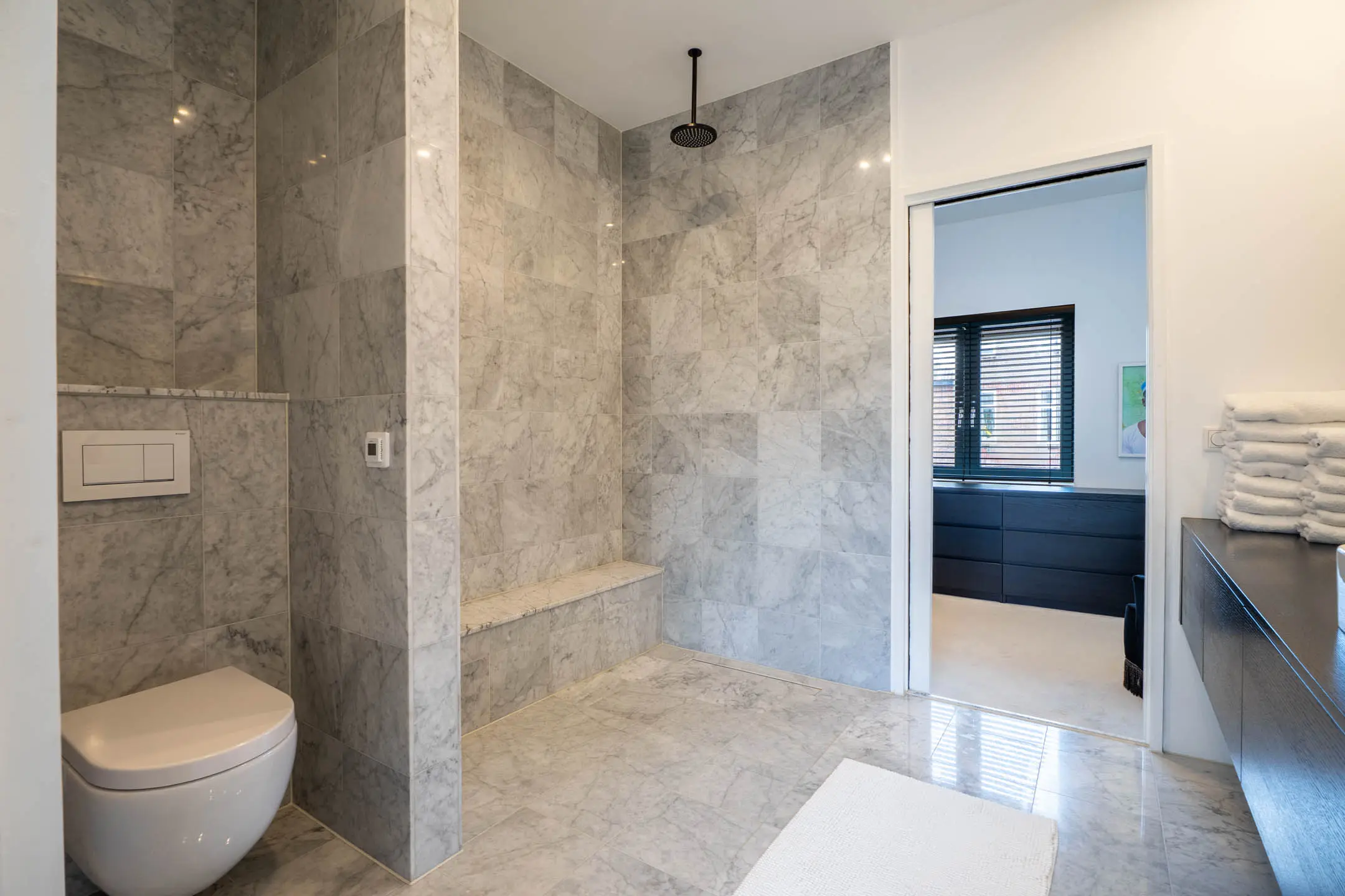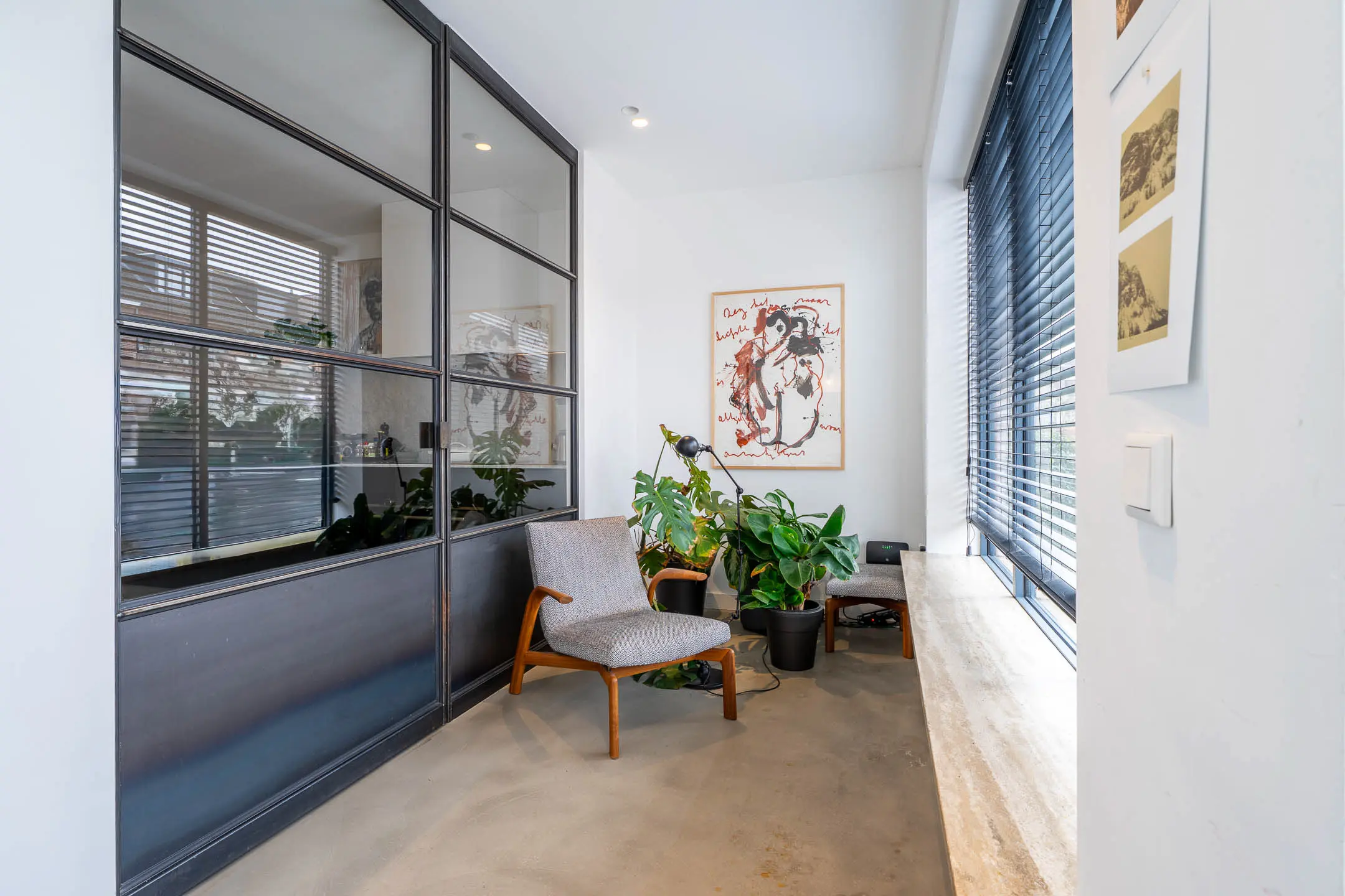 Je komt binnen in een ruime hal die direct indruk maakt met stijlvolle brede taatsdeur. In de hal is de toegang tot de toiletruimte met zwevend toilet. Vanuit de hal betreed je de royale leefruimte met een sfeervolle woonkeuken als hart van het huis — dé plek om te koken en samen te komen. De hal en woonkeuken zijn afgewerkt met een gietvloer en stucwerk. Twee handige vaste kasten bieden extra bergruimte in de keuken. De luxe keuken is voorzien van een marmeren blad en achterwand. Er zijn twee koelkasten, een inductiekookplaat, vaatwasser en extra brede oven.