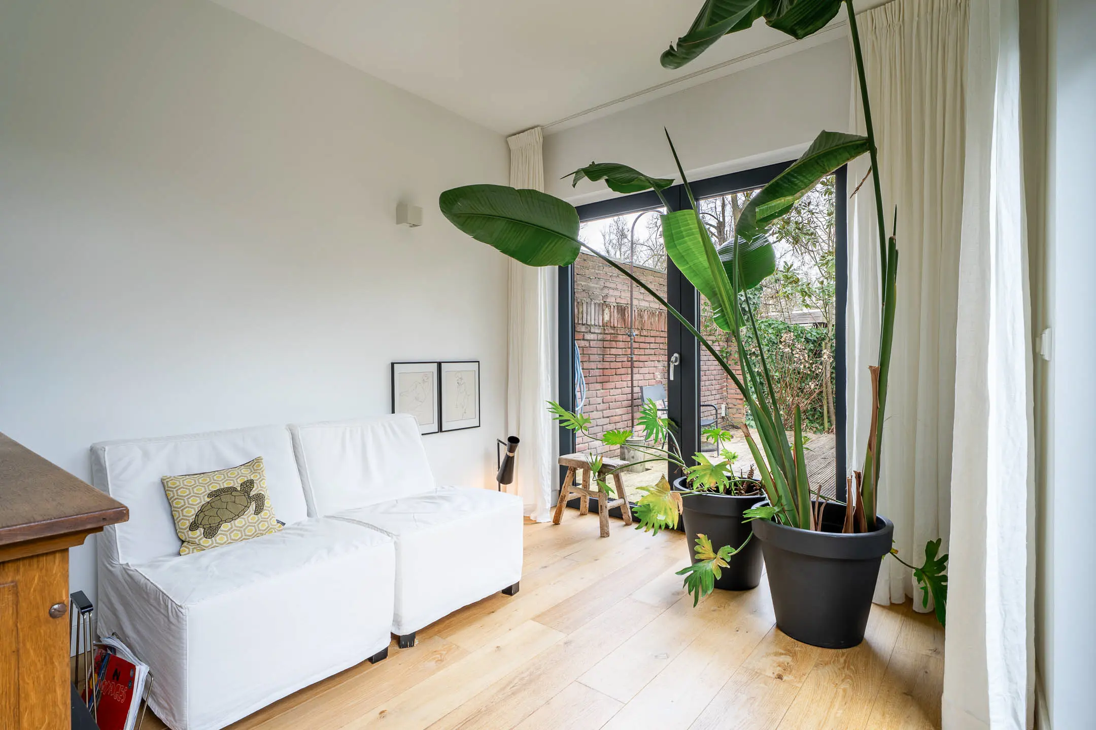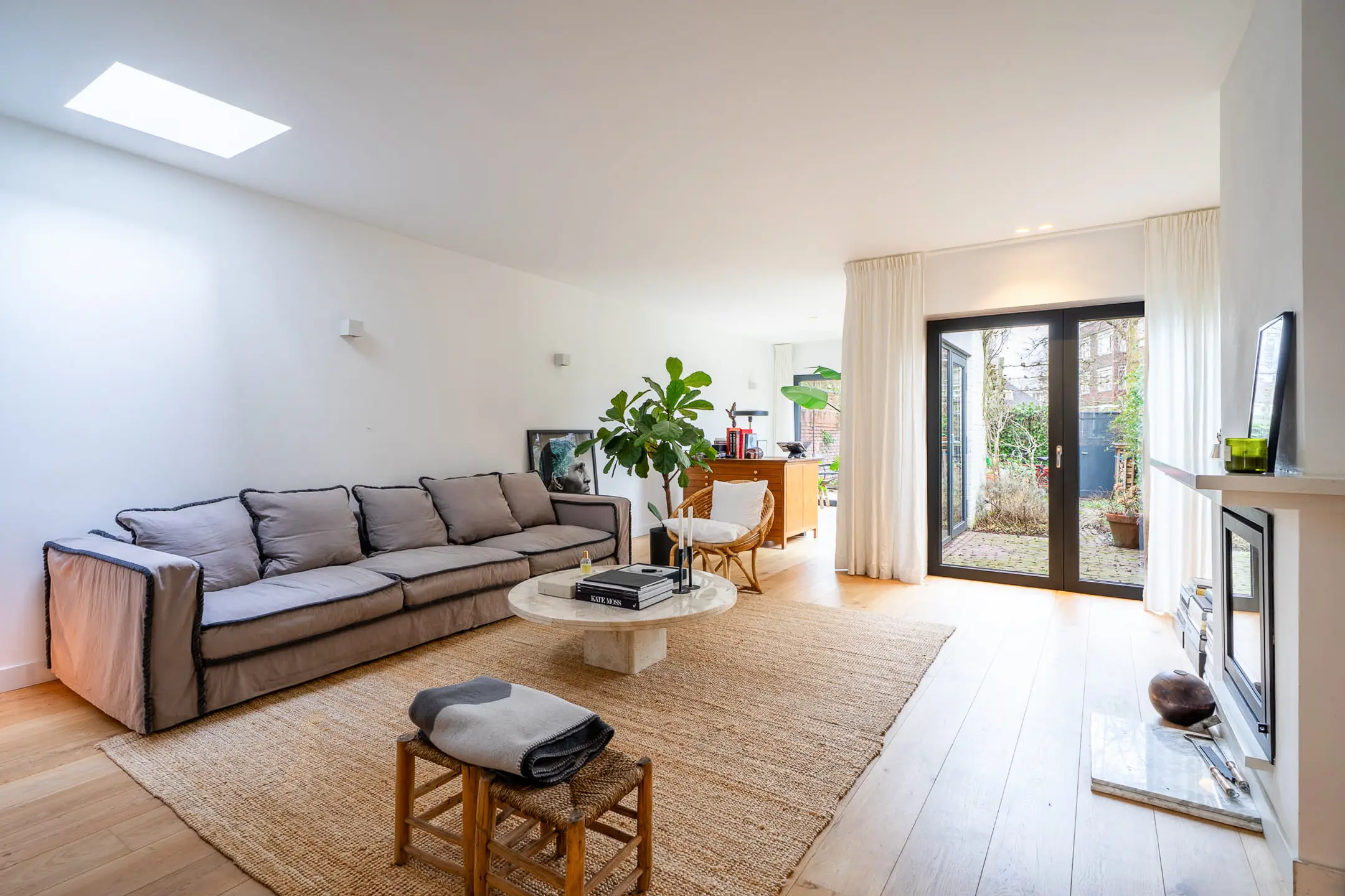 Aan de achterzijde bevindt zich een gezellige living met tv-kamer met haard en een leeshoek, een fijne plek om te ontspannen. Via openslaande tuindeuren kom je in de fraai aangelegde achtertuin. Vanuit de leeshoek is een loopdeur met toegang tot de achtertuin. De living is afgewerkt met een eiken houten vloer en stucwerk.