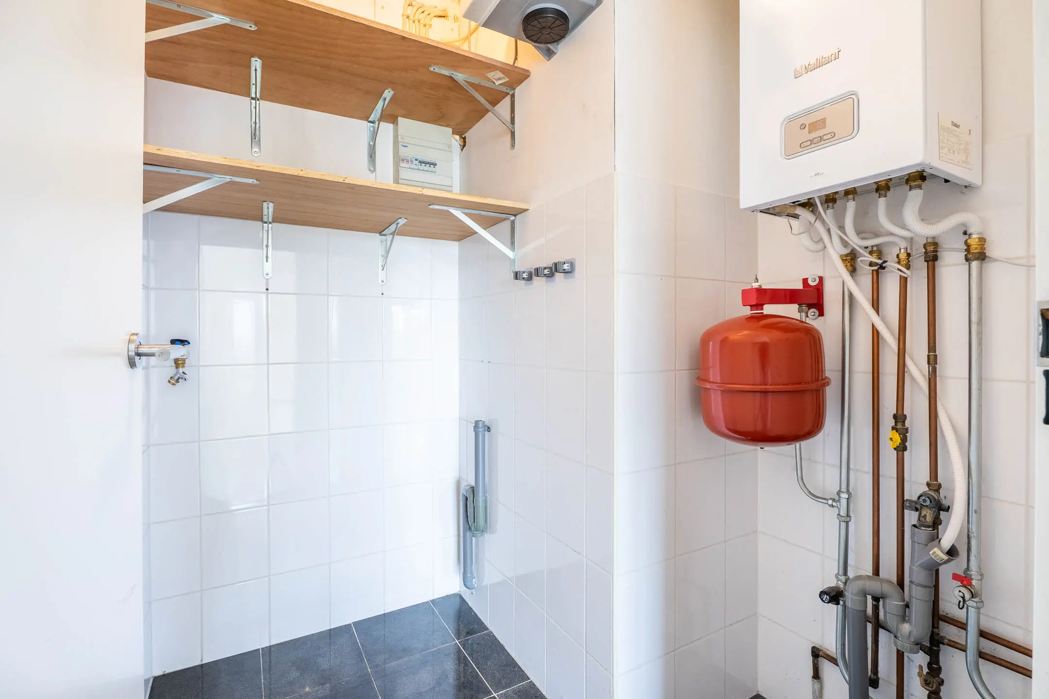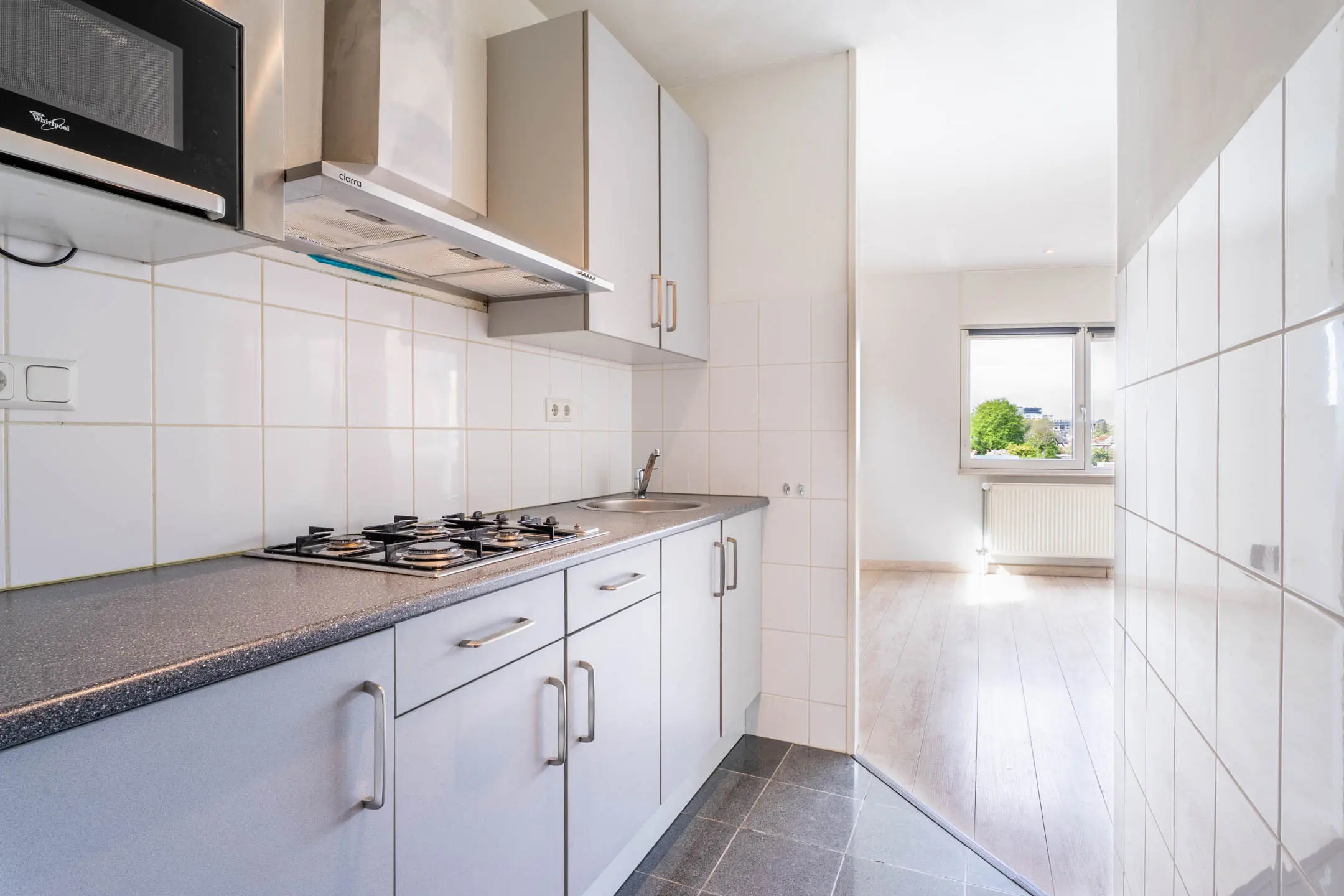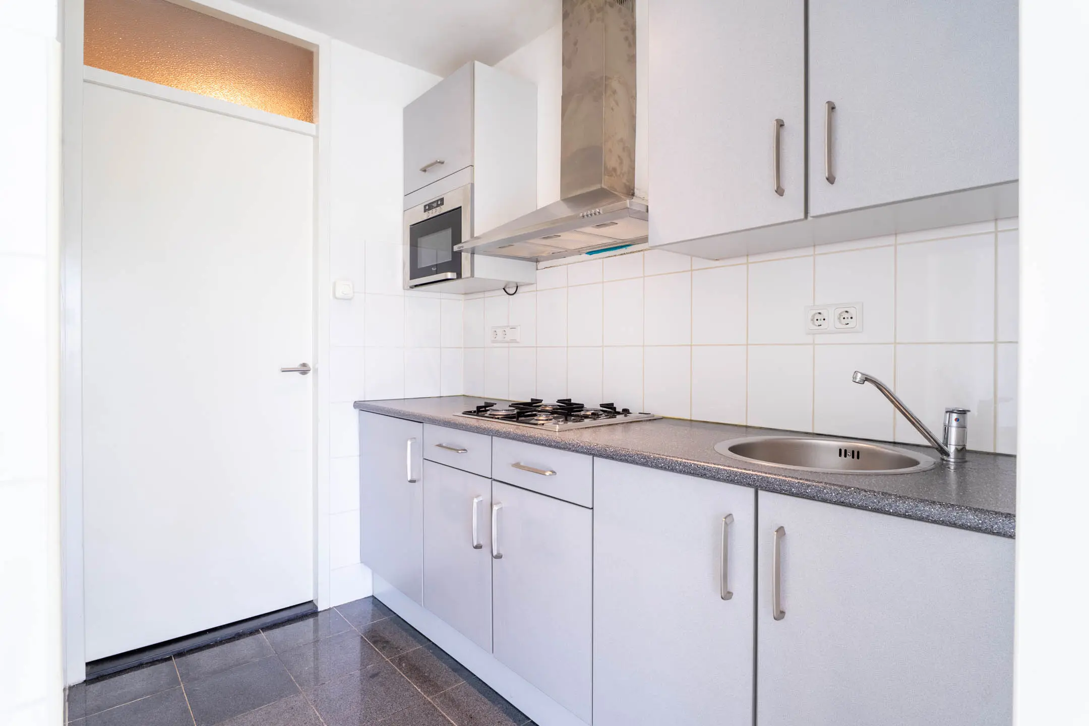 Mooie, lichte woonkamer met volop ramen en een loopdeur naar het terras. Ruim opgezette woonkamer van ca. 25 m² met semi-open keuken. Prima keuken in rechte opstelling met volop onder- en bovenkasten en is voorzien van diverse gemakken, zoals een koelkast, gaskookplaat, magnetron en RVS-spoelbak. Aansluitend aan de keuken is er toegang tot de technische ruimte/berging. Hier bevinden zich de aansluitingen voor de wasapparatuur, de opstelling van de cv-ketel en is er volop bergruimte. Het terras is ca. 4 m² en gelegen aan de voorzijde, op het zonnige westen.
