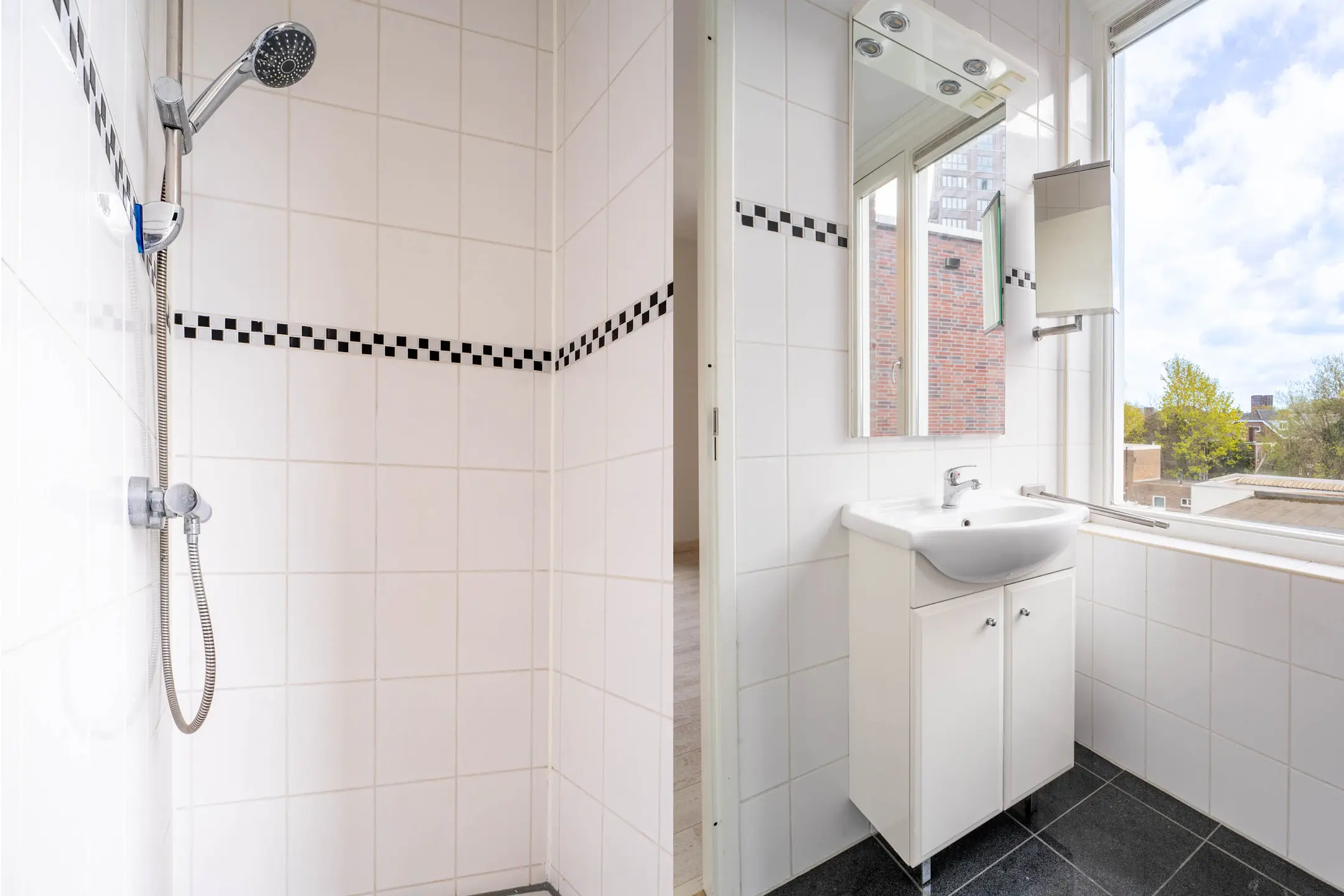 Via de gang heb je toegang tot de slaapkamer met aansluitend de badkamer. Mooi ruime slaapkamer van bijna 15 m² en keurig afgewerkt met een laminaatvloer en een grote vaste kastenwand. De badkamer is volledig betegeld en voorzien van een riante inloopdouche en een wastafel met meubelombouw. Ook de toiletruimte is betegeld en voorzien van een hangend toilet en een fonteintje.