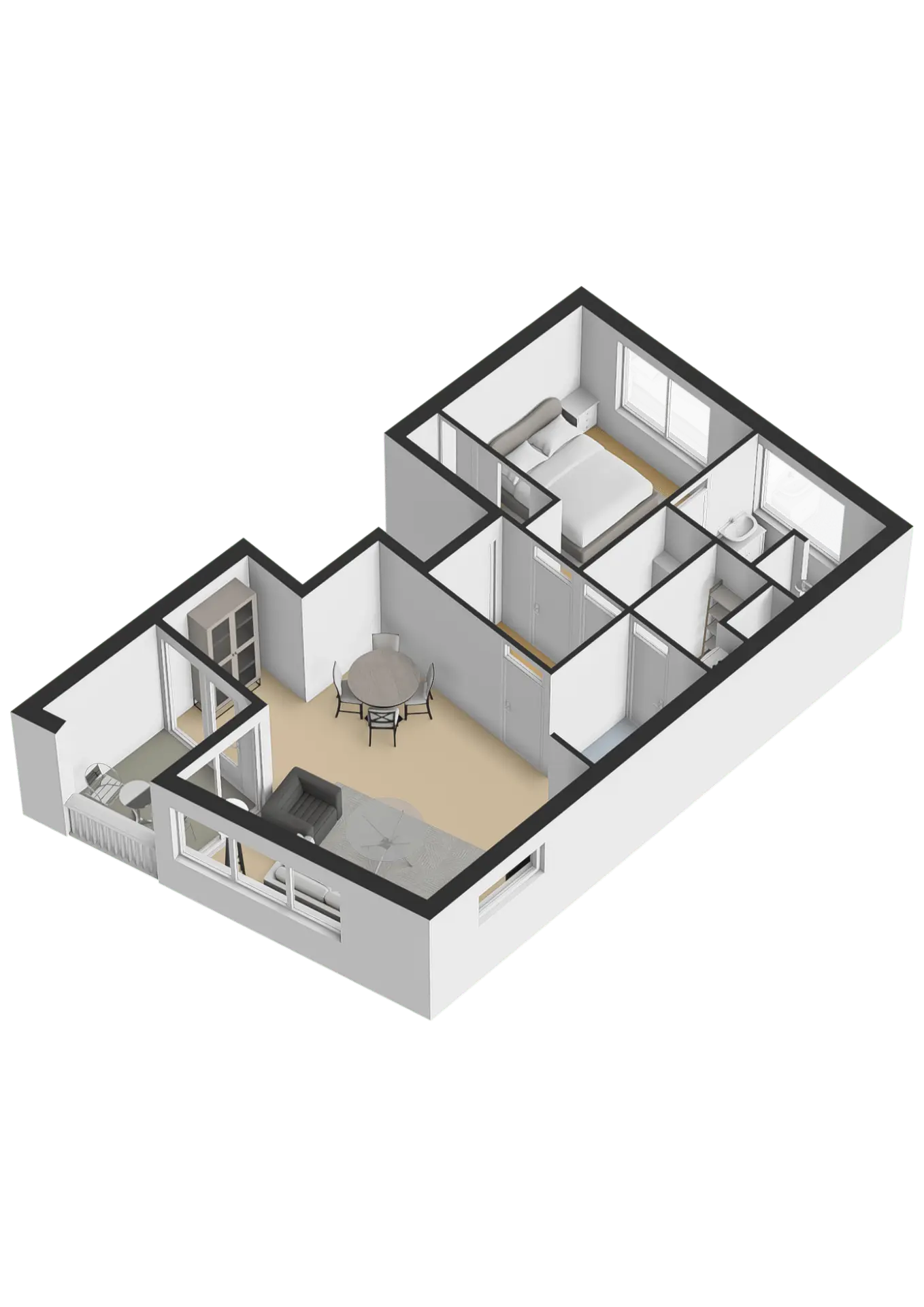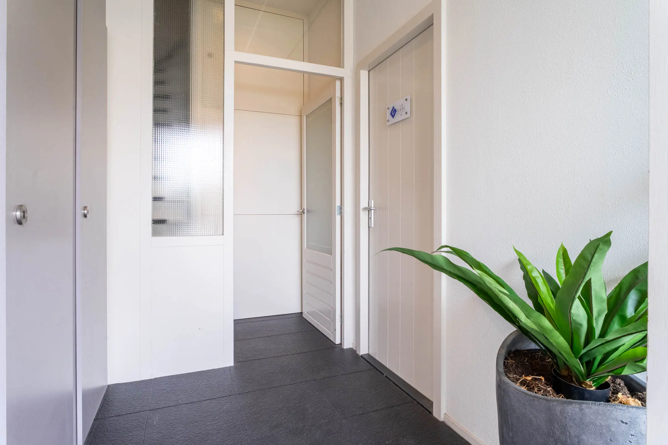 Bij de entree van het appartement kom je in de hal met meterkast, toilet en volop plaats voor garderobe. De hal geeft toegang geeft tot de woonkamer (voorzijde) of de slaapkamer aan de achterzijde.
