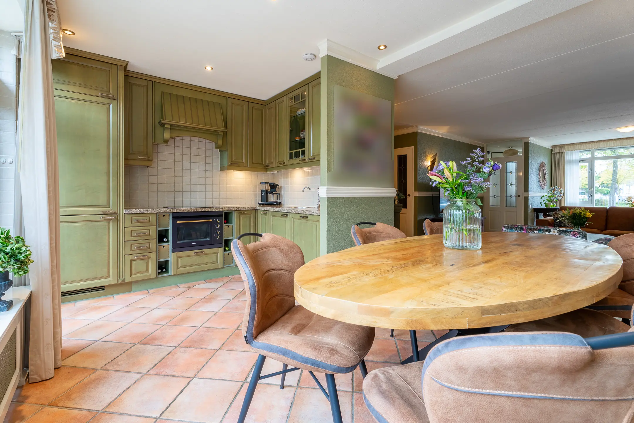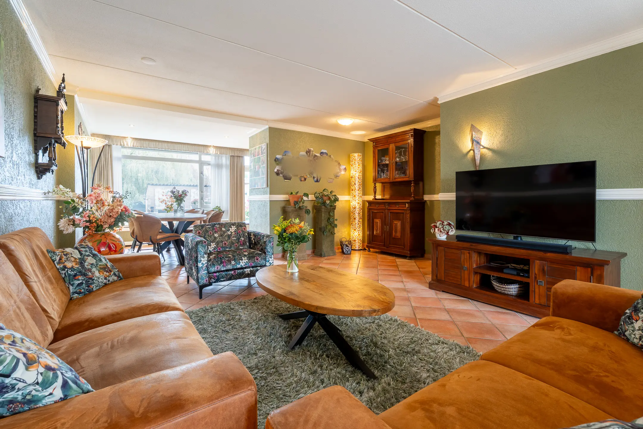 Royale en sfeervolle woonkamer met aan de achterzijde de keukenopstelling. Vanuit de zithoek heb je zicht op het voorgelegen speelplantsoen. Aan de achterzijde bevindt zich de keuken en heb je toegang tot de achtertuin. Onder de tegelvloer ligt vloerverwarming (als bijverwarming).