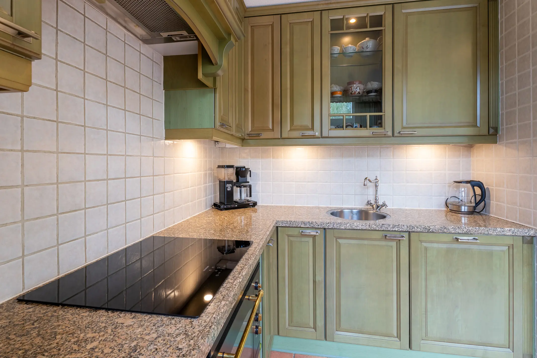 Open keuken met een hoekopstelling met diverse onder-/bovenkastjes en lades en inbouwapparatuur, zoals; een keramische kookplaat (2025), afzuigkap, combi-oven, vaatwasmachine (2024), koelkast en vrieskast.