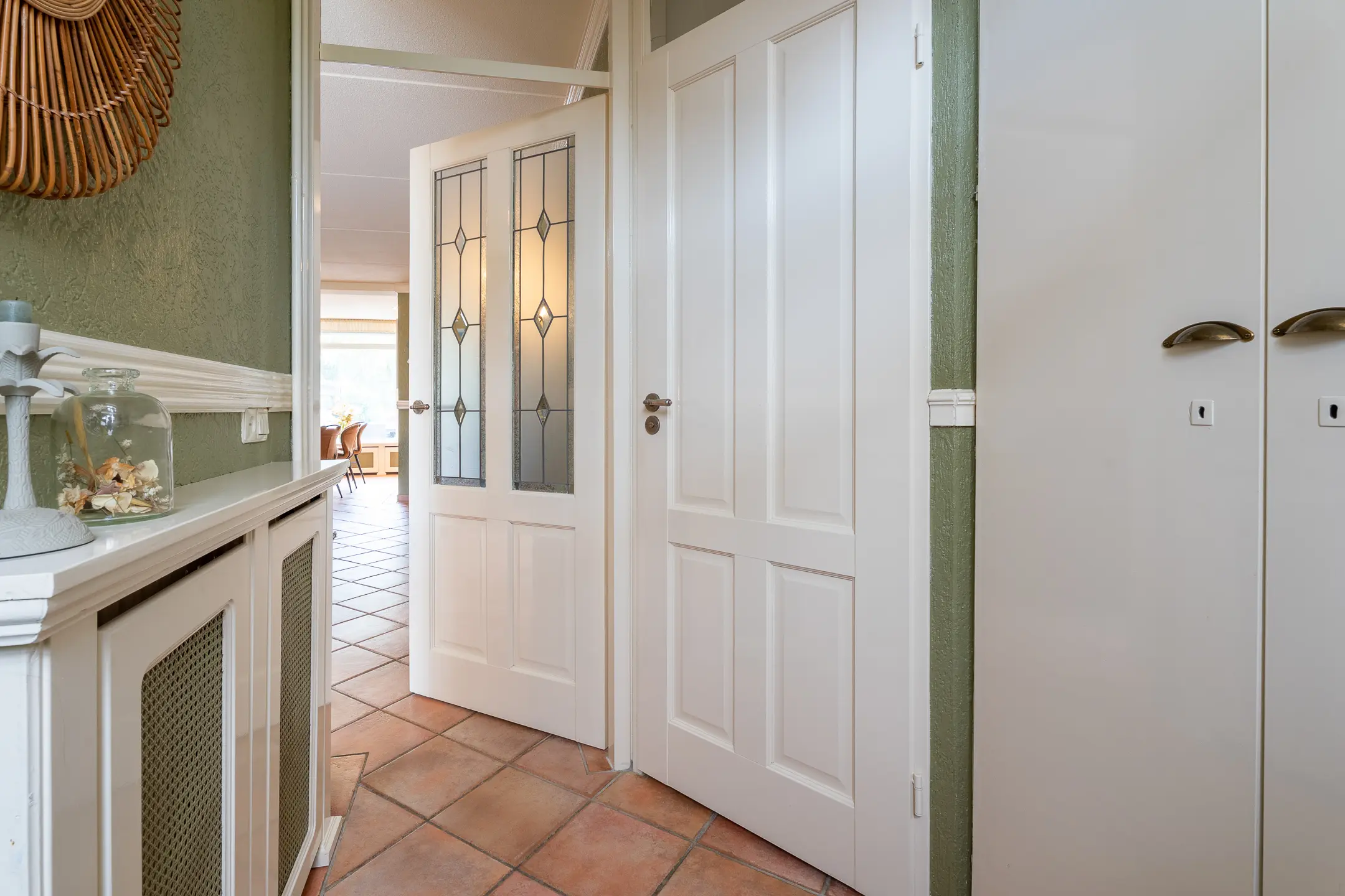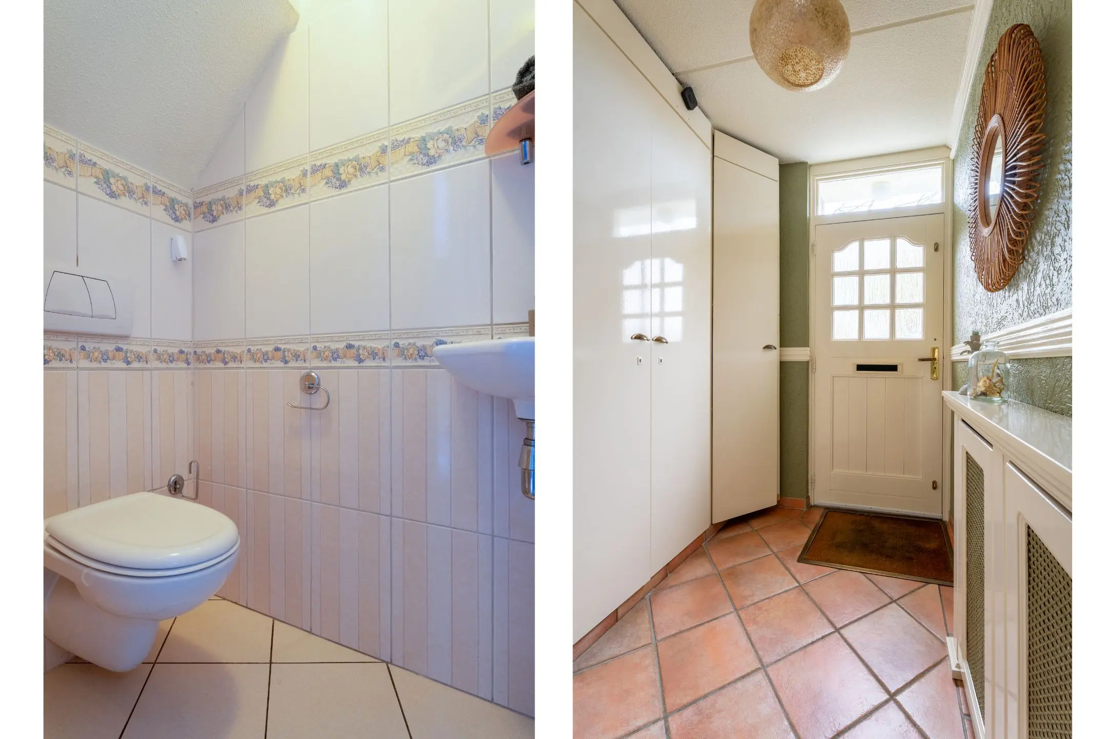 Via de entree kom je in de hal met hier de meterkast en de betegelde toiletruimte met zwevend toilet en een fonteintje. Vanuit de hal heb je toegang tot de uitgebouwde woonkamer. In de hal ligt een tegelvloer, welke doorloopt in de woonkamer en de keuken.