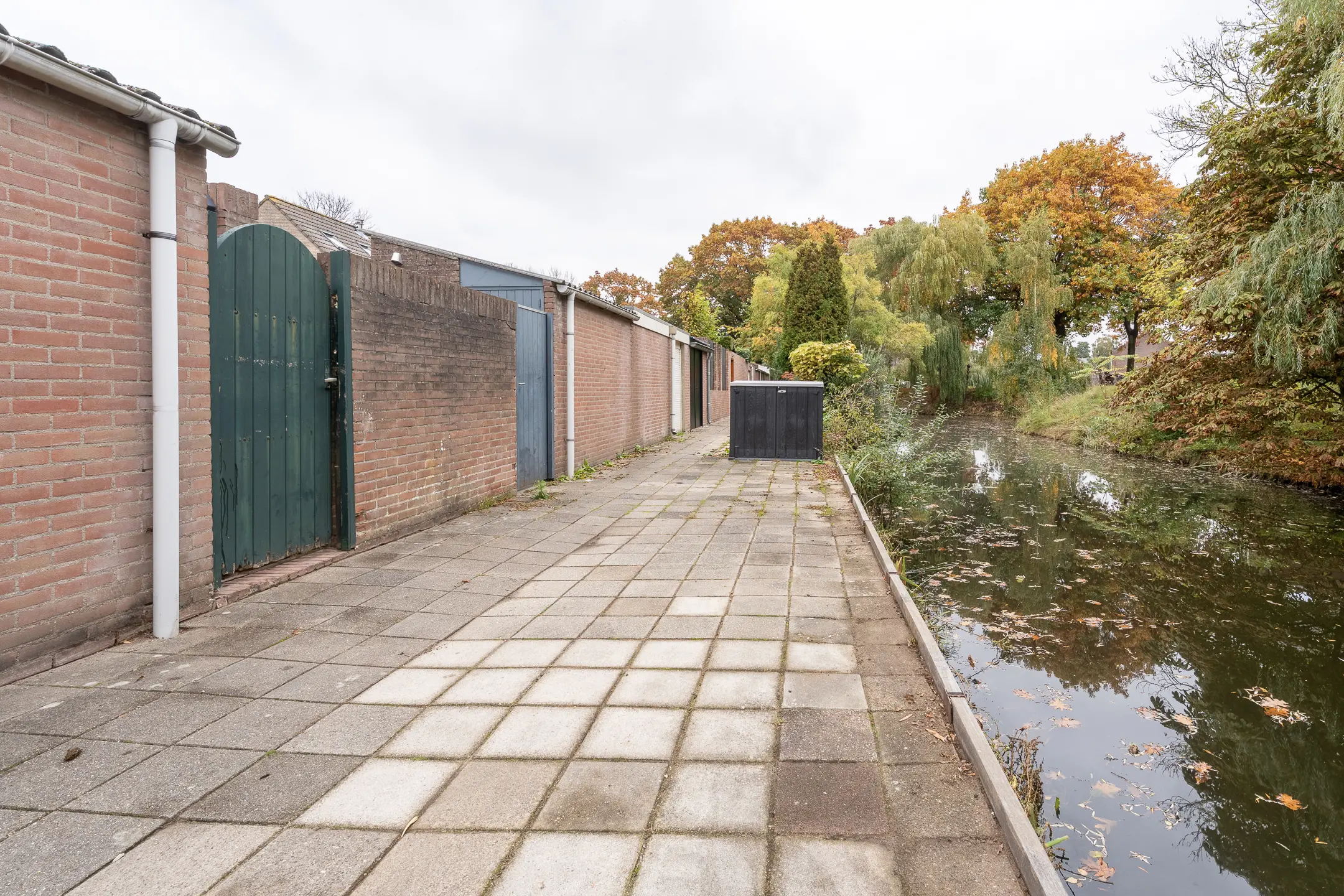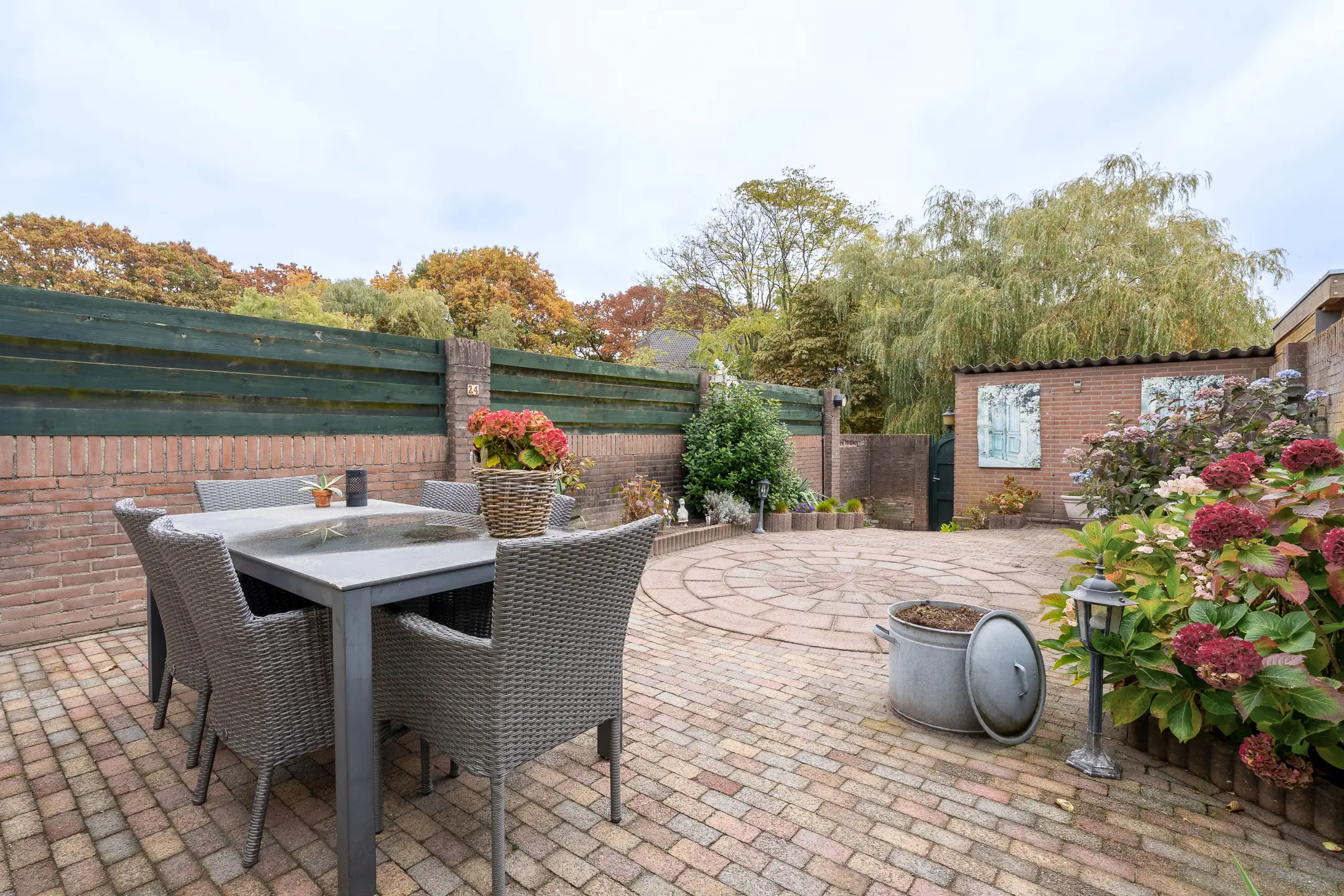 Diepe achtertuin gelegen op het oosten, maar door de lengte is daar ook volop zonneschijn aanwezig. Vanuit de tuin heb je vrij zicht op het achtergelegen groen. De tuin is voorzien van sierbestrating en diverse plantenborders. Achter in de tuin staat de stenen berging en is er een achterom. Deze achterom komt uit op een breed pad grenzend aan een waterpartij.