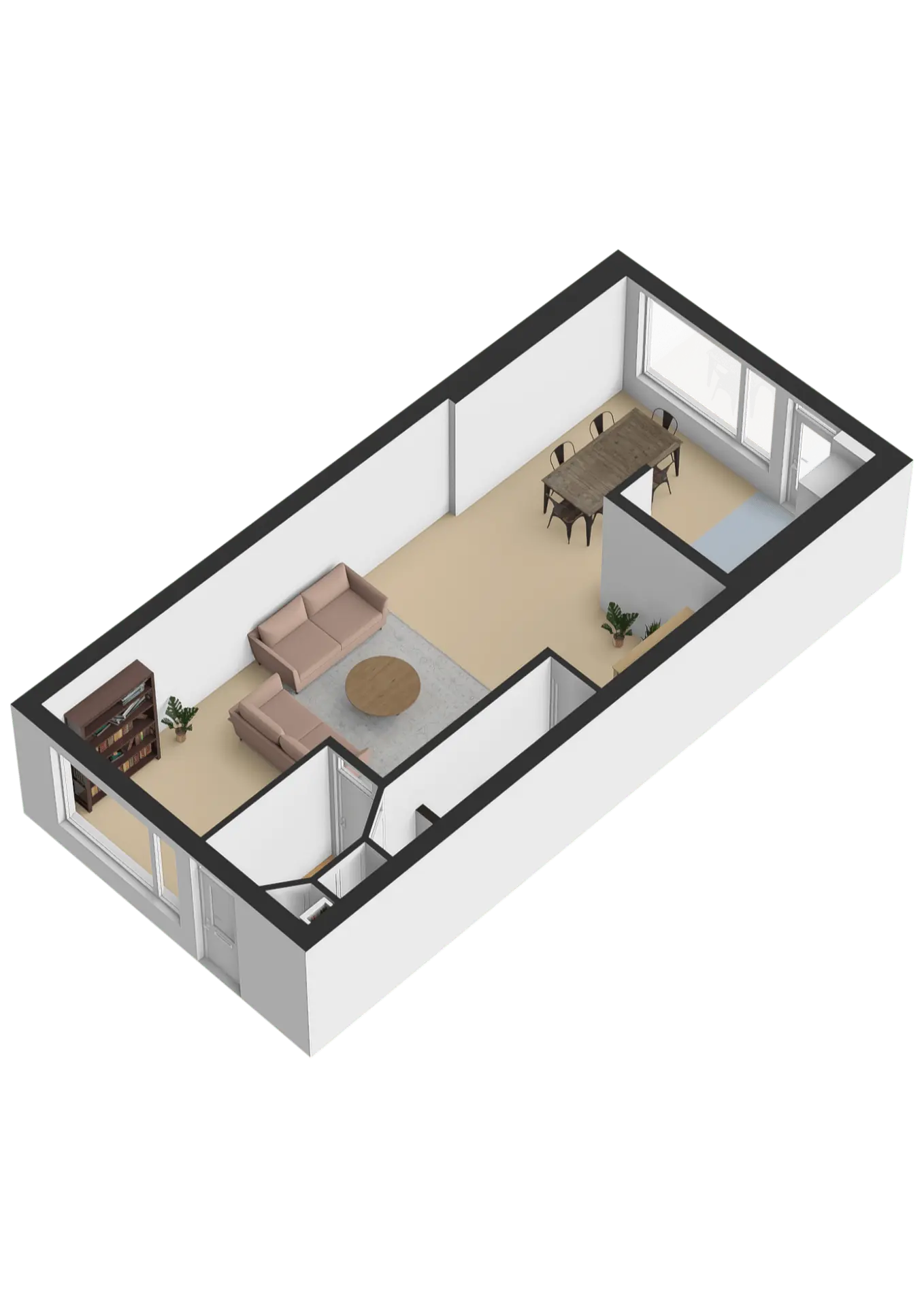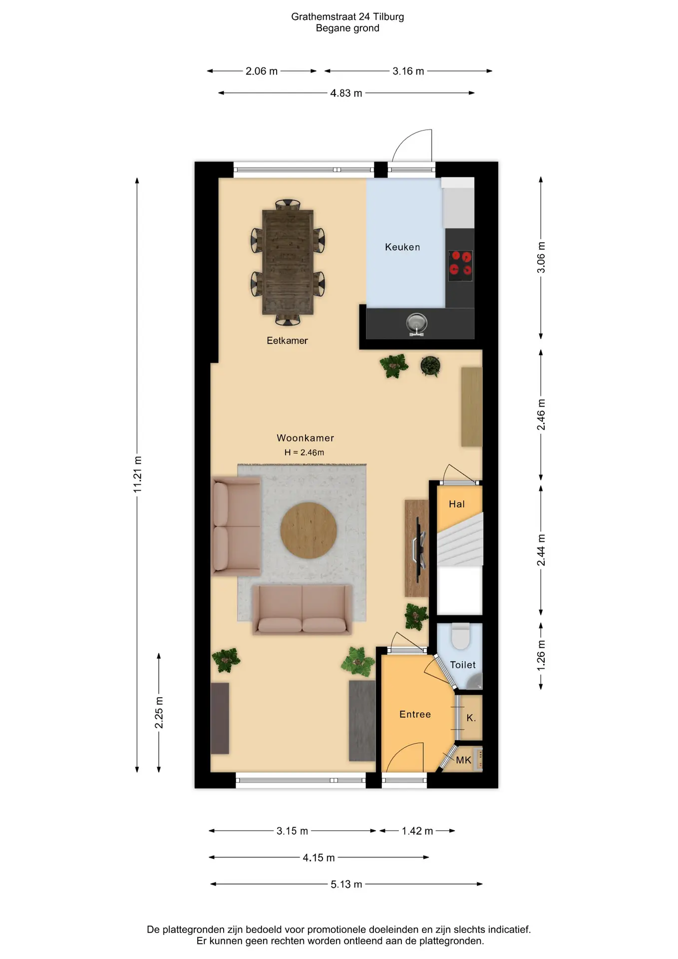 Op de begane grond bevinden zich de hal, de uitgebouwde woonkamer en de keukenruimte.
