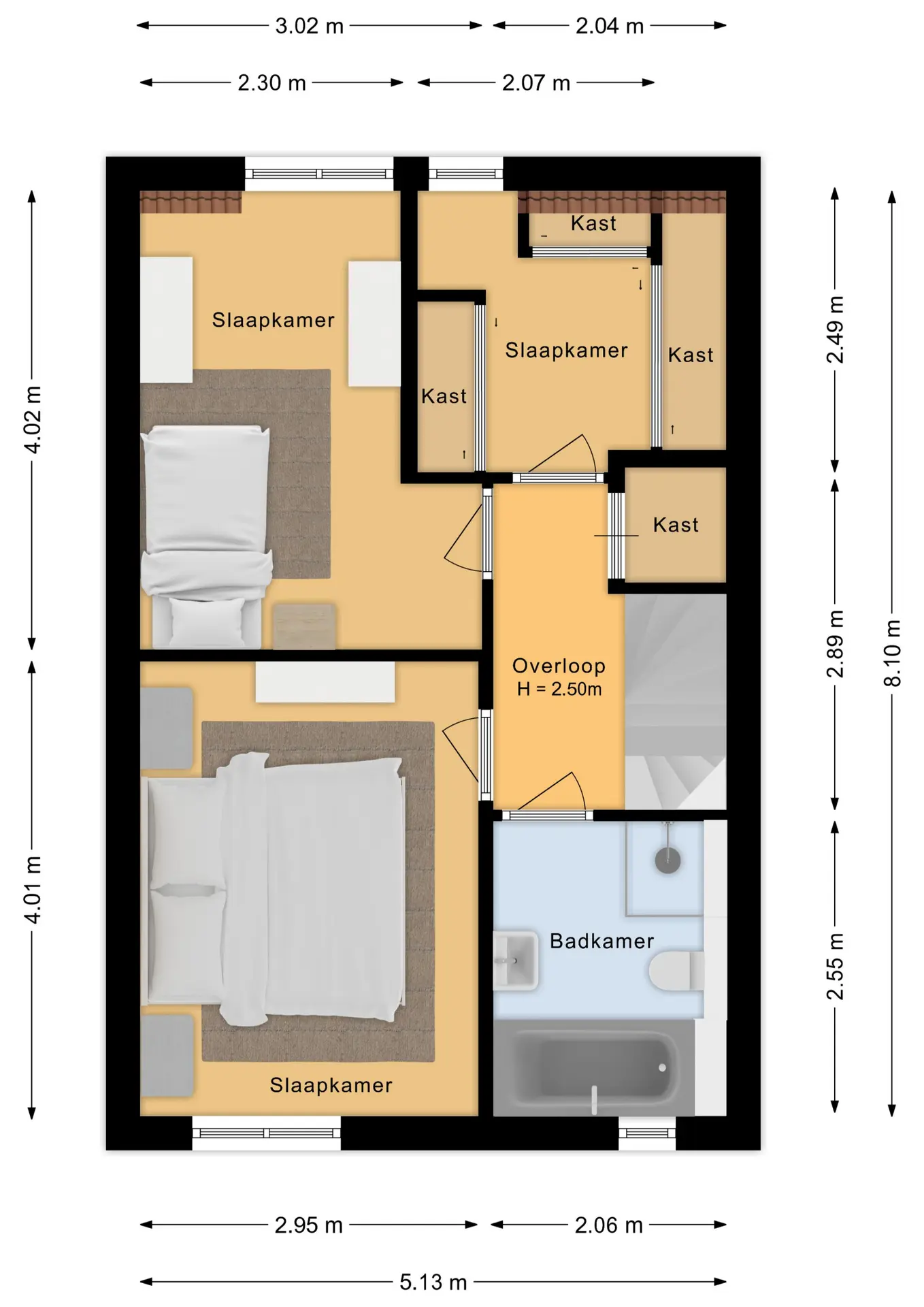 Op de eerste verdieping bevinden zich de overloop met bergruimte en drie slaapkamers.