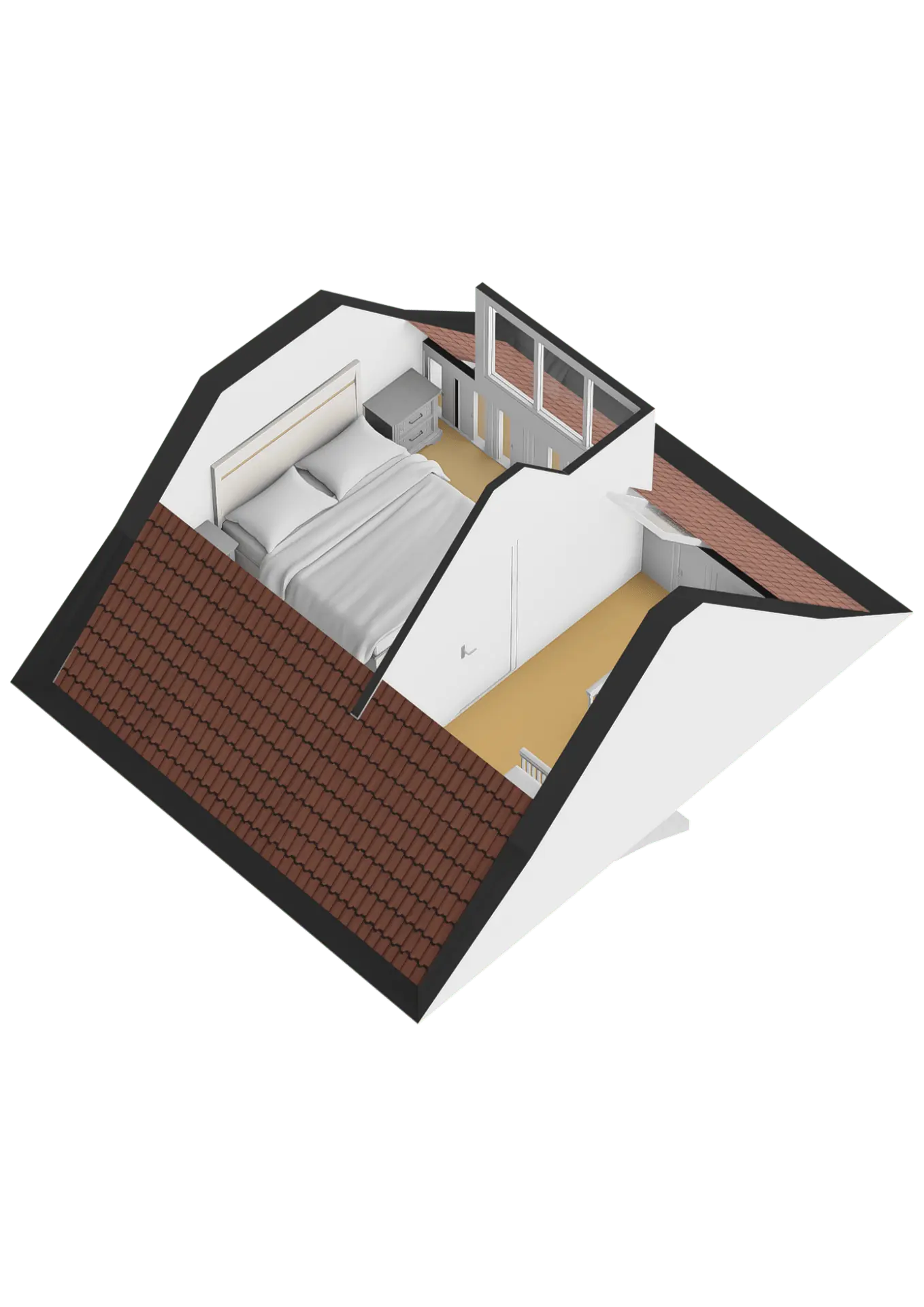 Slaapkamer IV (3m90 x 3m01) met dakkapel en bergruimte. Boven deze slaapkamer heb je nog een praktische bergruimte toegankelijk via een vlizoluik.