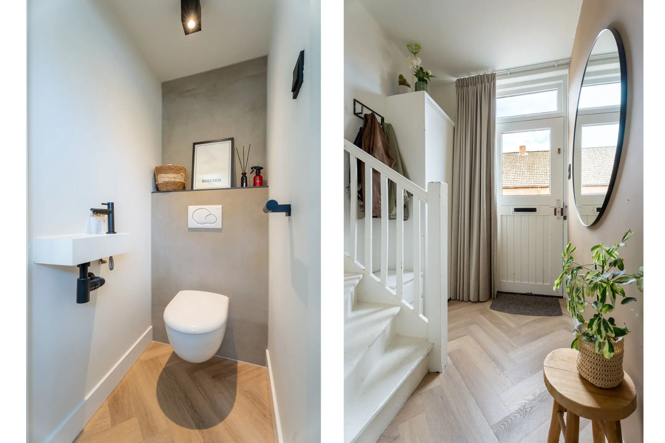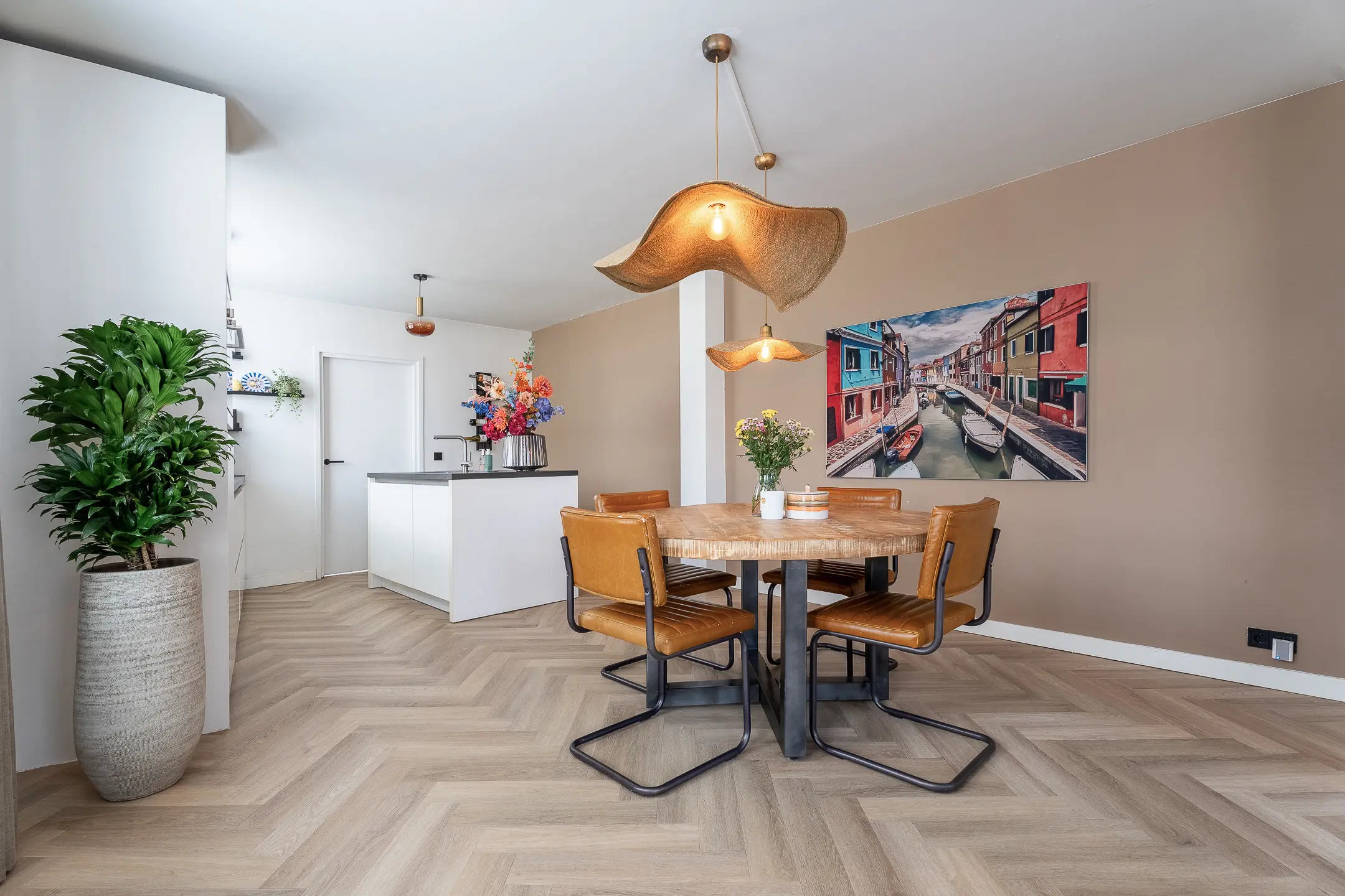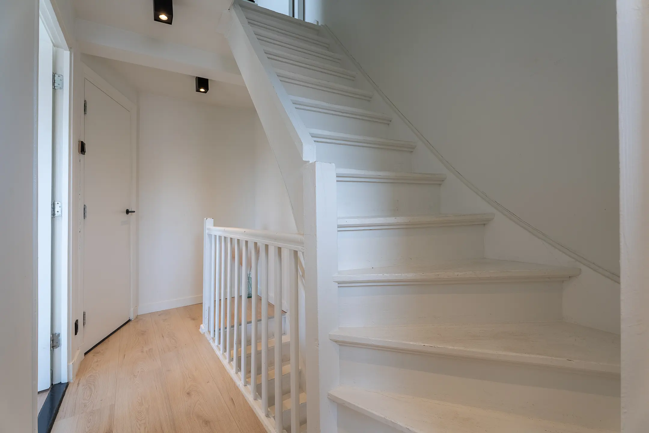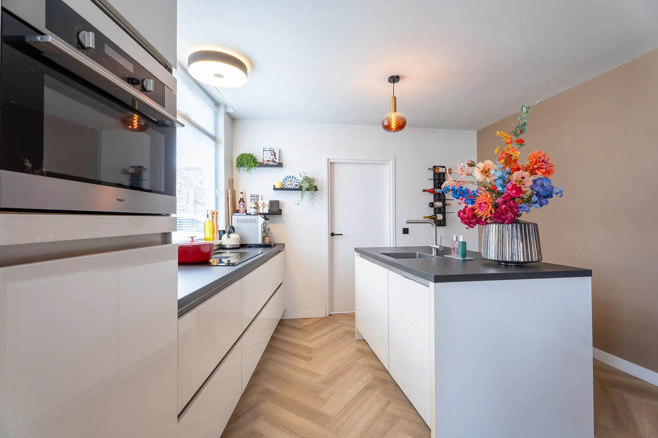 Je komt binnen in de hal met trapopgang en meterkast. Vanuit hier stap je de lichte en sfeervolle woonkamer binnen, afgewerkt met strak stucwerk en een stijlvolle visgraat pvc-vloer.