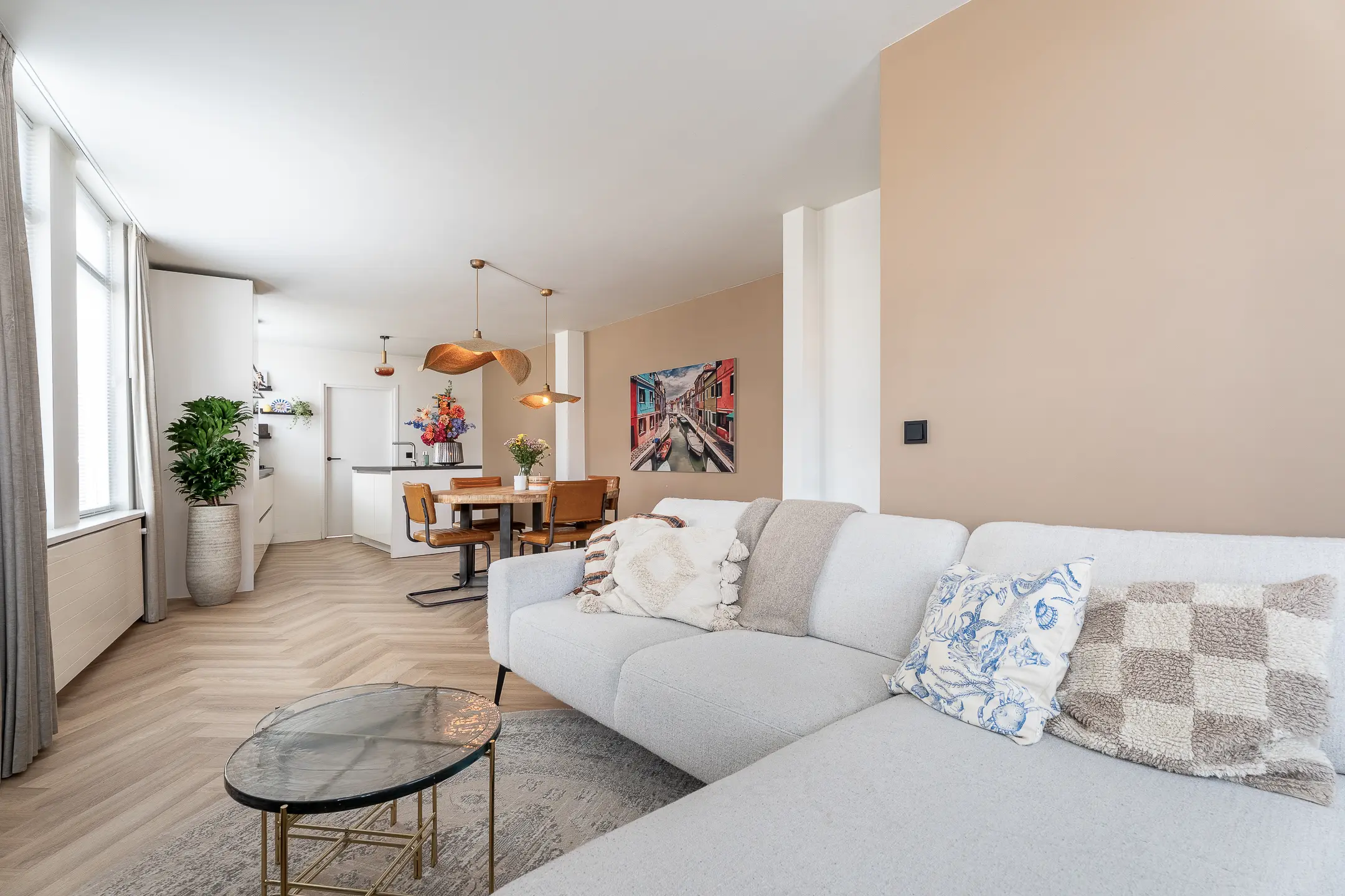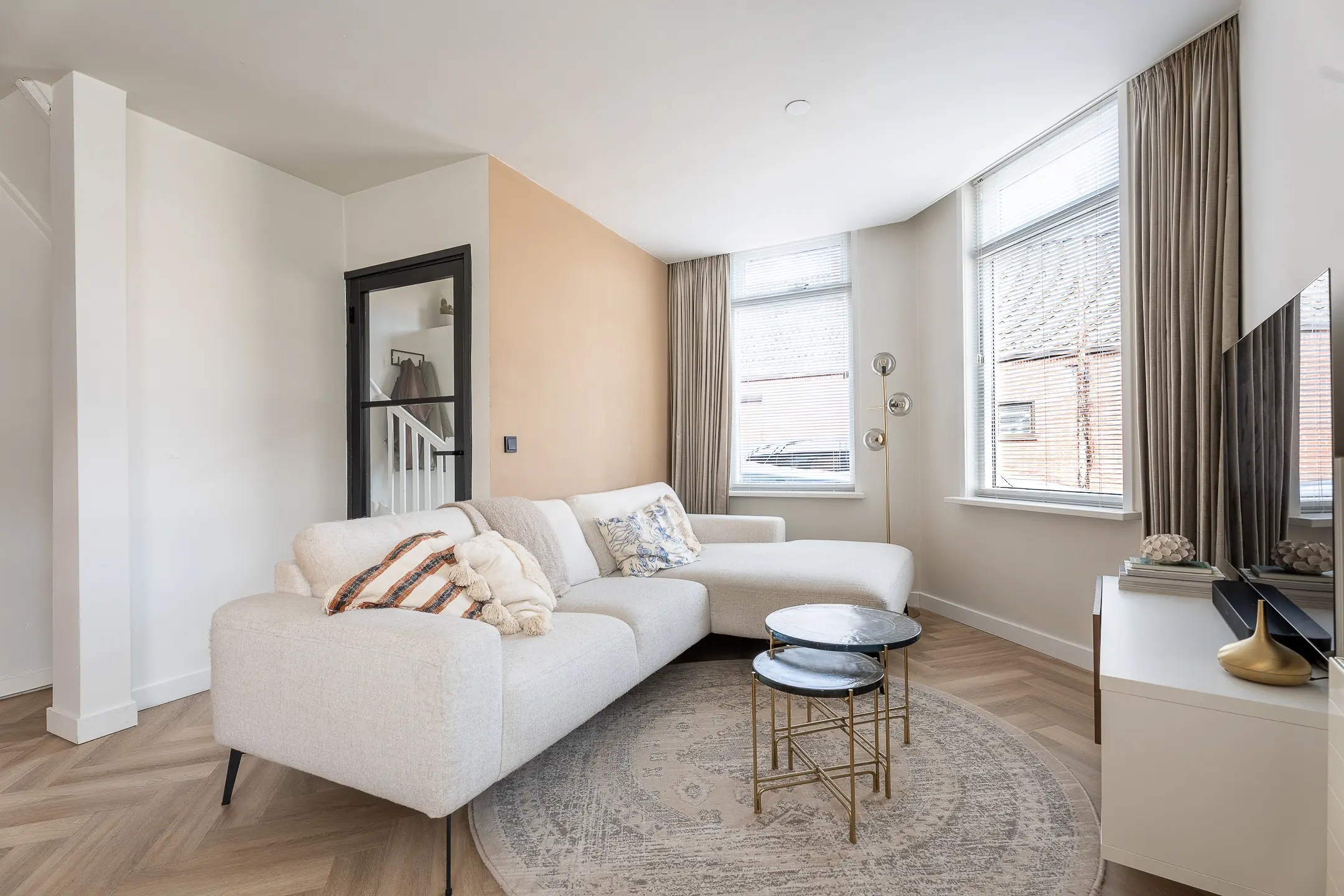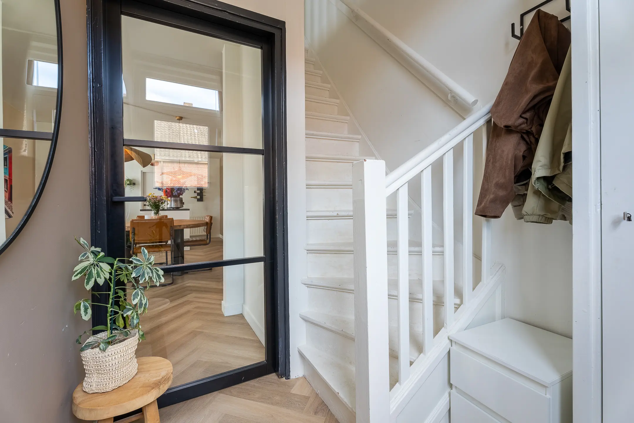 Je komt binnen in de hal met trapopgang en meterkast. Vanuit hier stap je de lichte en sfeervolle woonkamer binnen, afgewerkt met strak stucwerk en een stijlvolle visgraat pvc-vloer.