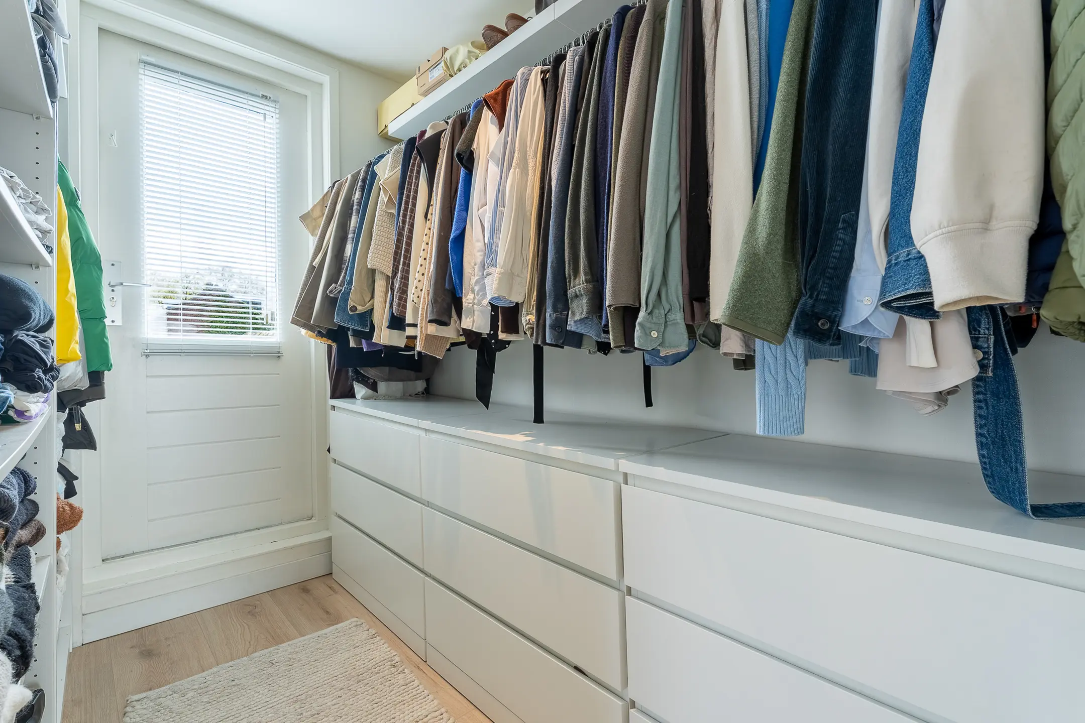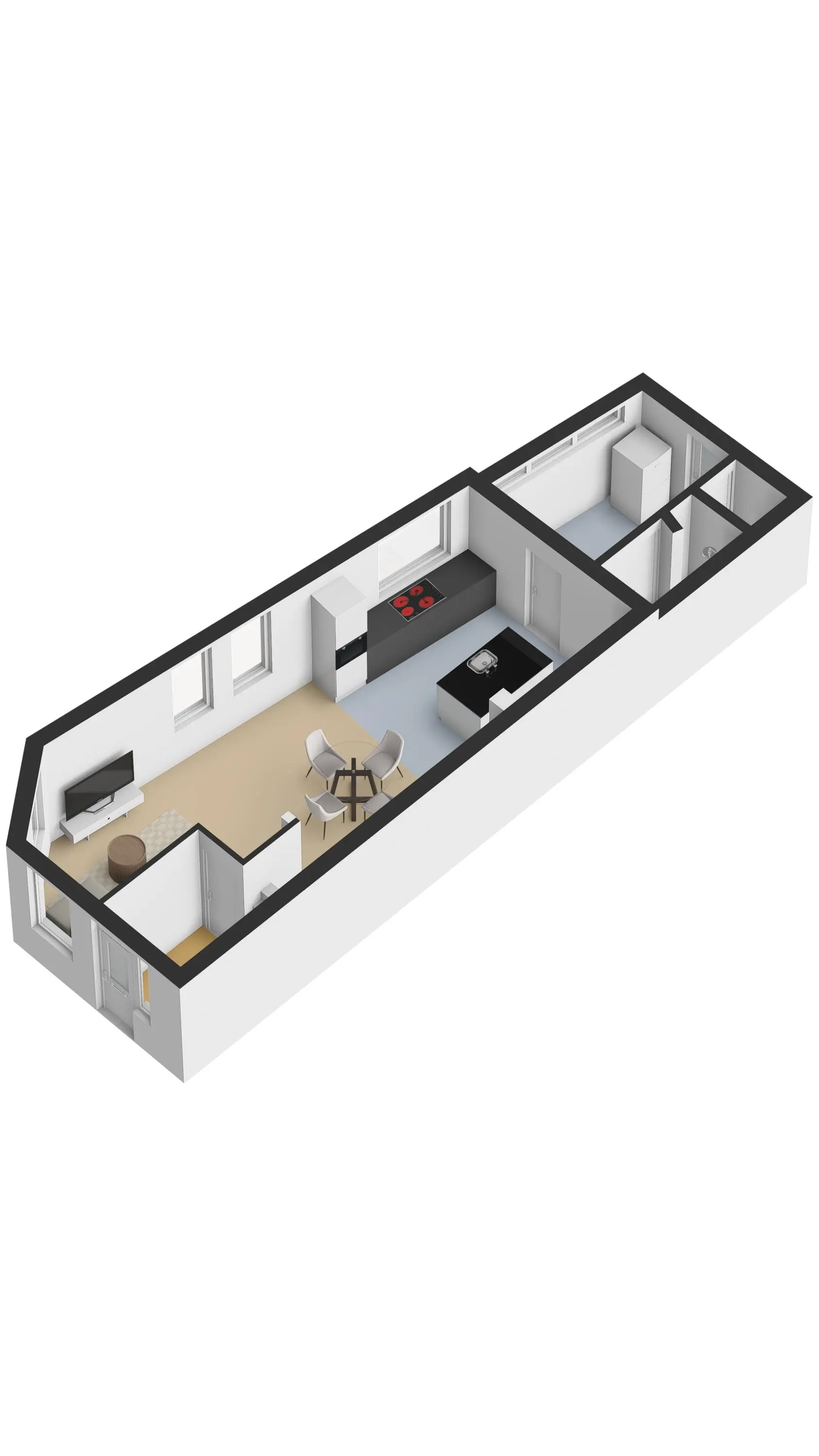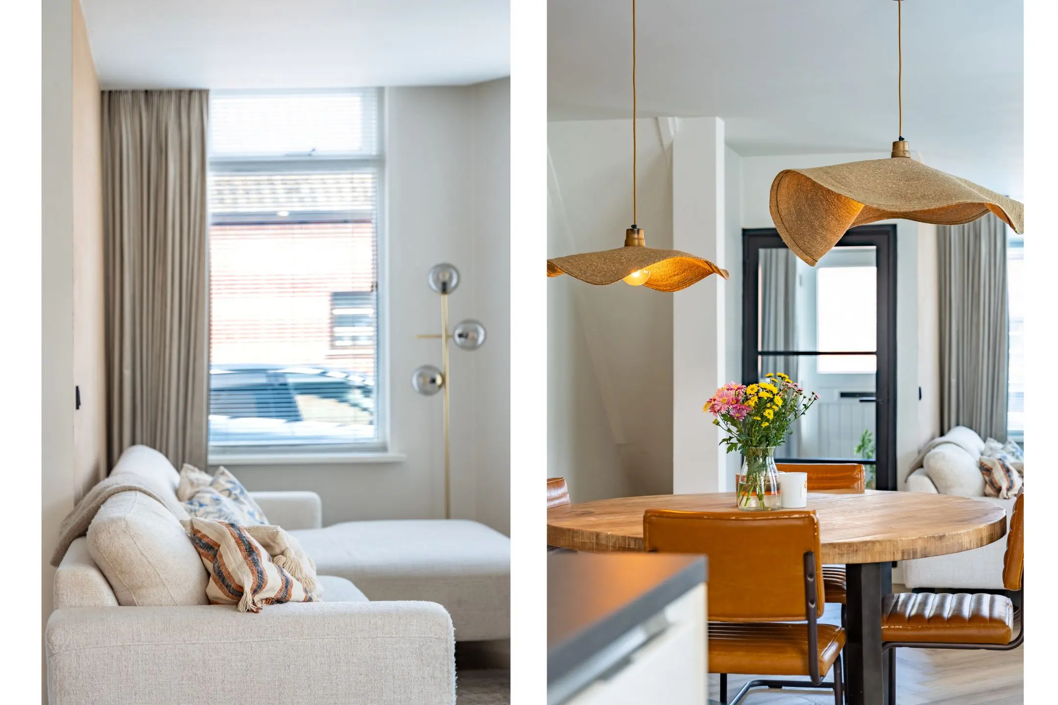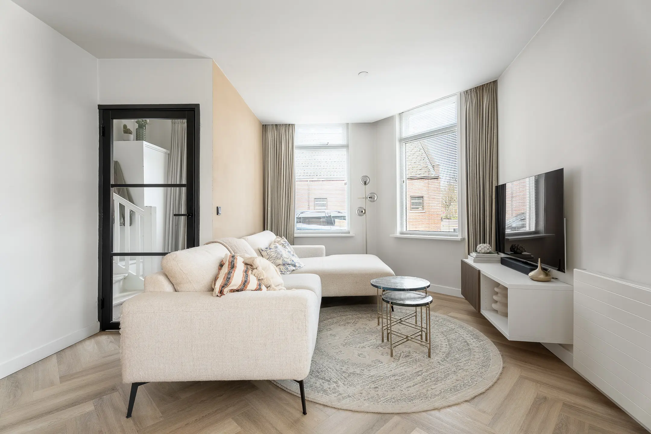 Je komt binnen in de hal met trapopgang en meterkast. Vanuit hier stap je de lichte en sfeervolle woonkamer binnen, afgewerkt met strak stucwerk en een stijlvolle visgraat pvc-vloer.