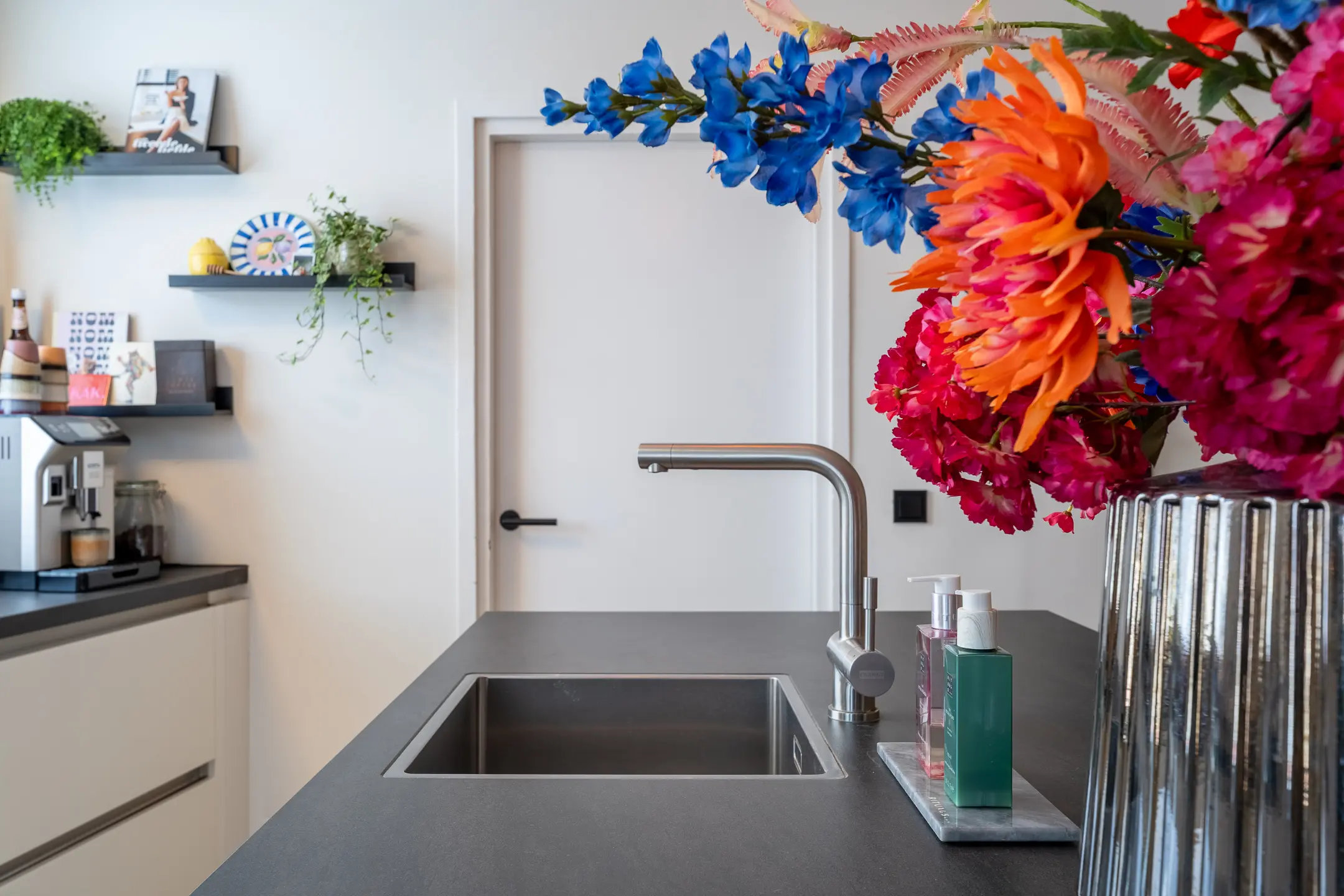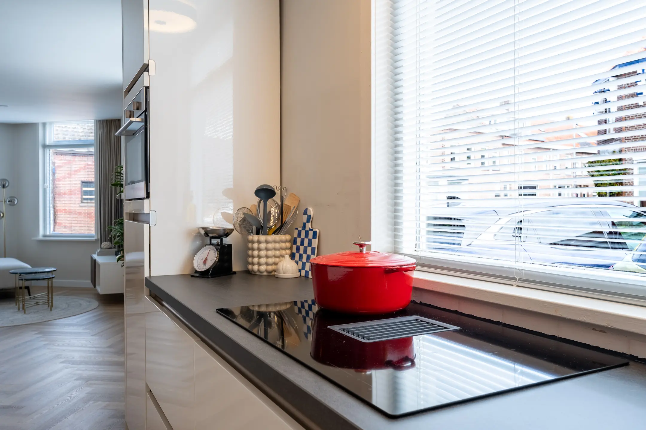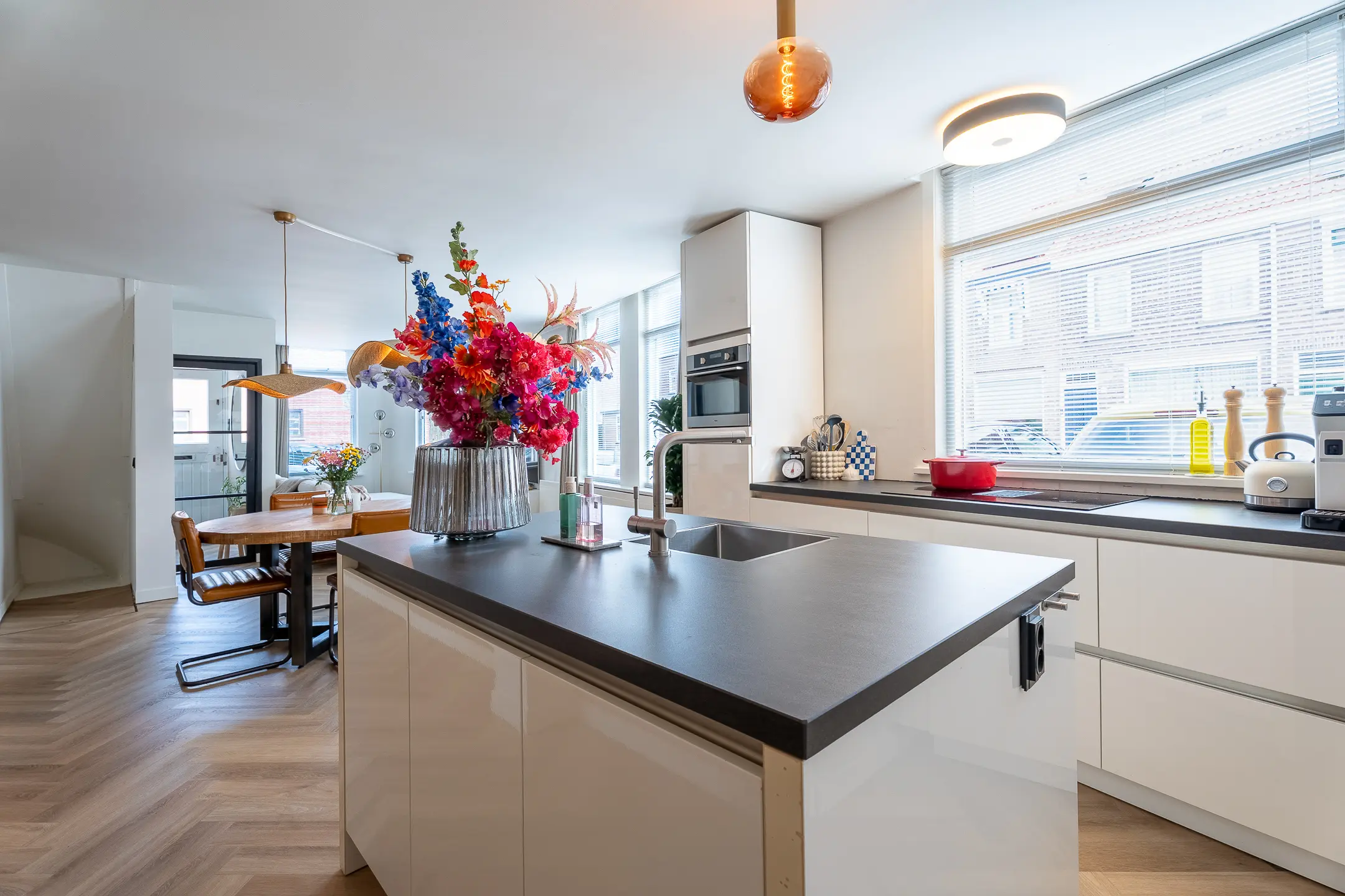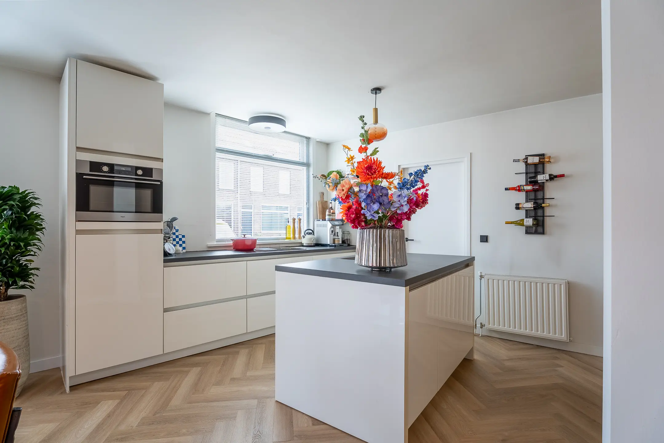 De moderne open keuken vormt het hart van de woning en is uitgevoerd met een fraai spoeleiland en een keramisch werkblad. Uiteraard voorzien van alle gewenste inbouwapparatuur: een inductiekookplaat met downdraftafzuiging, koelkast, combioven en vaatwasser.