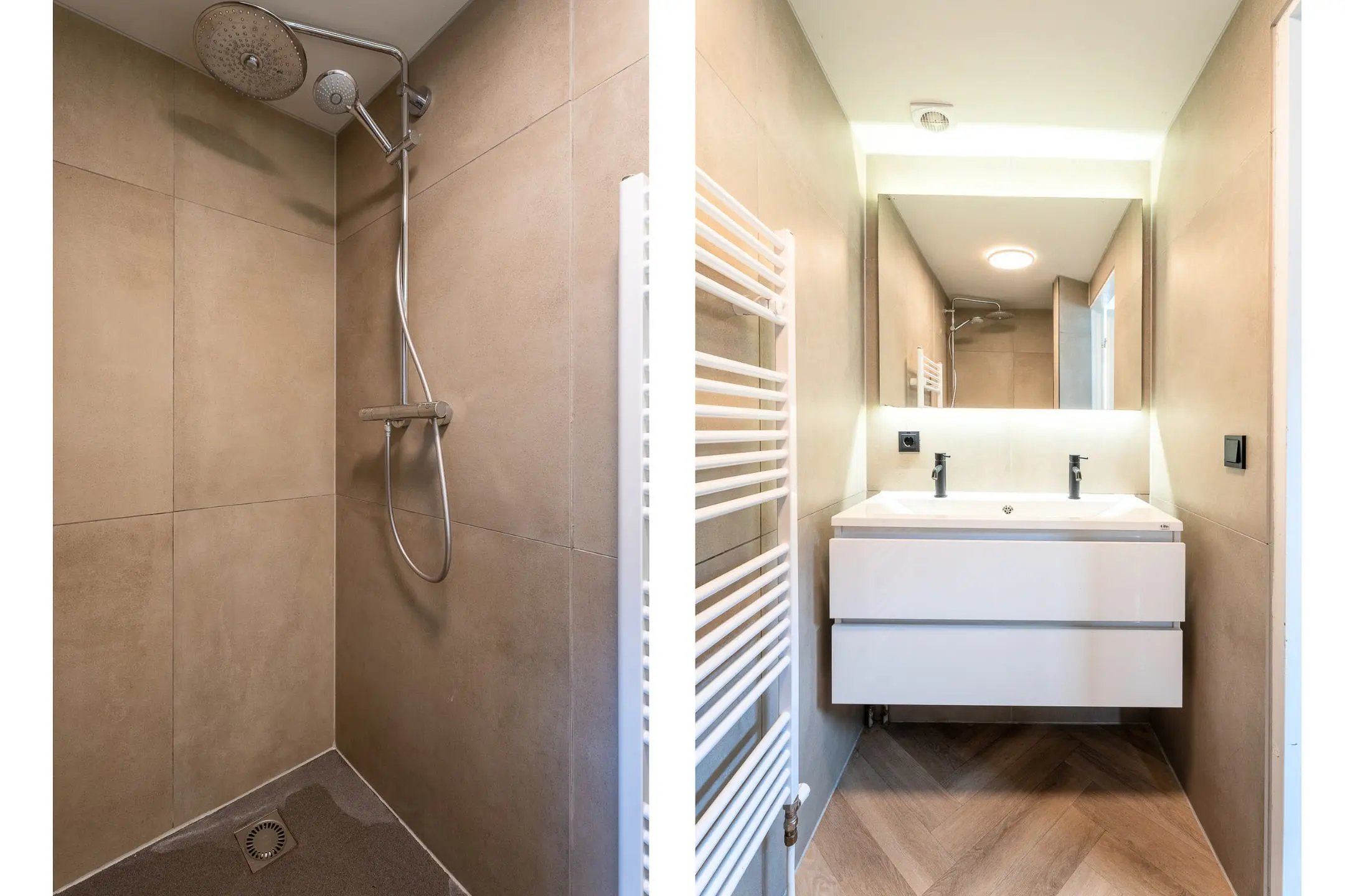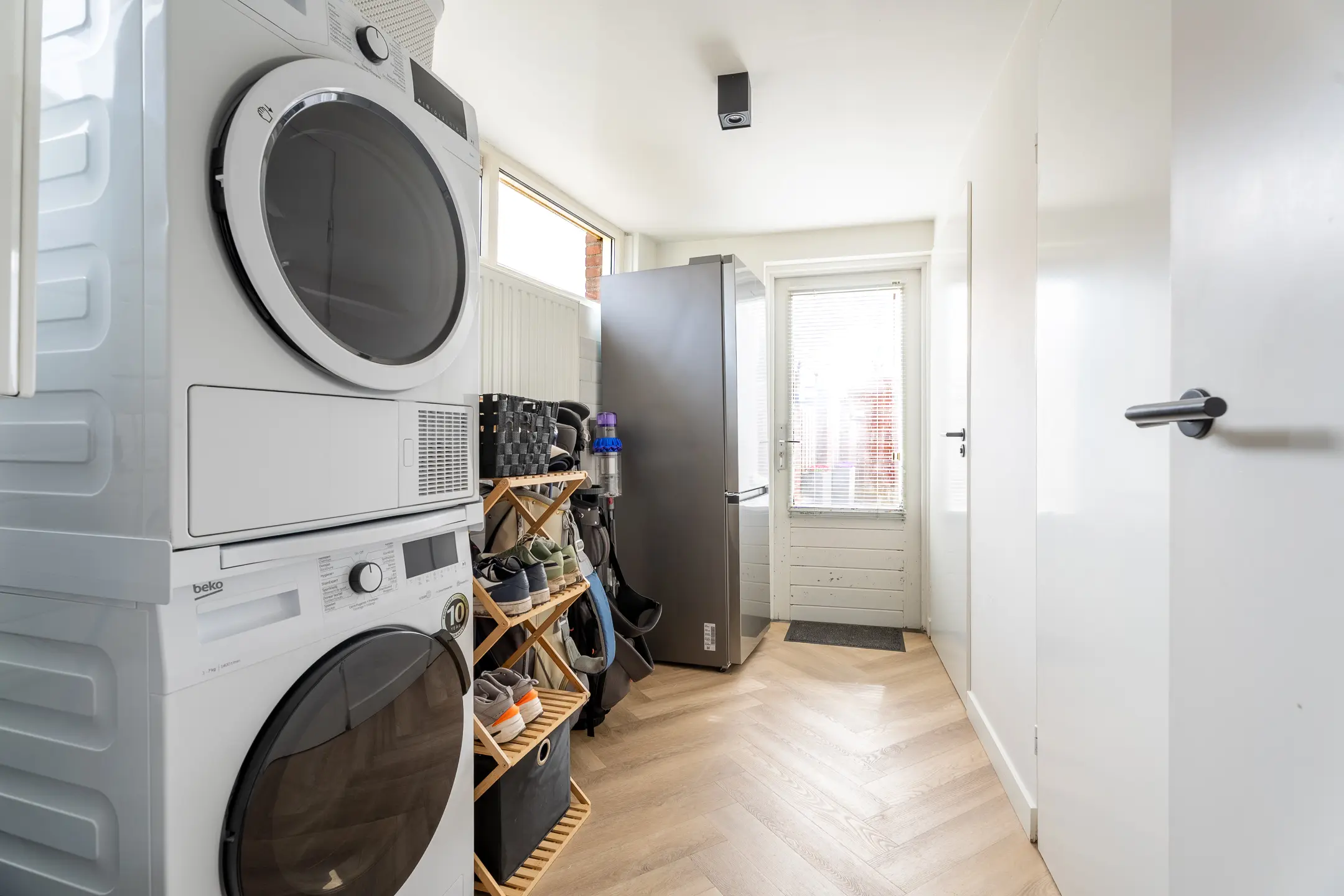 Aansluitend vind je de praktische bijkeuken met opstelling van de cv-ketel en aansluitingen voor wasapparatuur. Hier bevinden zich ook het moderne toilet en de badkamer, uitgerust met een douche en een wastafelmeubel. Vanuit de bijkeuken heb je direct toegang tot de tuin.