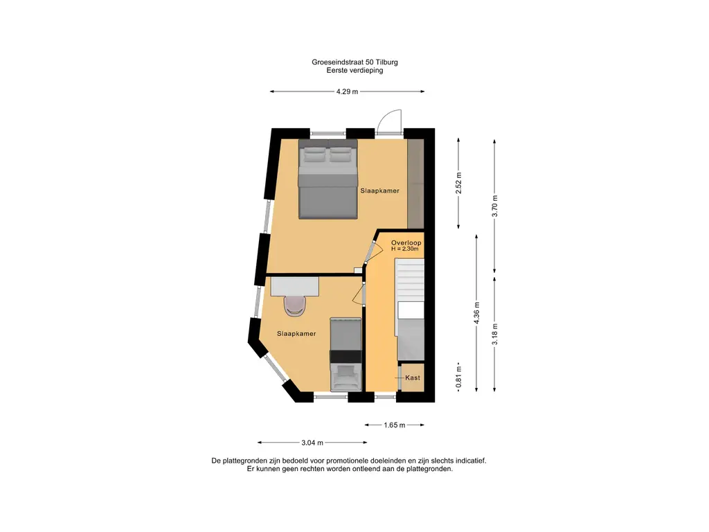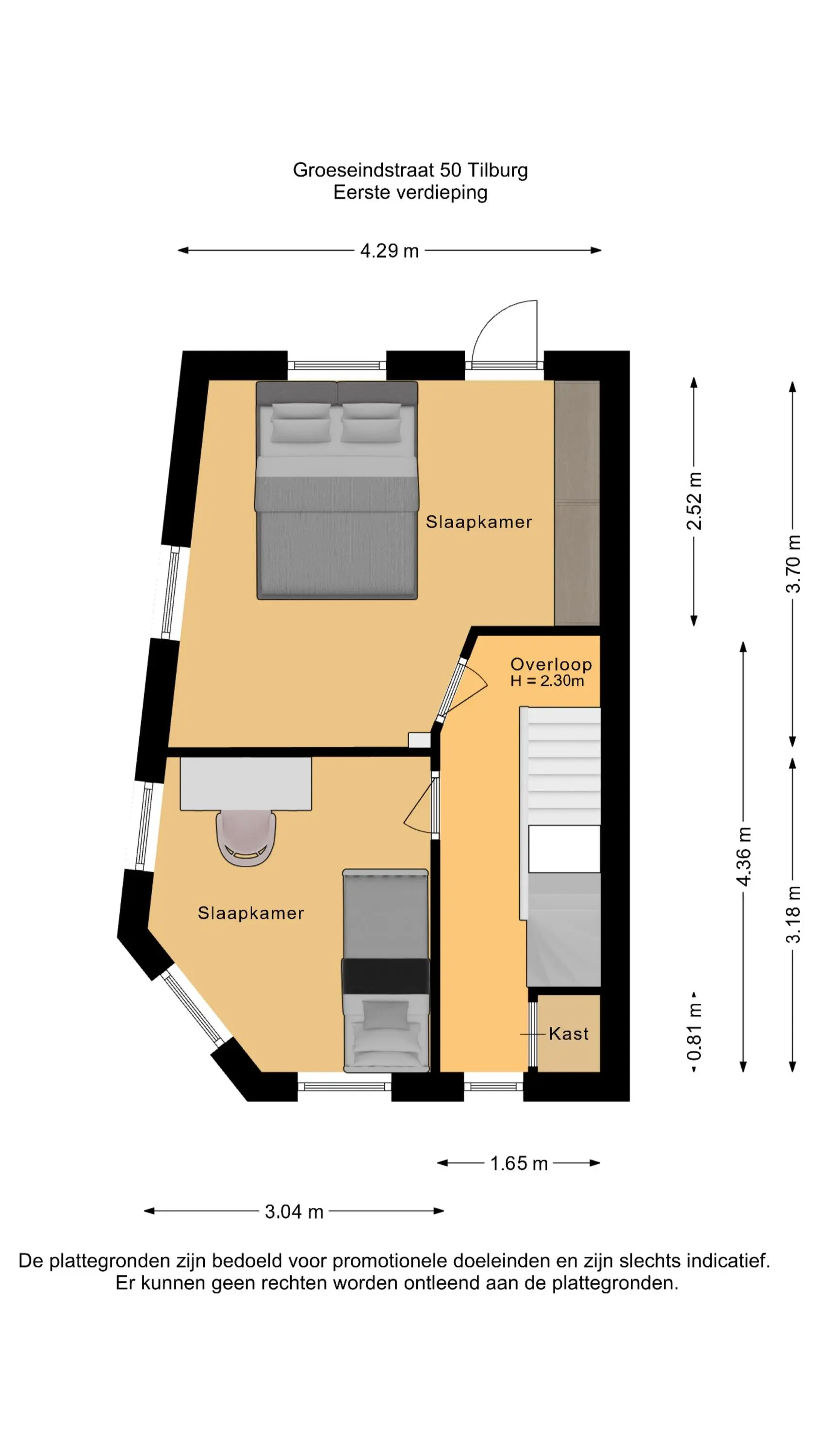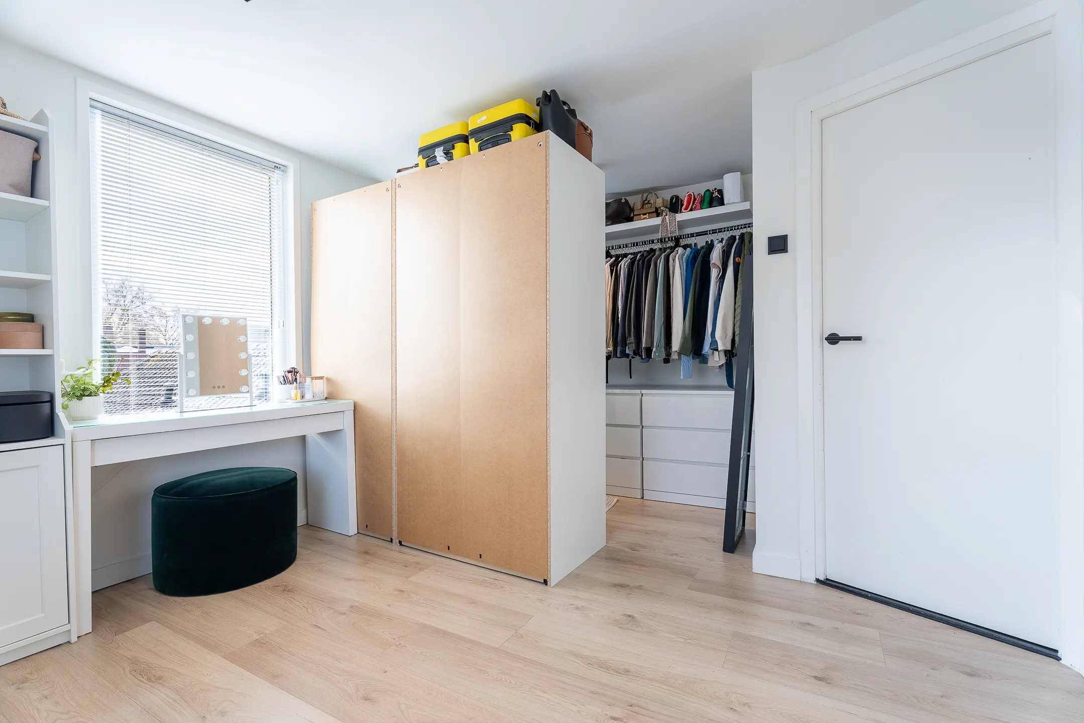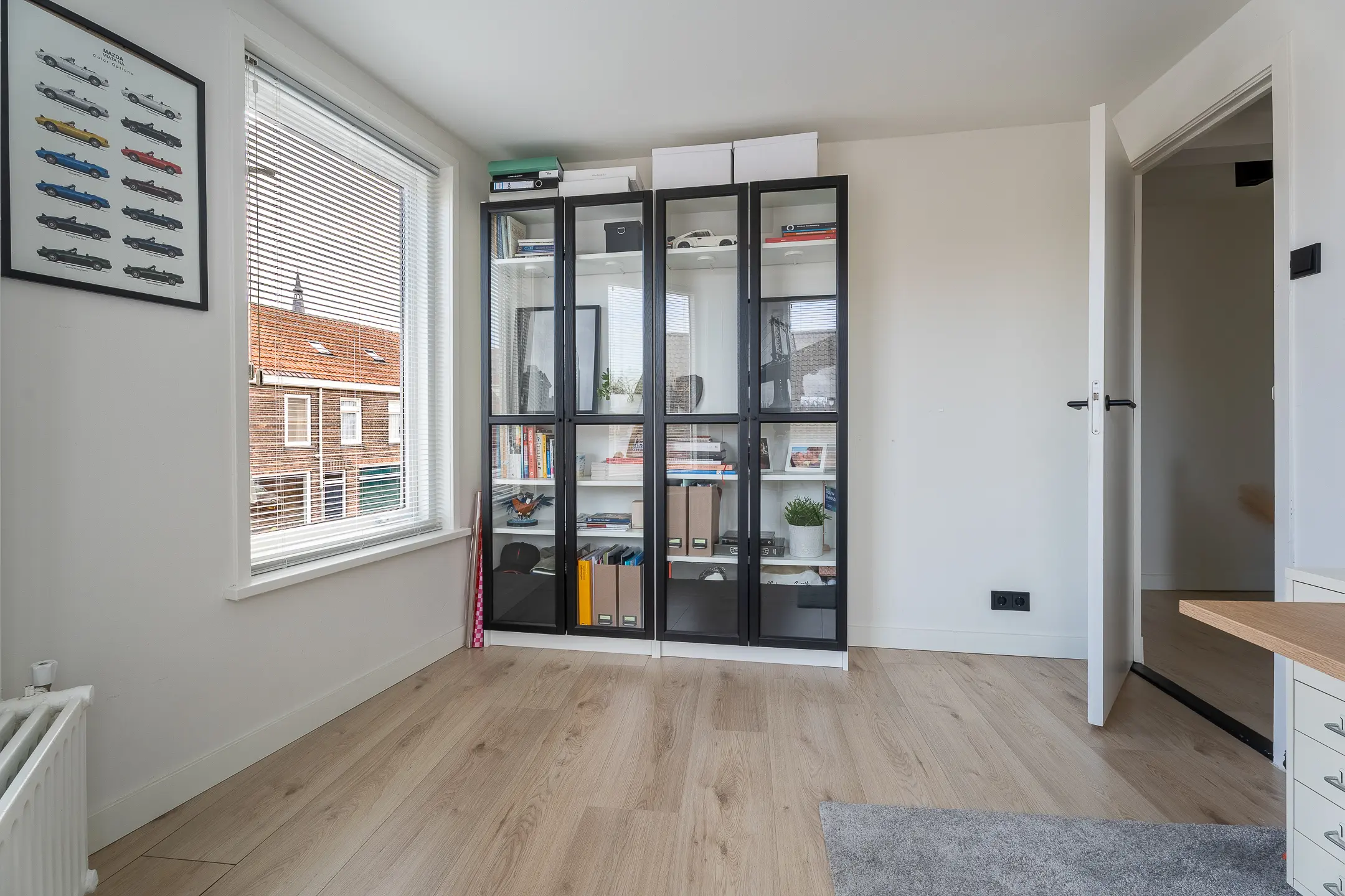 De overloop met vaste kast geeft toegang tot twee comfortabele slaapkamers. De achterkamer biedt toegang tot het platte dak, terwijl de voorslaapkamer een vrij uitzicht heeft over de straat. Beide kamers zijn netjes afgewerkt met een laminaatvloer.