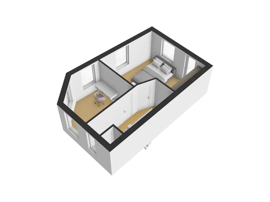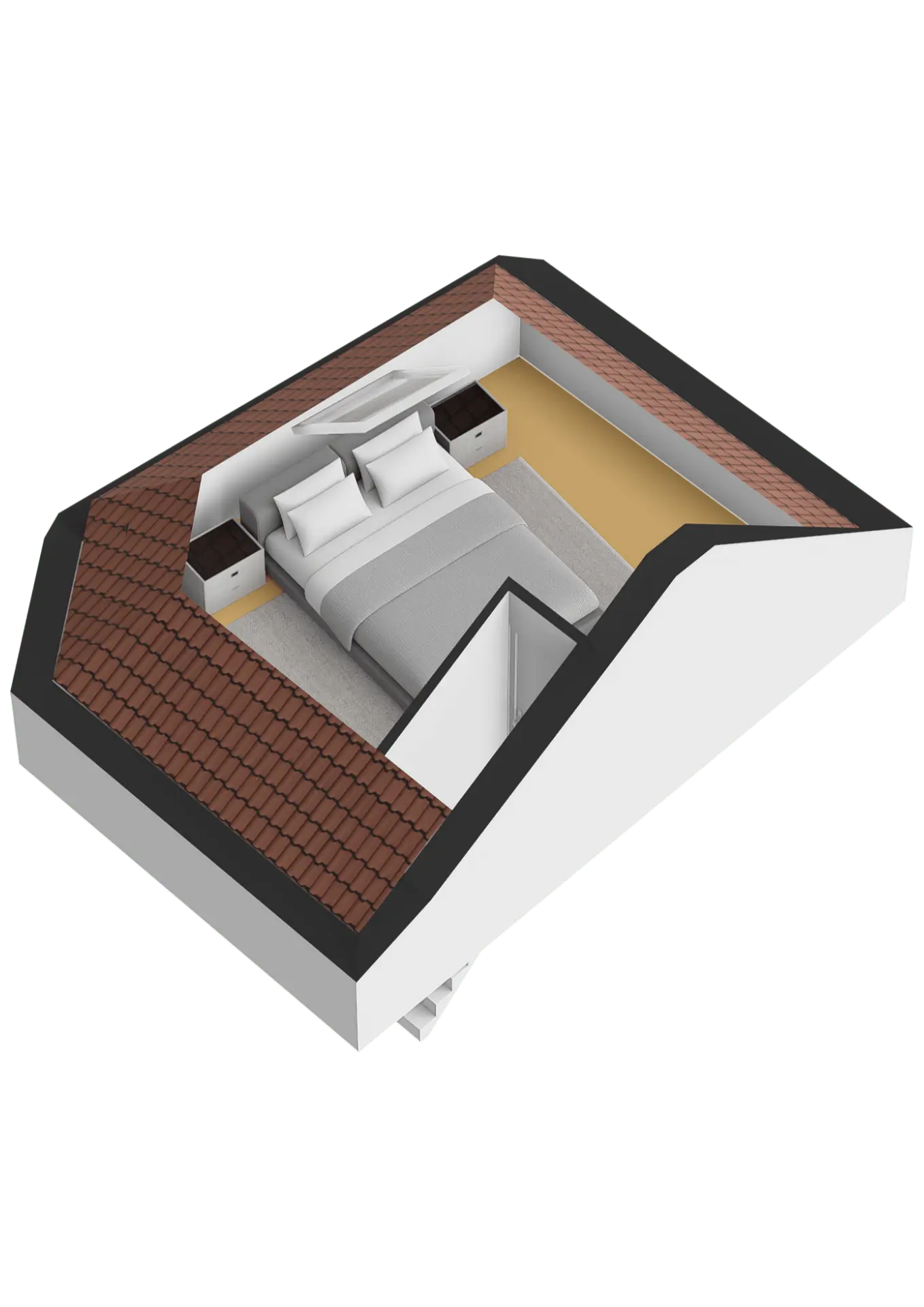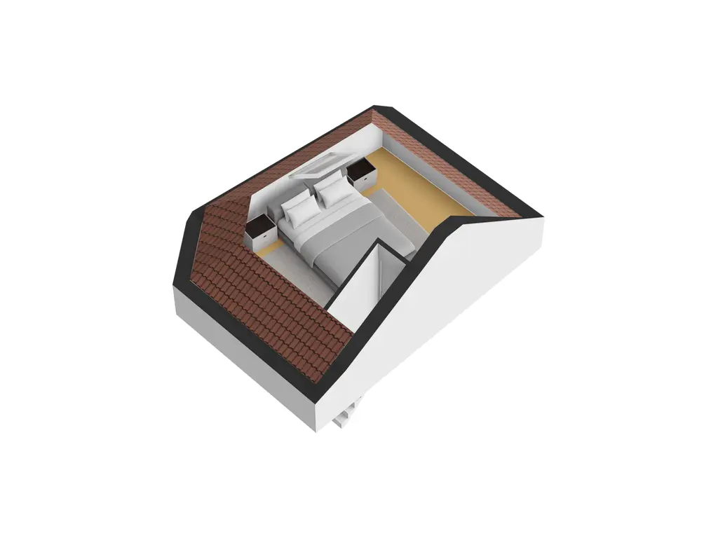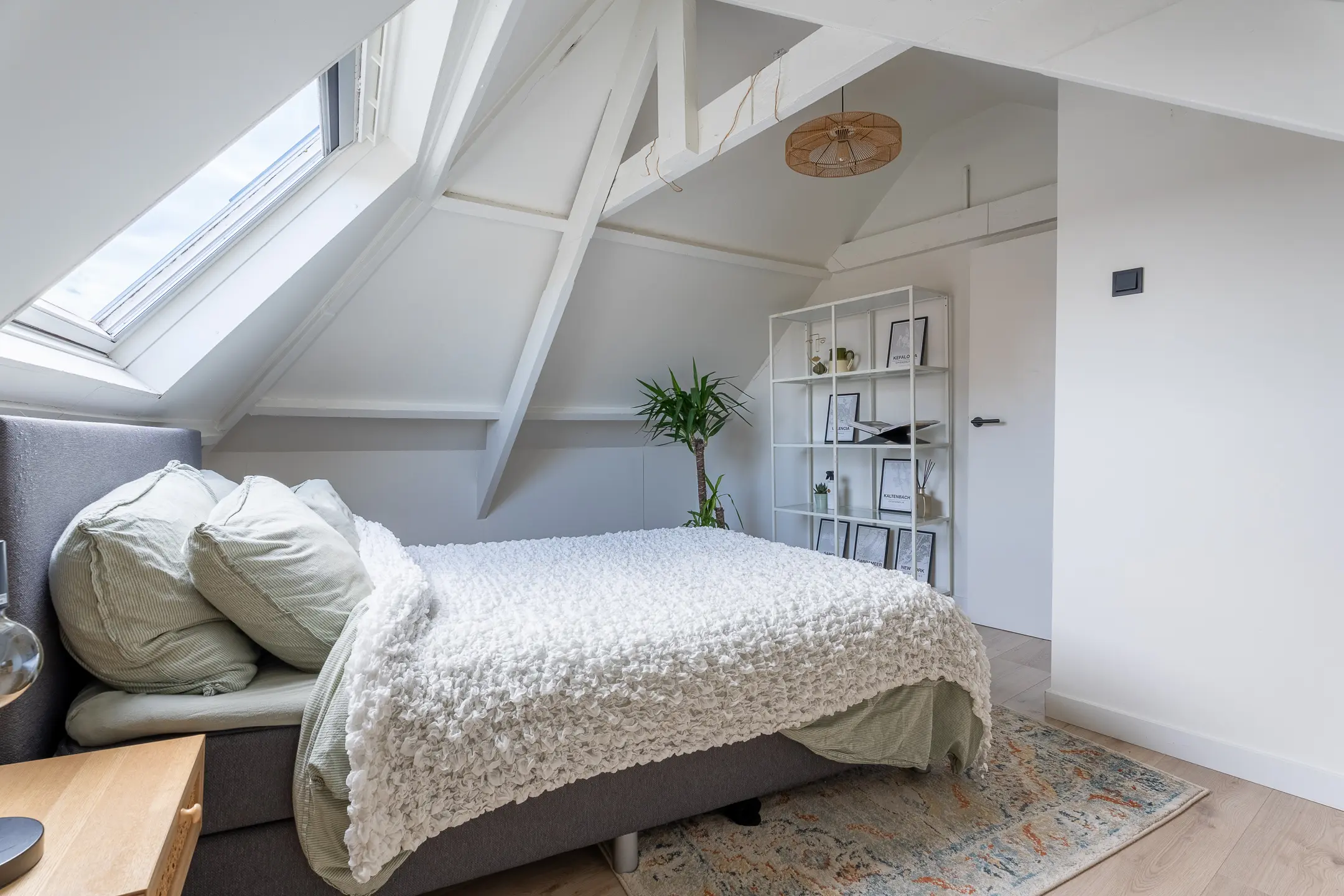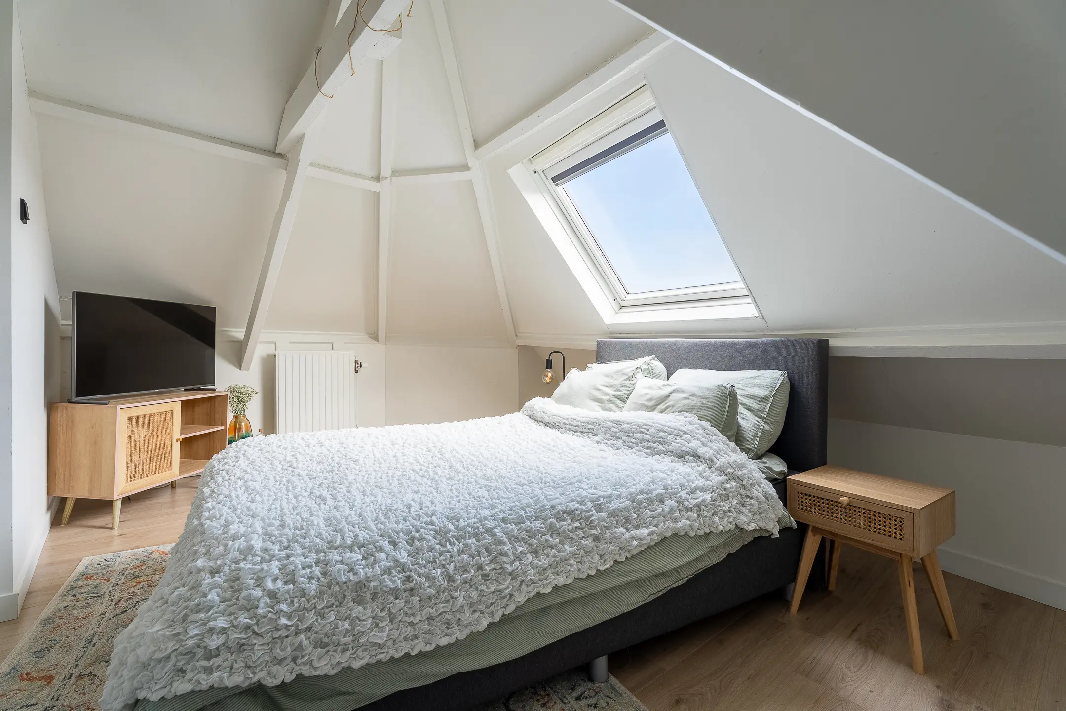 Via een vaste trap bereik je de sfeervolle zolderkamer. Deze verrassend ruime slaapkamer is volledig geïsoleerd en voorzien van een Velux dakraam, wat zorgt voor veel lichtinval en een aangename sfeer.