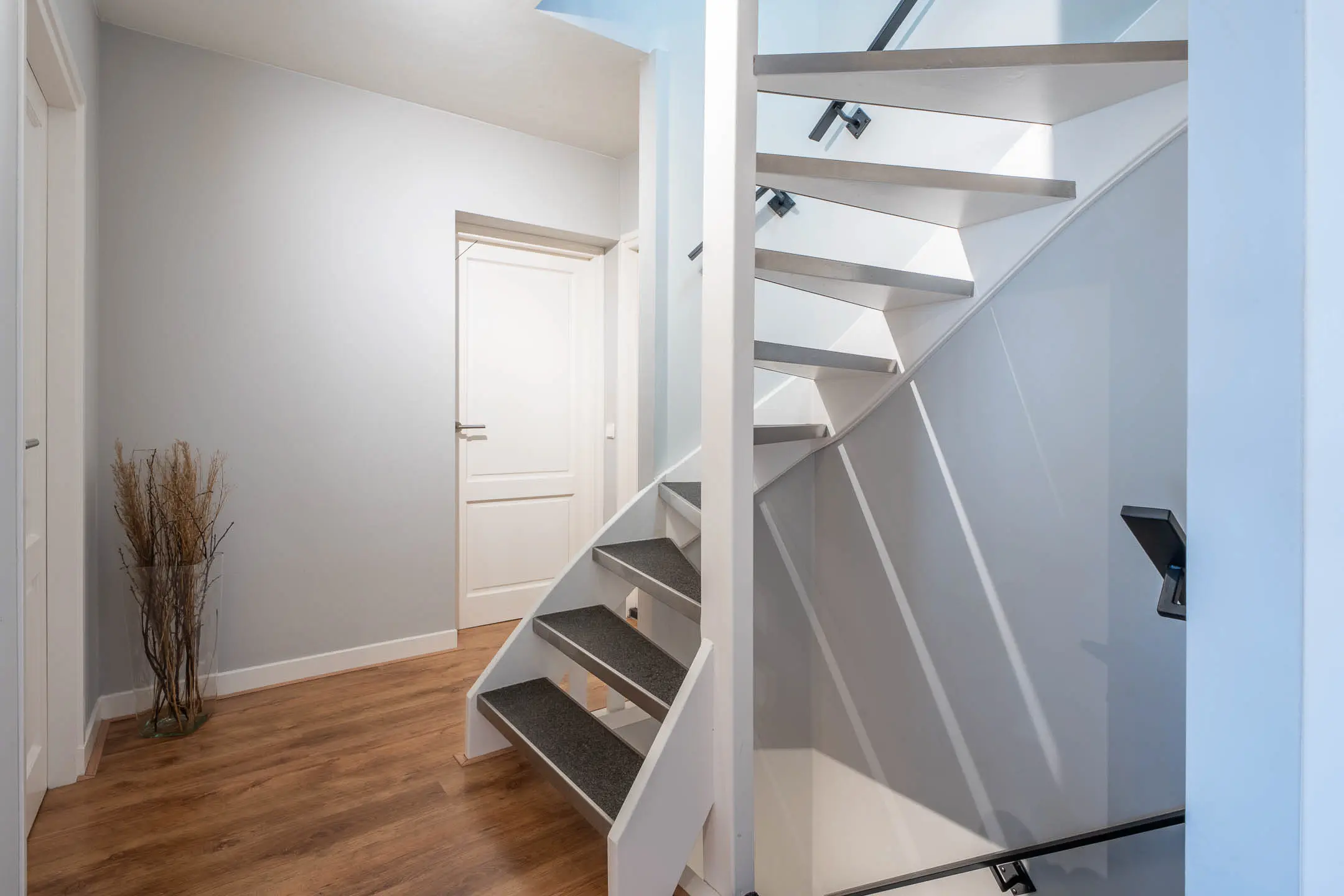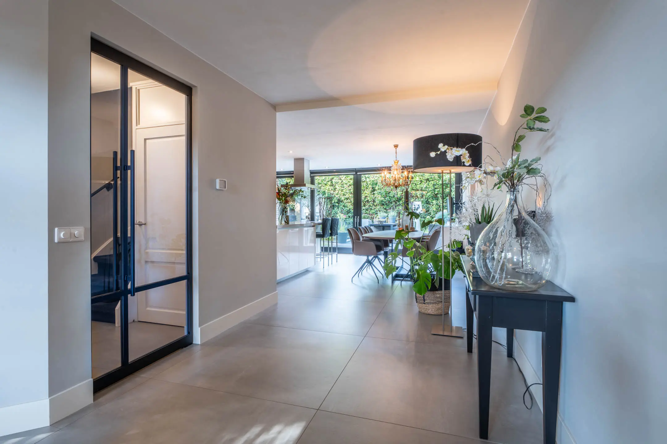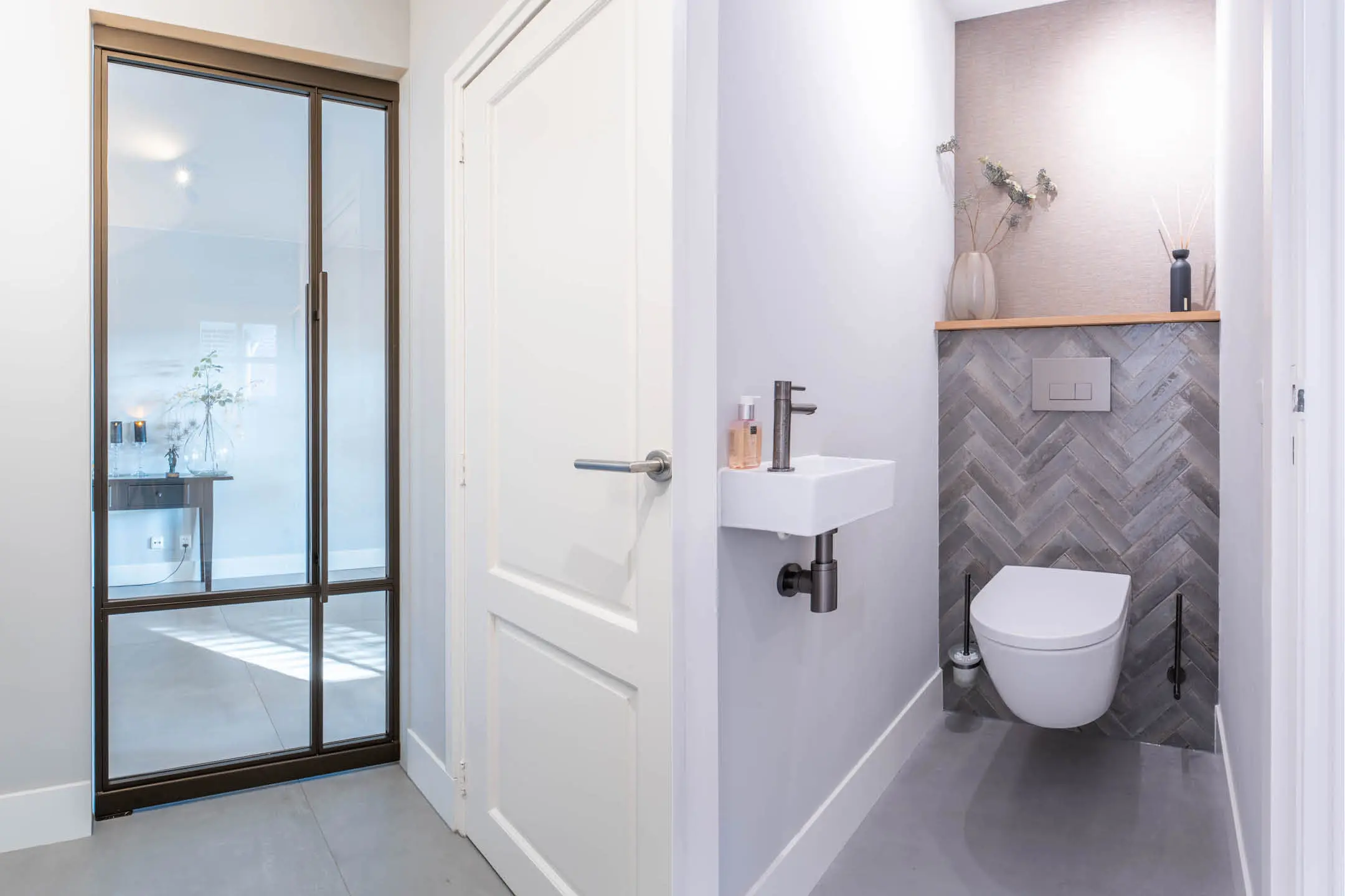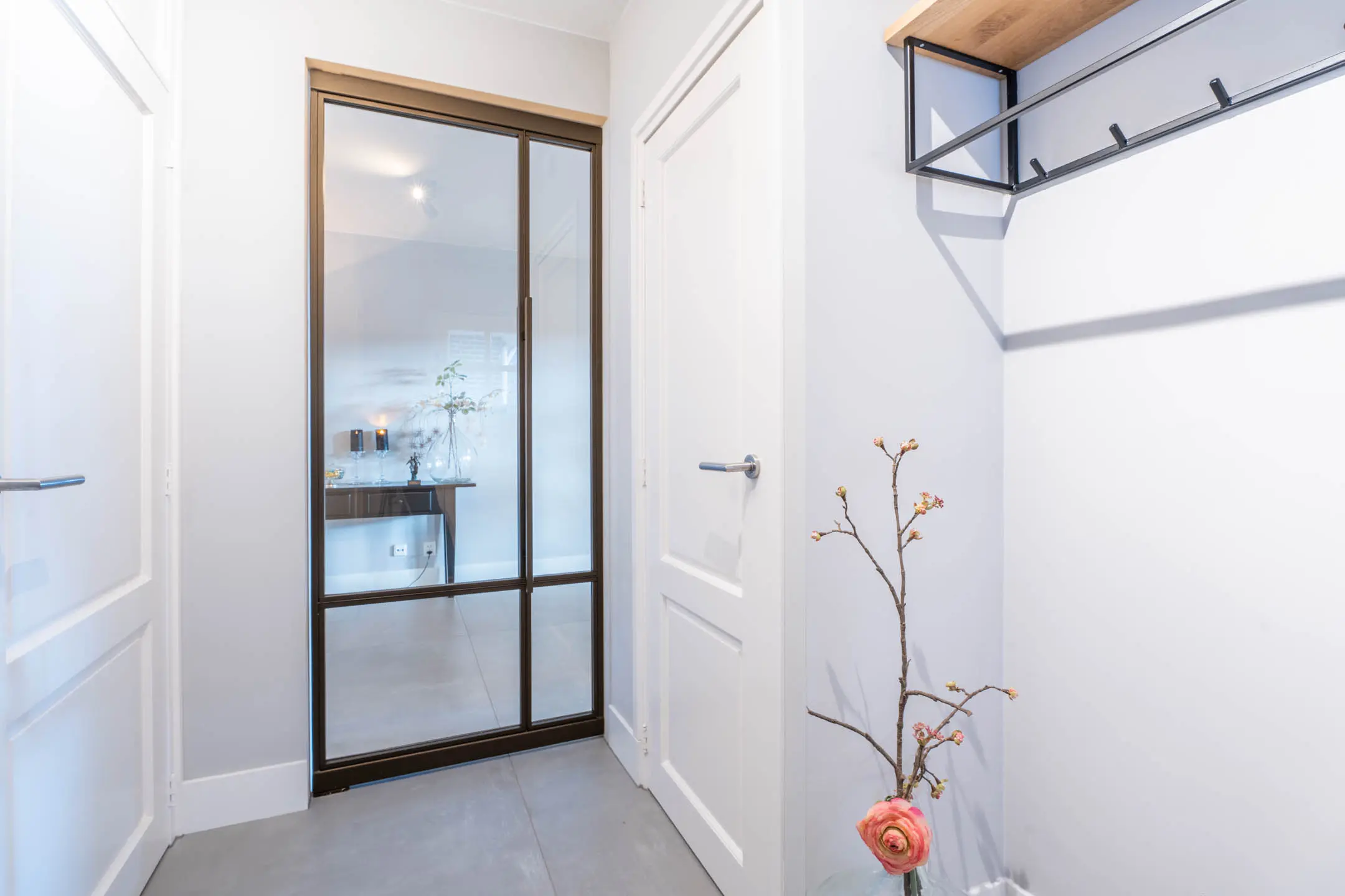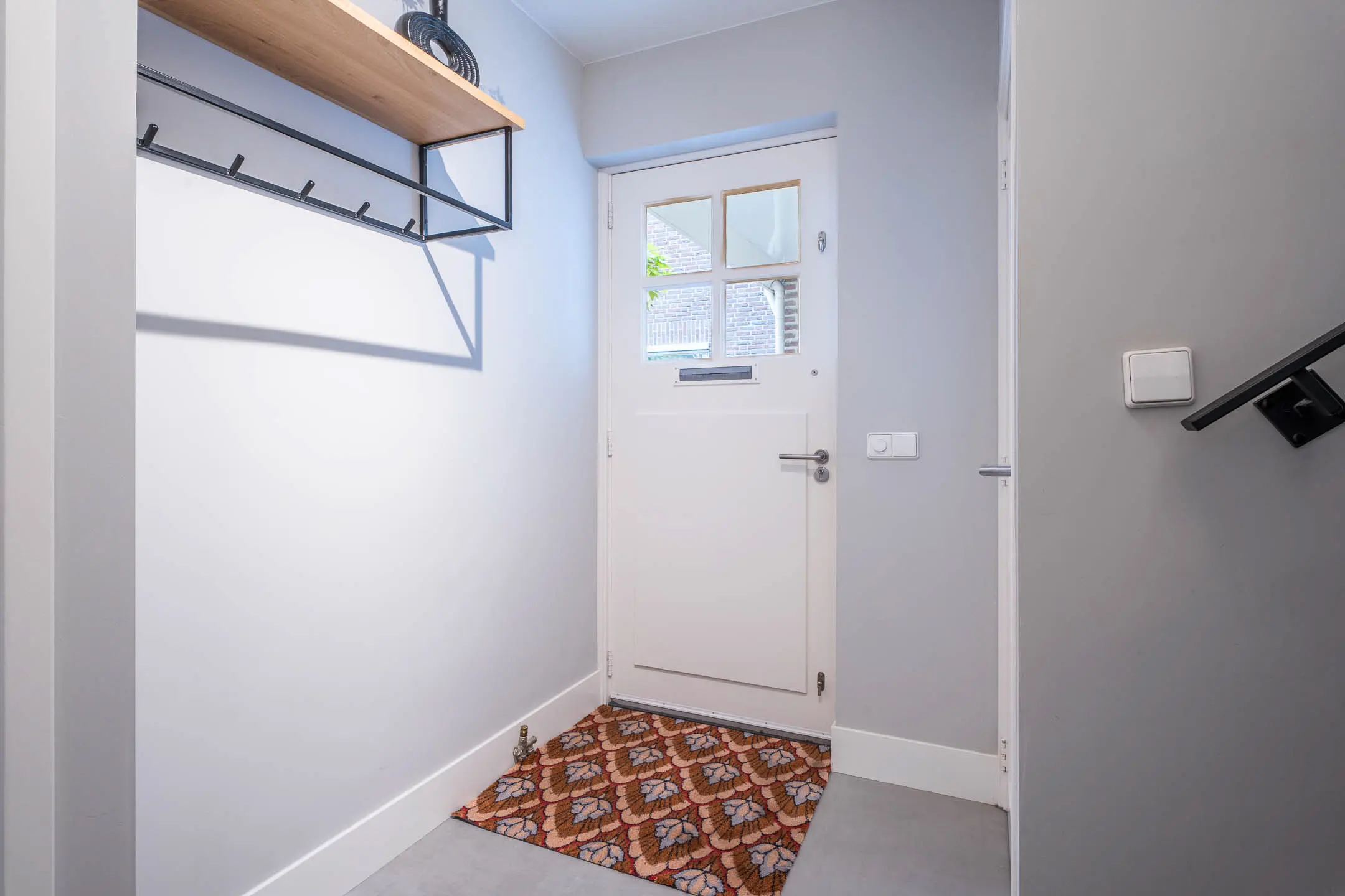 Hal, entree met garderobe, meterkast, trapkast, toilet, trapopgang en toegang tot de woonkamer. De strakke entree, het 'hotel chique' gerenoveerd toilet (2024) en de zwart stalen taatsdeur laten je kennismaken met de sfeer en comfort, die de begane grond je gaat bieden.