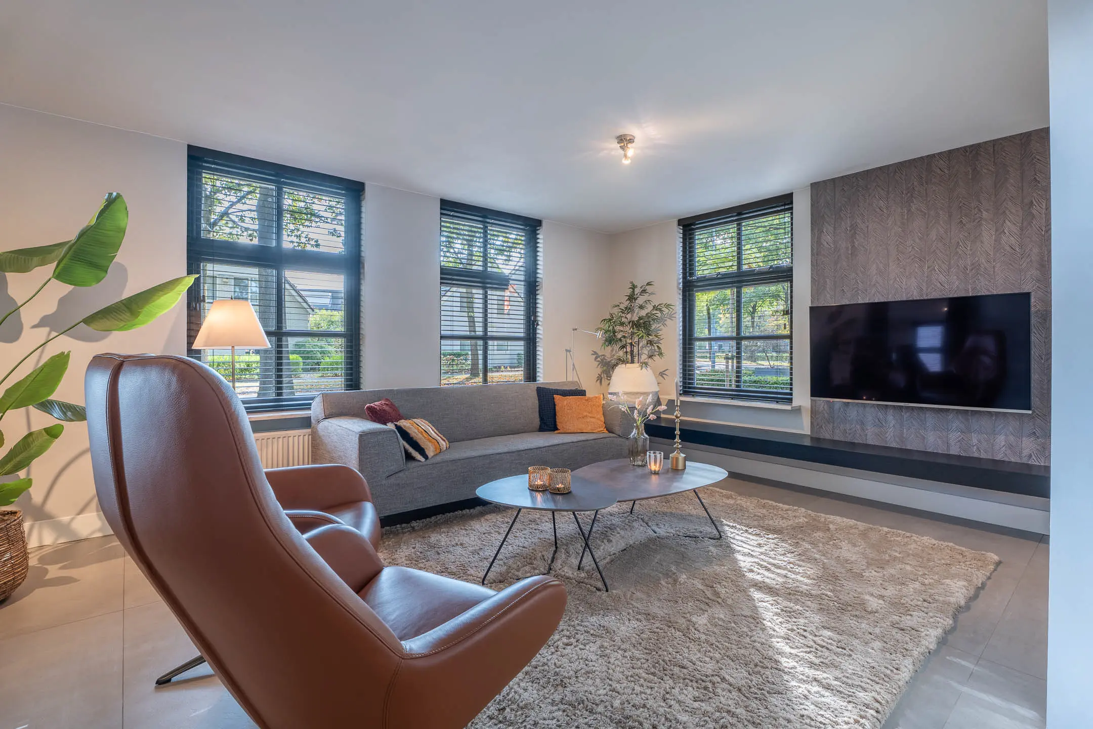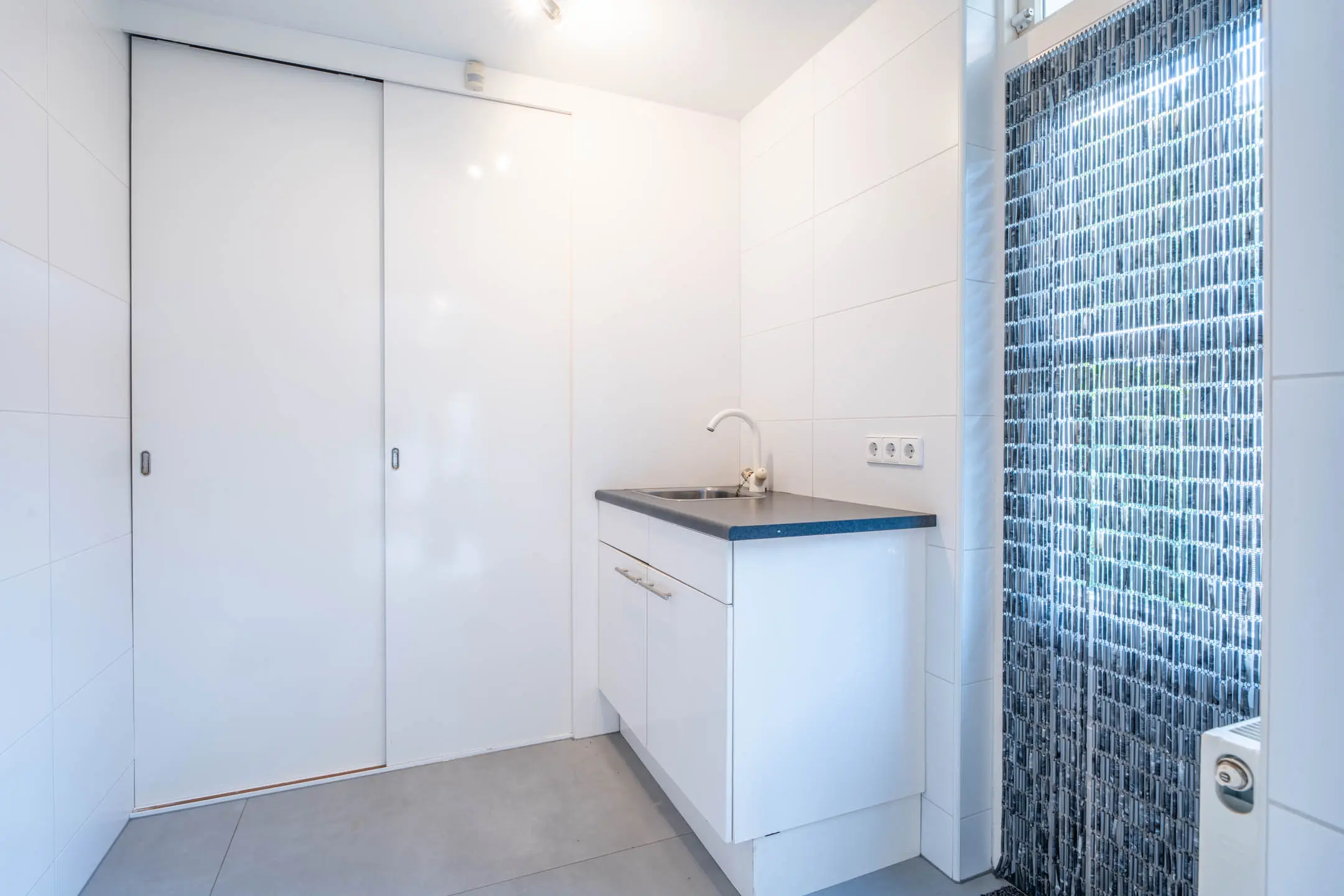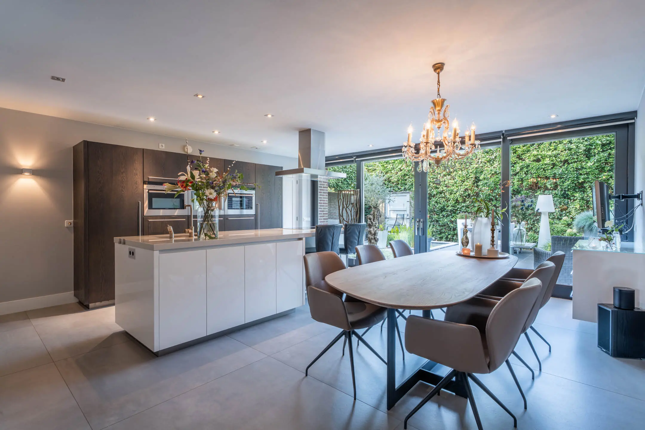 De ruime en lichte woonkamer is aan de achterzijde uitgebouwd (2008), waardoor een echte living (woonkamer en keuken) is ontstaan van ruim 57m²! De woonkeuken met zijn maatwerkkasten vind je aan de achterkant. De op maat gemaakte tv-zitkamer is aan de voorzijde ingedeeld. In 2024 is de woning vernieuwd en gemoderniseerd met o.a. vloertegels van 120x120 (inclusief vloerverwarming) een stalen taatsdeur en prachtig glad gestukadoorde wand- en plafondafwerkingen. Ook zijn de wanden, deuren en kozijnen geschilderd, dit zijn slechts enkele kenmerken. De grote schuifpui aan de achterzijde betrekt de tuin en de keuken met elkaar. De keuken is compleet en aan het grote spoelkookeiland kun je heerlijk koken en sta je in contact met vrienden en familie te borrelen aan de eetkamertafel. Volwaardige keuken met veel kast- en bergruimte, als ook alle benodigde inbouwapparatuur; Quooker, inductie koken, koffiemachine, combi-magnetronoven, combi-stoomoven, vaatwasmachine en koelkast. Aansluitend aan de keuken is de bijkeuken en doorloop naar de garage. De bijkeuken heeft een grote kastenwand en een klein keukenblok met een (nieuwe) close in boiler. Zowel de bijkeuken als de (verwarmde) garage zijn voorzien van een tegelvloer.