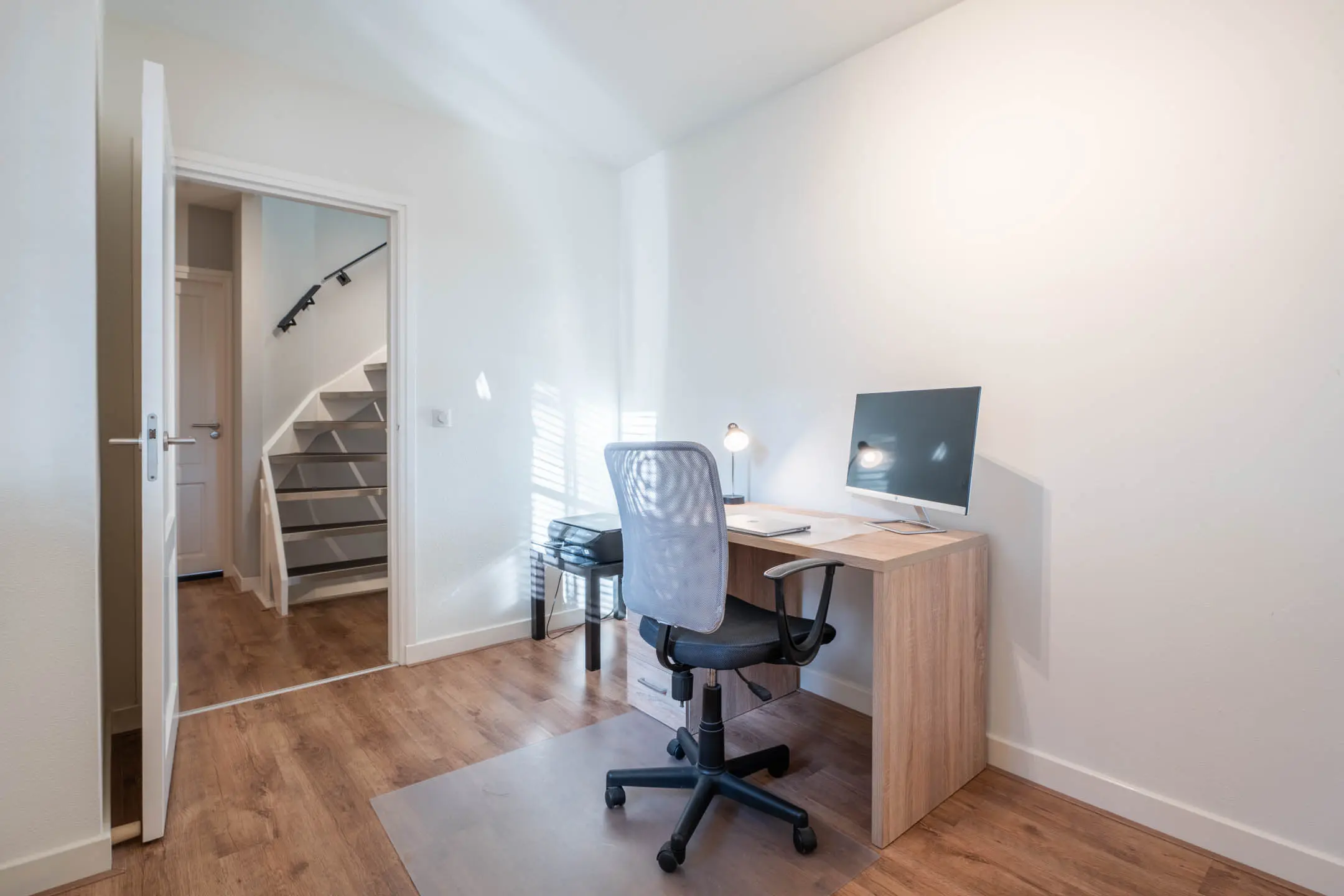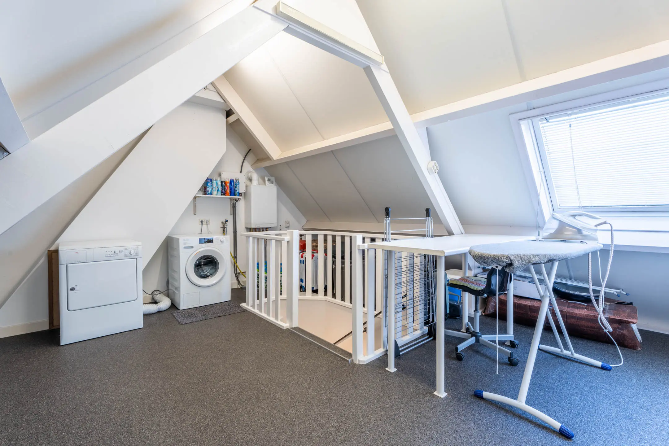 Royale verdieping met aansluitingen voor de wasmachine, droger, opstelling cv-ketel en grote vaste kastenwand. Volledig afgewerkte verdieping in een lichte kleur met korreltapijt en de mogelijkheid voor het maken van een 5e (slaap)kamer.