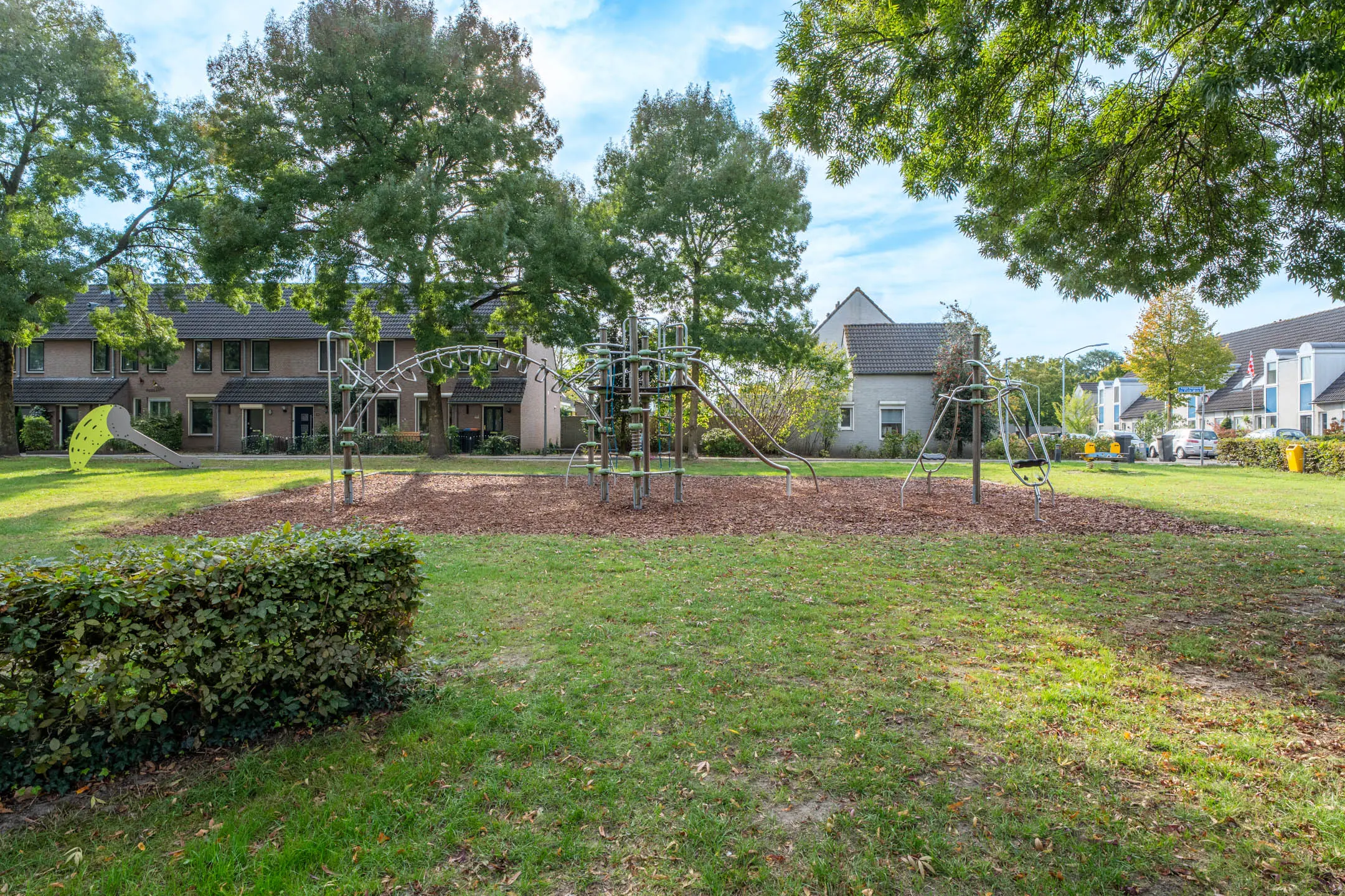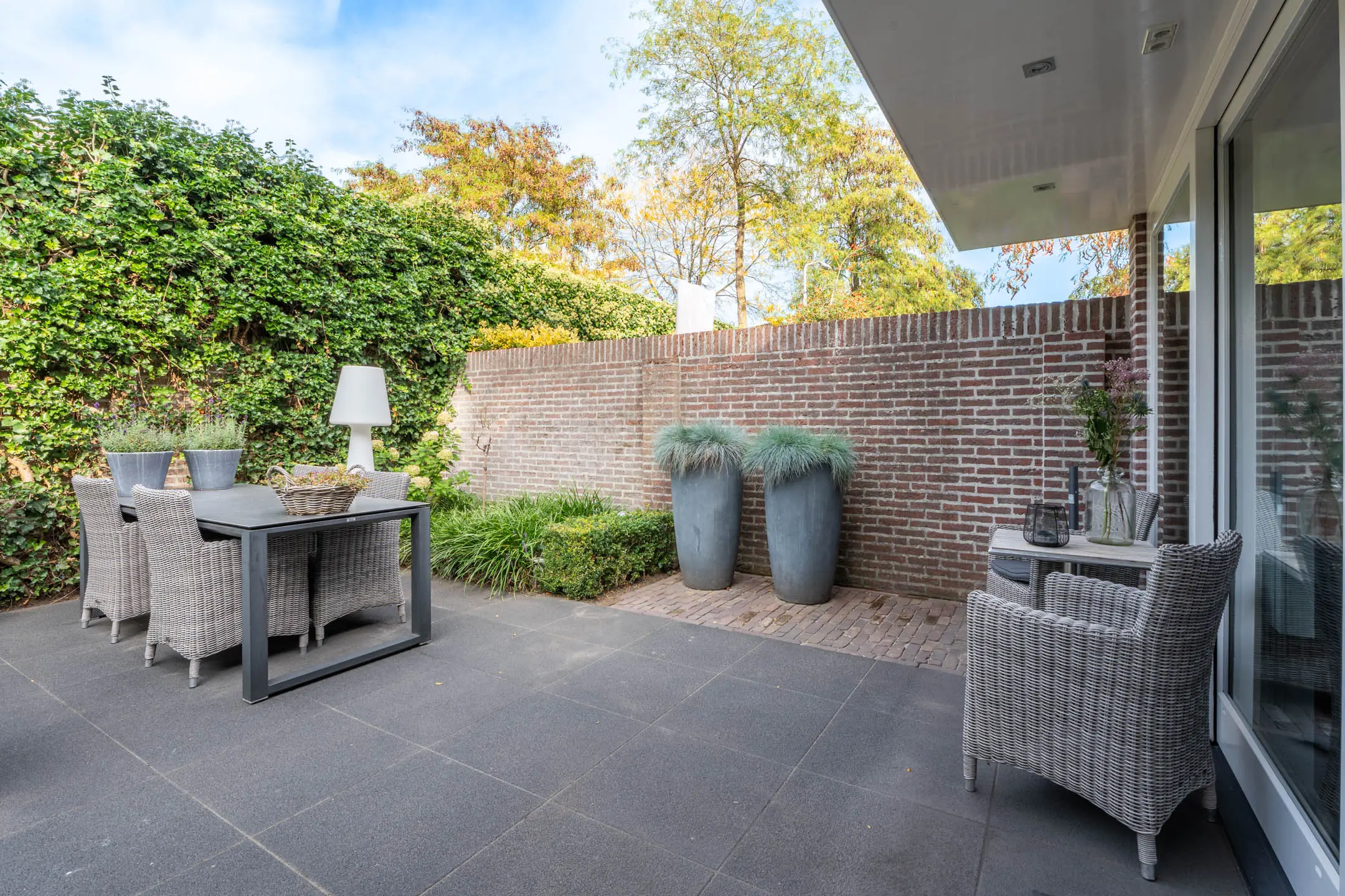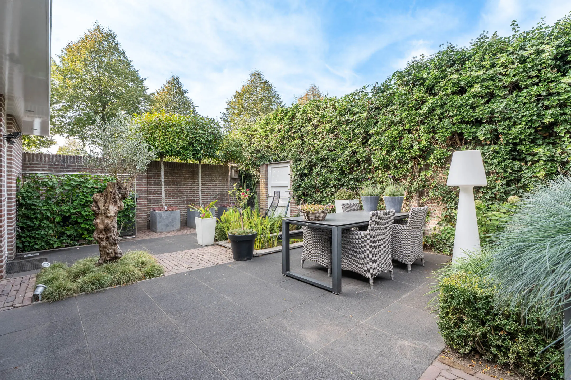 De achtertuin is in 2010 door een tuinarchitect aangelegd en uitgevoerd met groot terras, vijver, borders, beplanting en klinker straatwerk, in combinatie met grote grijze tegels, waardoor binnen en buiten een geheel worden. Volledig omheind met, een gemetselde schutting, veel groen, poort en achterom, dat veel privacy biedt in de tuin.