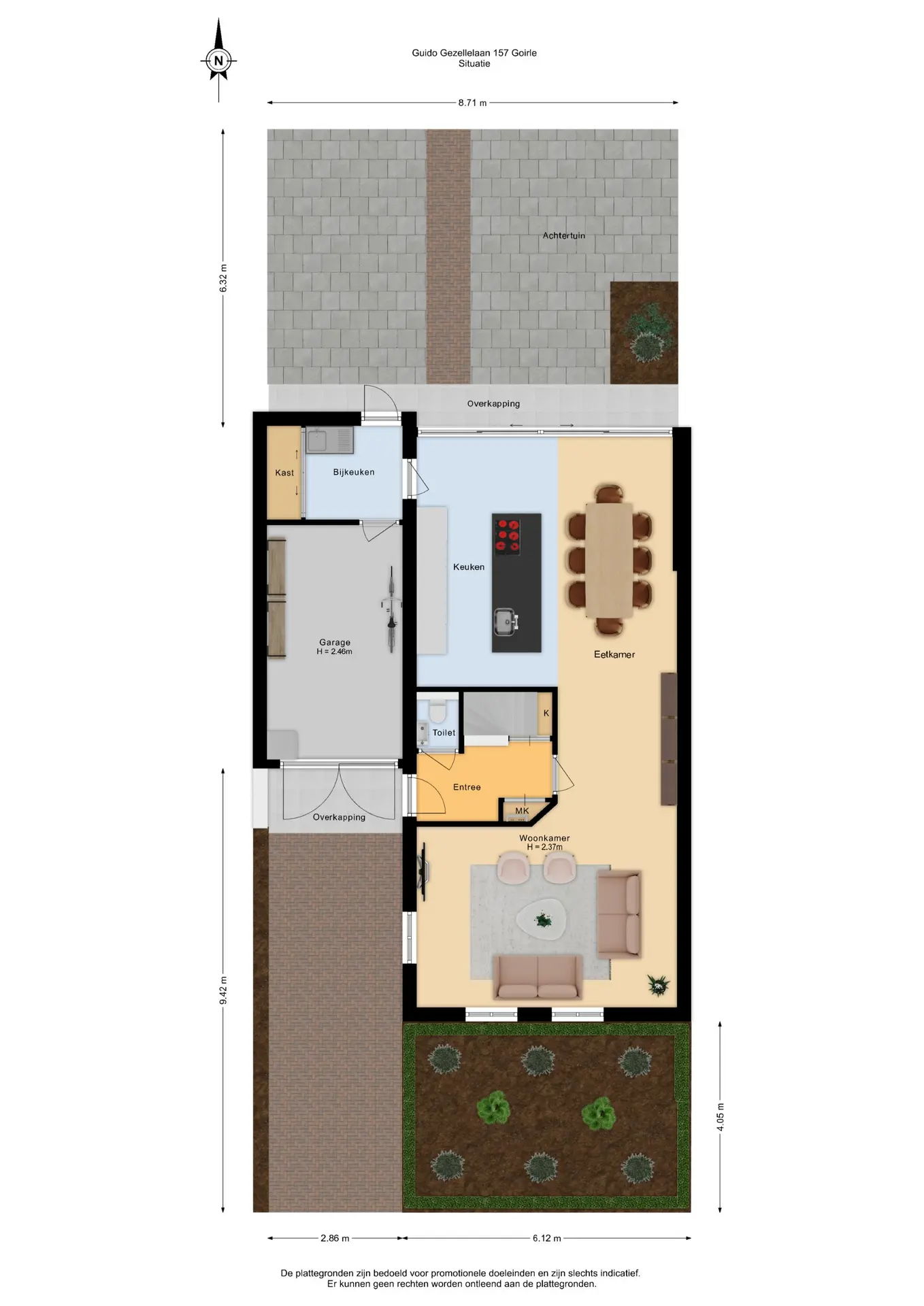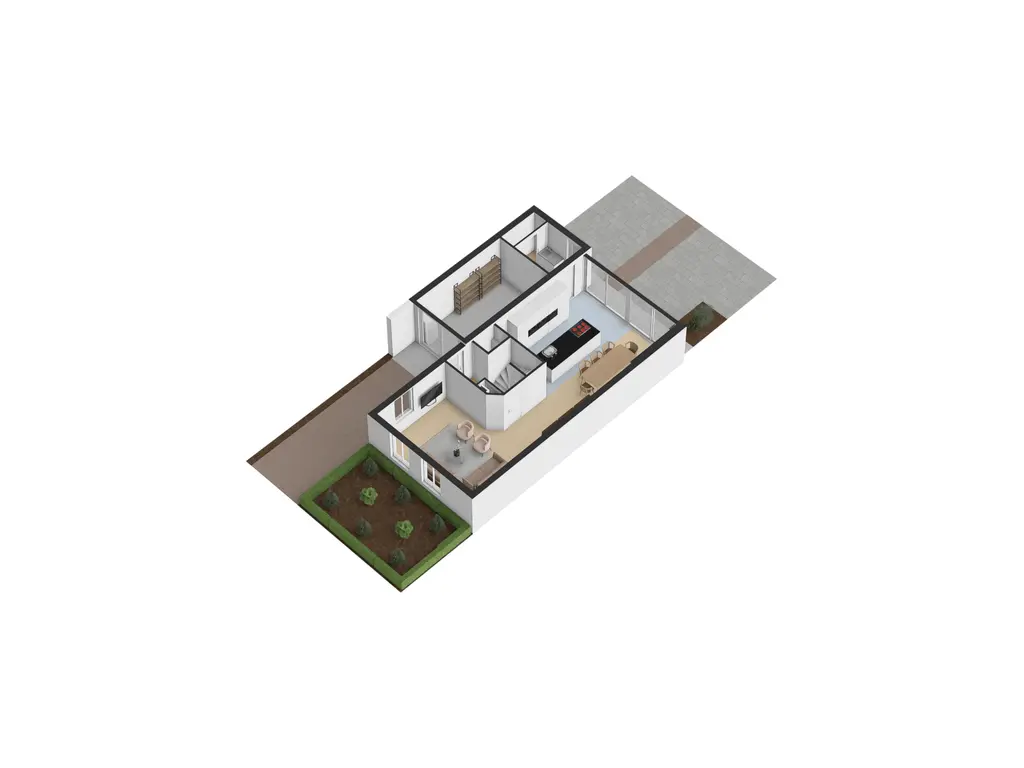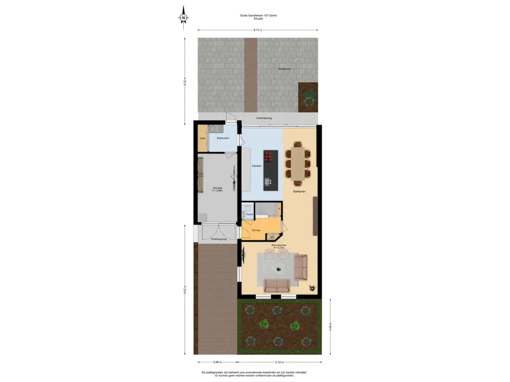 De achtertuin is in 2010 door een tuinarchitect aangelegd en uitgevoerd met groot terras, vijver, borders, beplanting en klinker straatwerk, in combinatie met grote grijze tegels, waardoor binnen en buiten een geheel worden. Volledig omheind met, een gemetselde schutting, veel groen, poort en achterom, dat veel privacy biedt in de tuin.