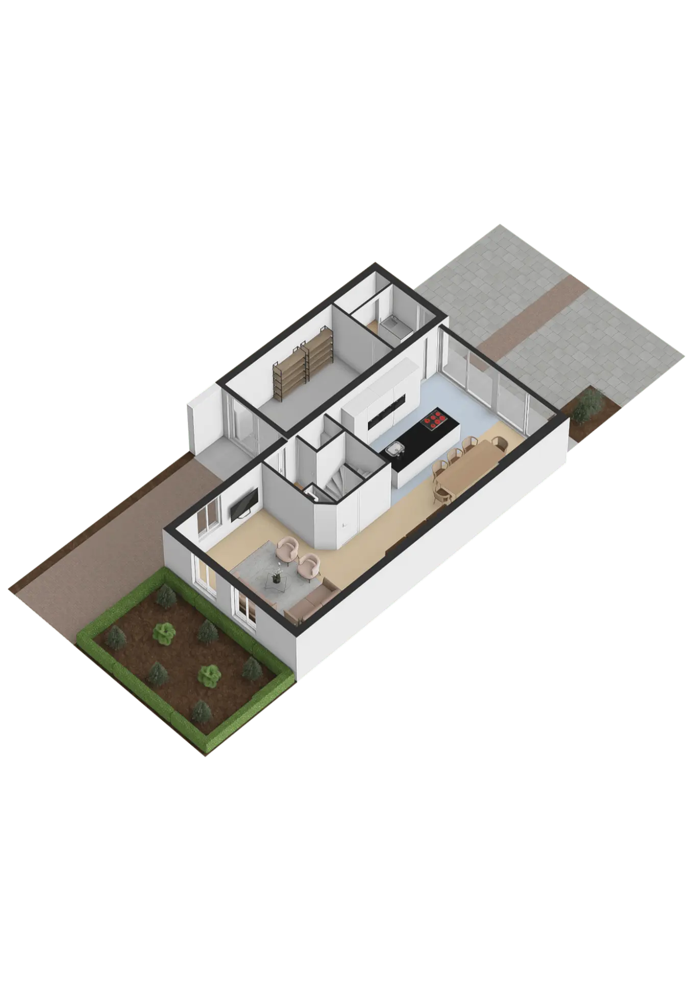 Ruime voortuin met oprit en toegang tot de garage en de voordeur (gedeeltelijk overdekt). De oprit biedt ruim plaats aan een tweetal auto’s.