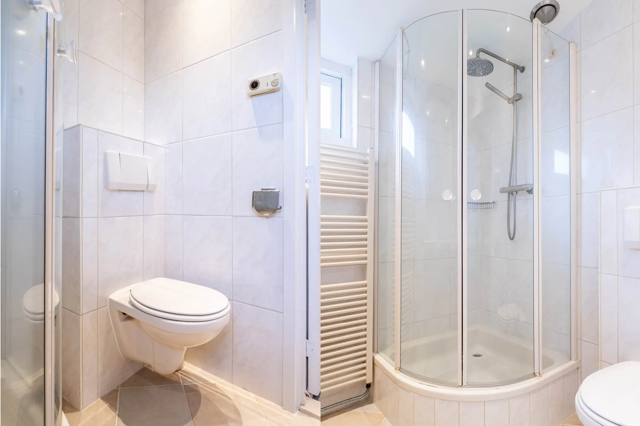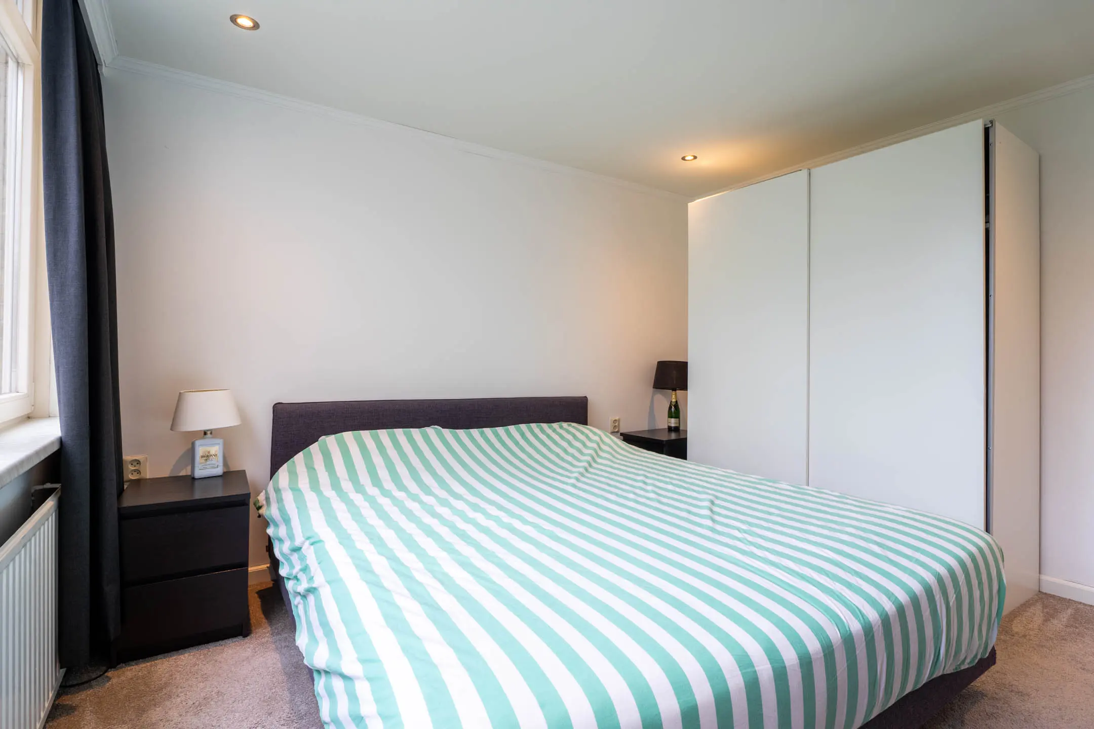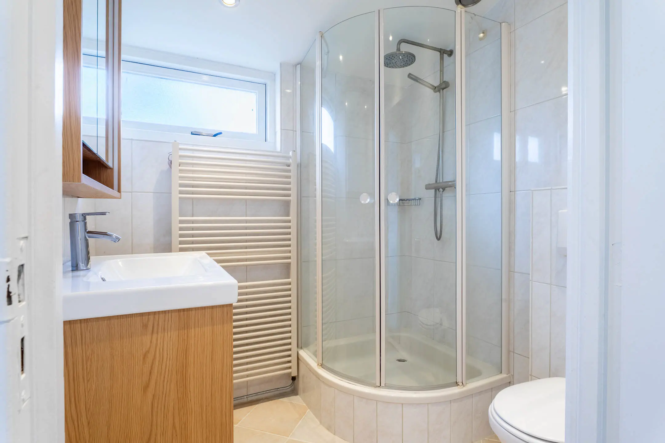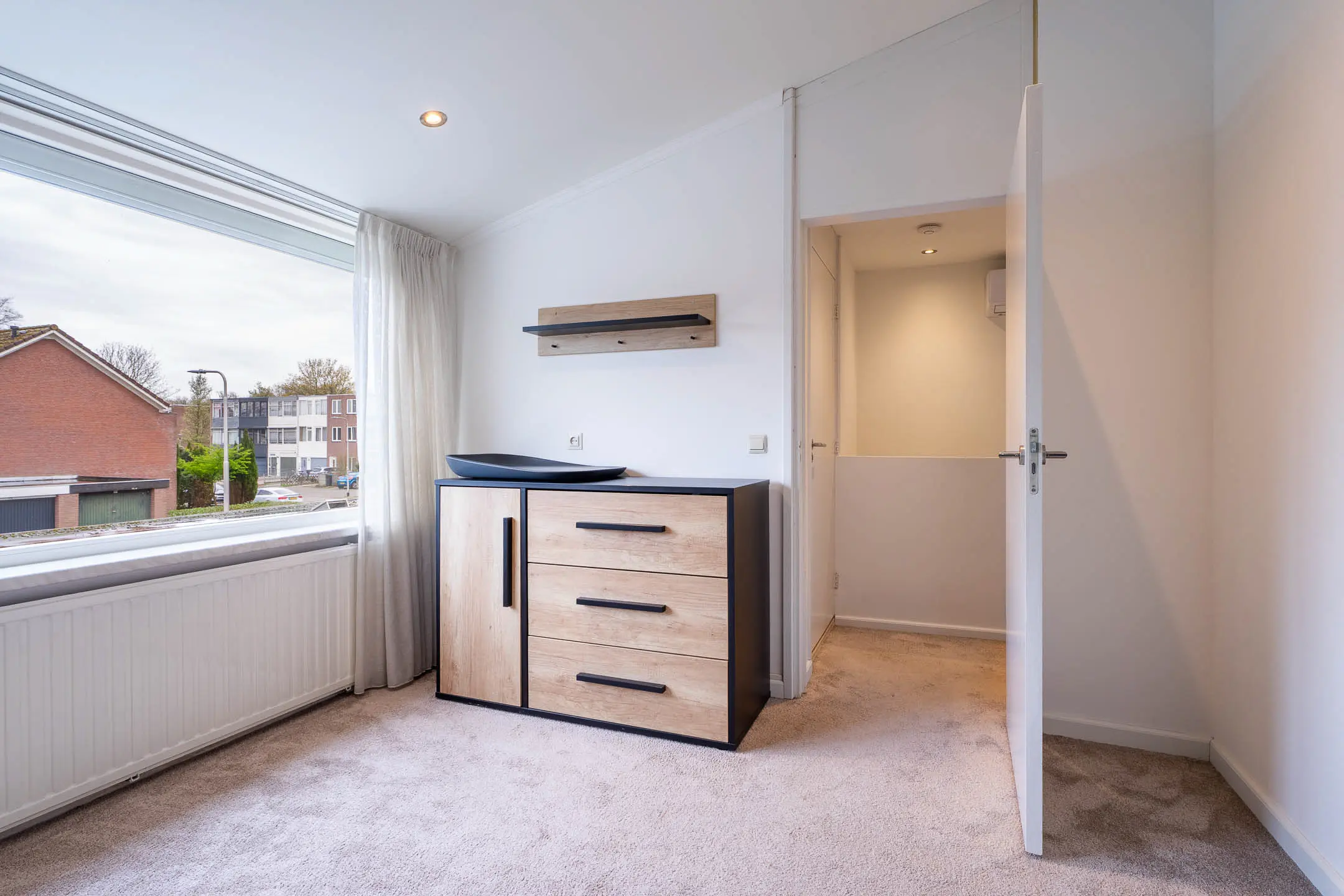 De badkamer is volledig betegeld en comfortabel ingericht met een wastafelmeubel, een zwevend toilet, een douchecabine en een designradiator. Extra luxe is de aanwezige elektrische vloerverwarming. De slaapkamer aan de voorzijde beschikt bovendien over een elektrisch rolluik.