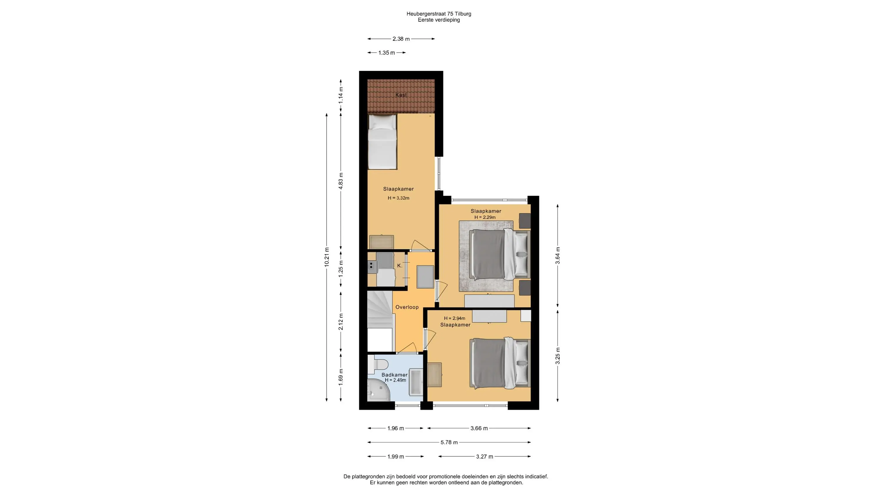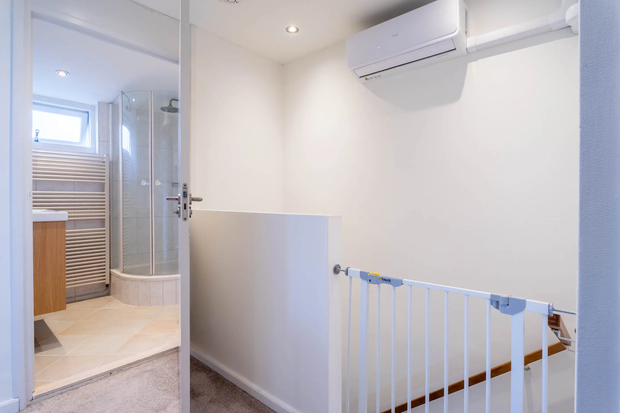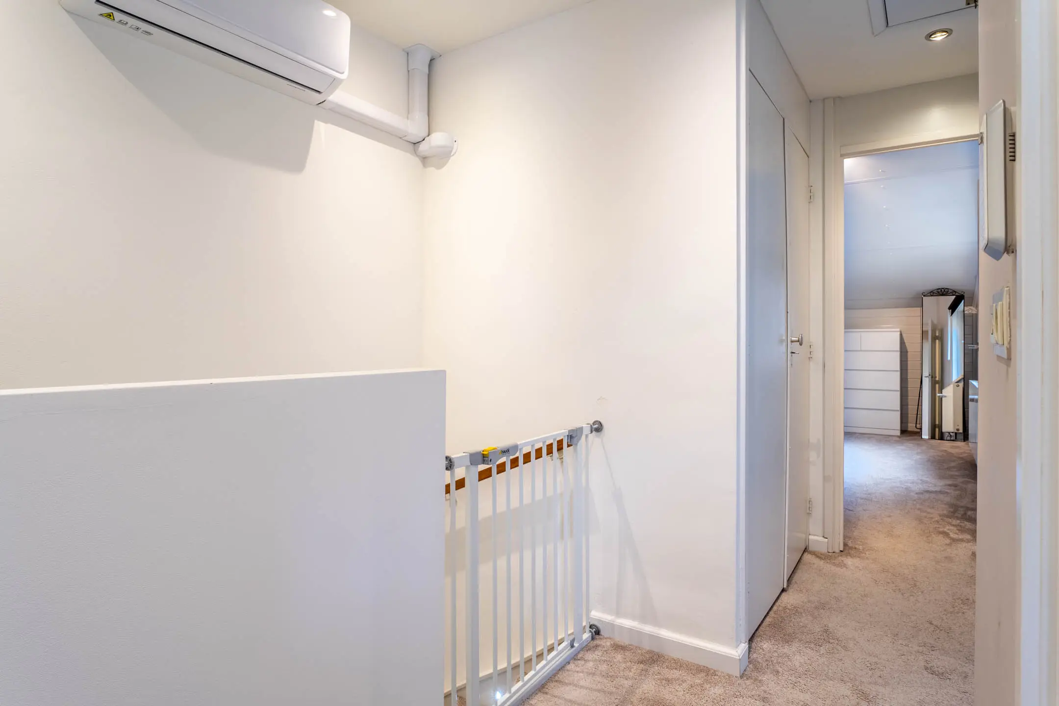 De overloop, voorzien van airconditioning, geeft toegang tot drie ruime slaapkamers, een technische ruimte en de badkamer. De slaapkamers en overloop zijn strak afgewerkt met stucwerk wanden en plafonds, wat zorgt voor een moderne uitstraling.