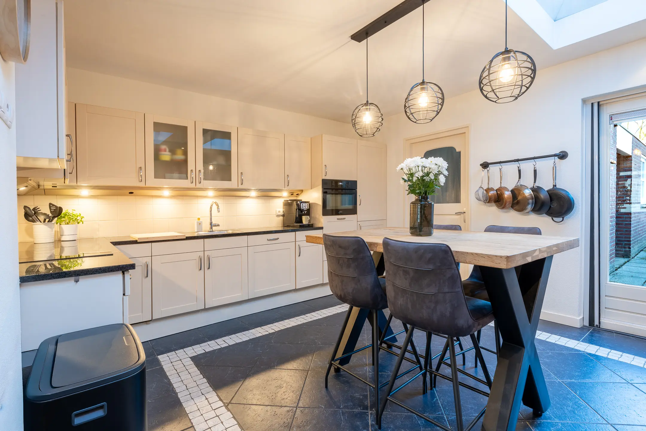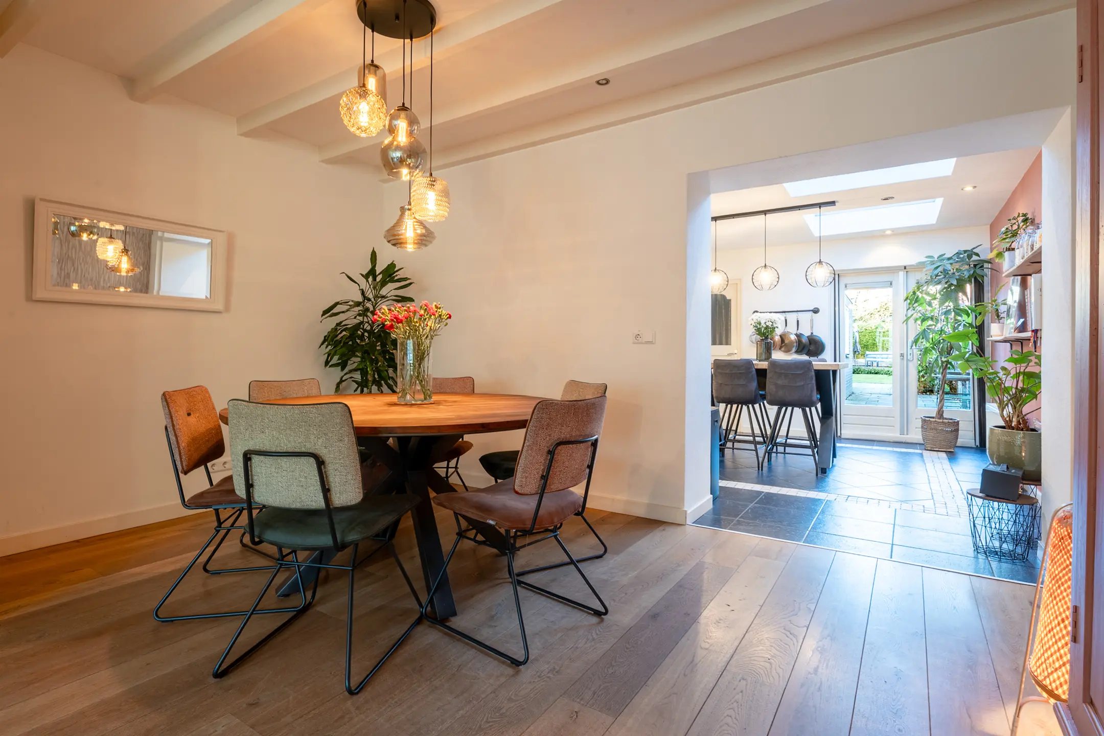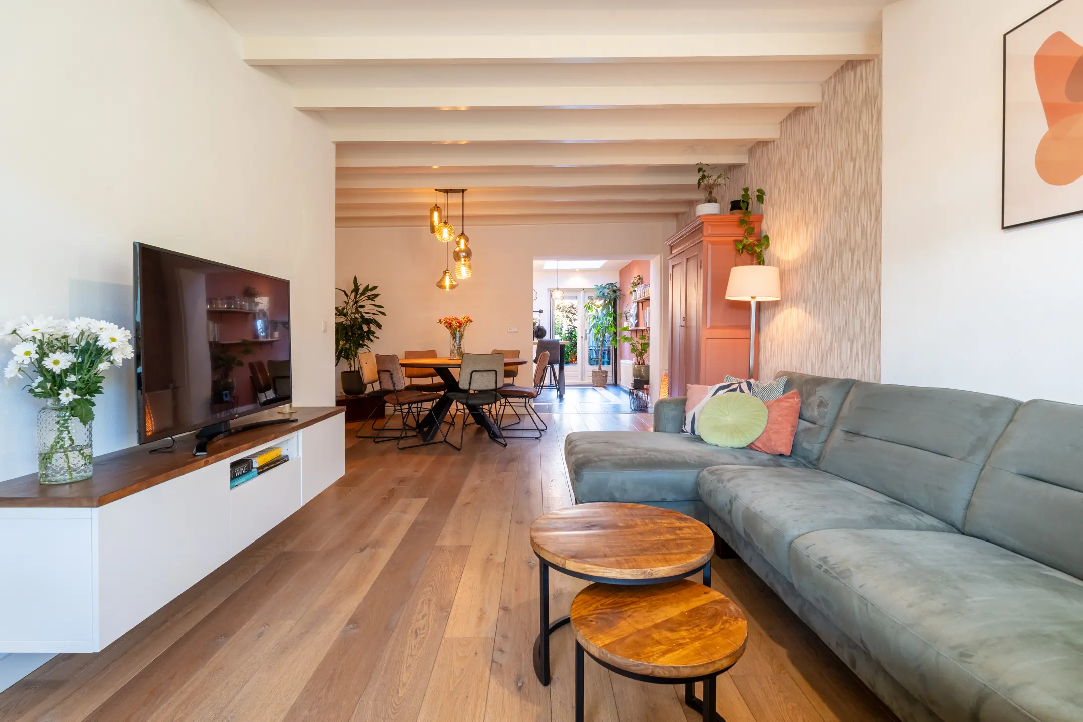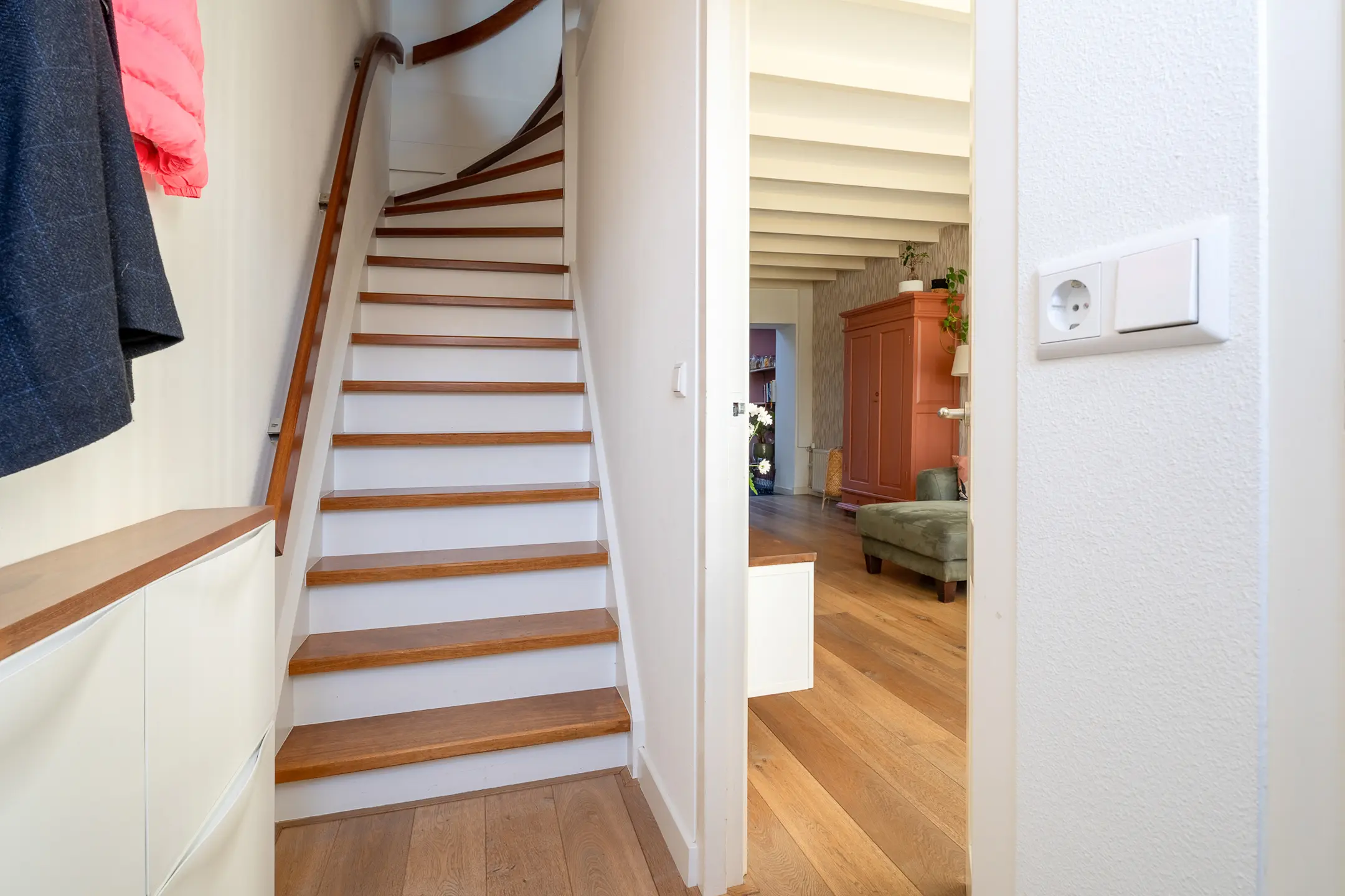 Entree met hal, trapopgang en toegang tot de woonkamer. De woonkamer is behaaglijk en sfeervol, ingesloten tussen het licht van de voorgevel en de woonkeuken met tuindeuren en lichtkoepels aan de achterzijde. Een rustige plek om ’s avonds lekker tv te kijken of aan tafel te dineren met familie en vrienden. De fraaie houten vloer en het sfeervolle balkenplafond maken het geheel compleet. De woonkeuken ligt aan de achterzijde en is tuingericht: een lichte, vriendelijke ruimte met tegelvloer, stucwerk en een complete, ruime hoekkeuken. De keuken is van alle gemakken voorzien: veel werkblad (natuursteen), volop kastruimte en inbouwapparatuur, zoals inductiekookplaat, afzuigkap, vaatwasser, koelkast, vriezer en combi-oven. Aansluitend tref je de bijkeuken met opstelling voor wasmachine en droger en doorloop naar de achtertuin of de eerste badkamer. De badkamer is volledig betegeld en voorzien van een ligbad-douchecombinatie, wastafel met meubel en toilet.